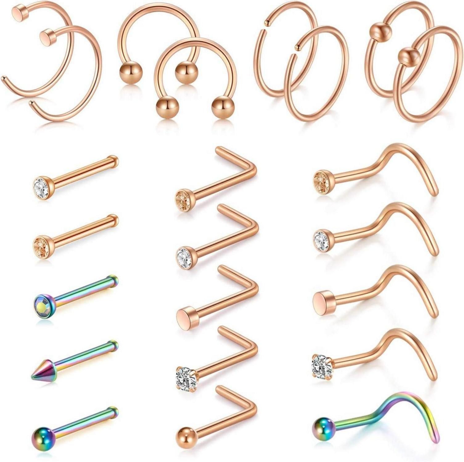 Nasenring oder Nasenstecker? Warum entscheiden, wenn du beides haben kannst! Mit dem D.Bella Nasenring Set erhältst du insgesamt 23 Stück hochwertige Piercings, die nicht nur für die Nase, sondern auch für andere Körperstellen geeignet sind. Die Materialqualität aus 316L Chirurgenstahl sorgt für Langlebigkeit und Komfort, während die Vielfalt an Styles und Farben es dir ermöglicht, deinen Look nach Belieben anzupassen. Ob du dich für einen dezenten Nasenstecker in Rosegold entscheidest oder lieber mit einem auffälligen Hoop Nasenring in Regenbogenfarben experimentierst – dieses Set bietet für jeden Anlass die passende Option.