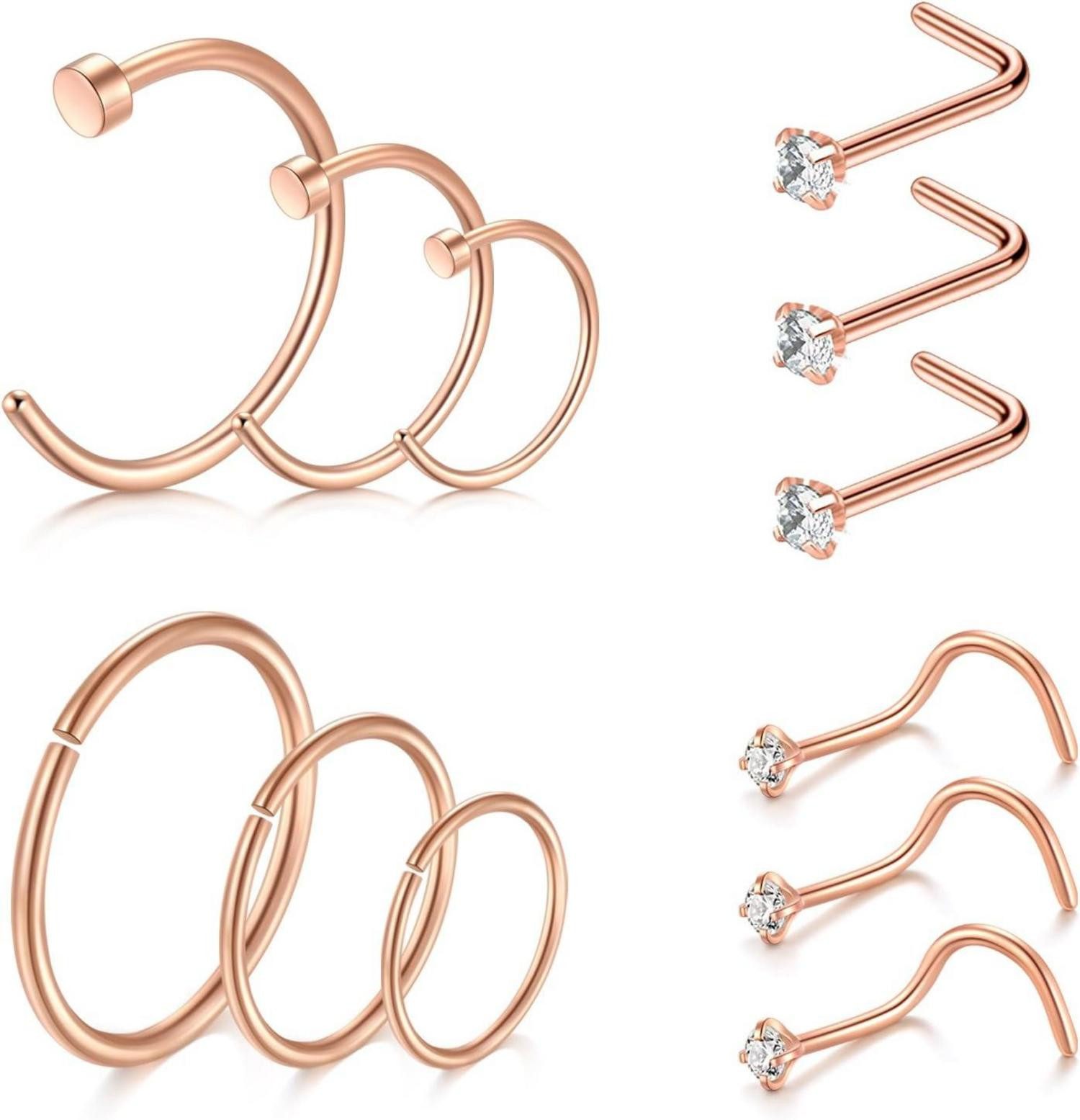 Dank des Designs in Rosegold sind diese Schmuckstücke elegant und zeitgemäß, perfekt für den täglichen Gebrauch oder besondere Anlässe. Mit insgesamt 12 Stücken, darunter C-Form Nasenringe, Nasenringe, L-Form Nasenstecker und Spirale Nase Stecker, bietet dieses Set eine Vielzahl von Optionen, um deinen Look zu individualisieren.