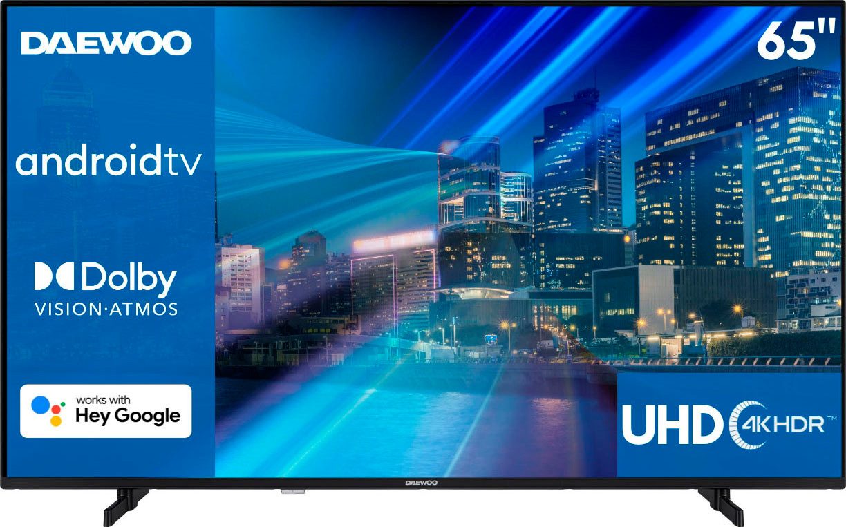 Dieser LED-Fernseher ist von Daewoo. In sehr hoher Qualität werden Filme auf dem 65 Zoll (164 cm) großen 4K Ultra HD-Bildschirm dargestellt. Mach aus deinem Wohnzimmer einen kleinen Filmpalast und tauch mitten ins Geschehen ein. Mit DVB-S, DVB-T und DVB-C empfängst du eine große Anzahl internationaler Sender sowie deine Lieblingssender per Kabel. Das Übertragen von Fotos und Abspielen von Musik direkt vom mobilen Gerät auf den Fernseher wird durch nützliche Multimediafunktionen möglich. Blu-ray-Player oder Spielekonsolen kannst du ohne Probleme mit dem Modell verbinden. Wünschst du dir einen TV, der das Kino zu dir nach Hause bringt und ein umfangreiches Multimedia-Angebot mit an Bord hat, so solltest du den Daewoo-TV in die engere Wahl ziehen.