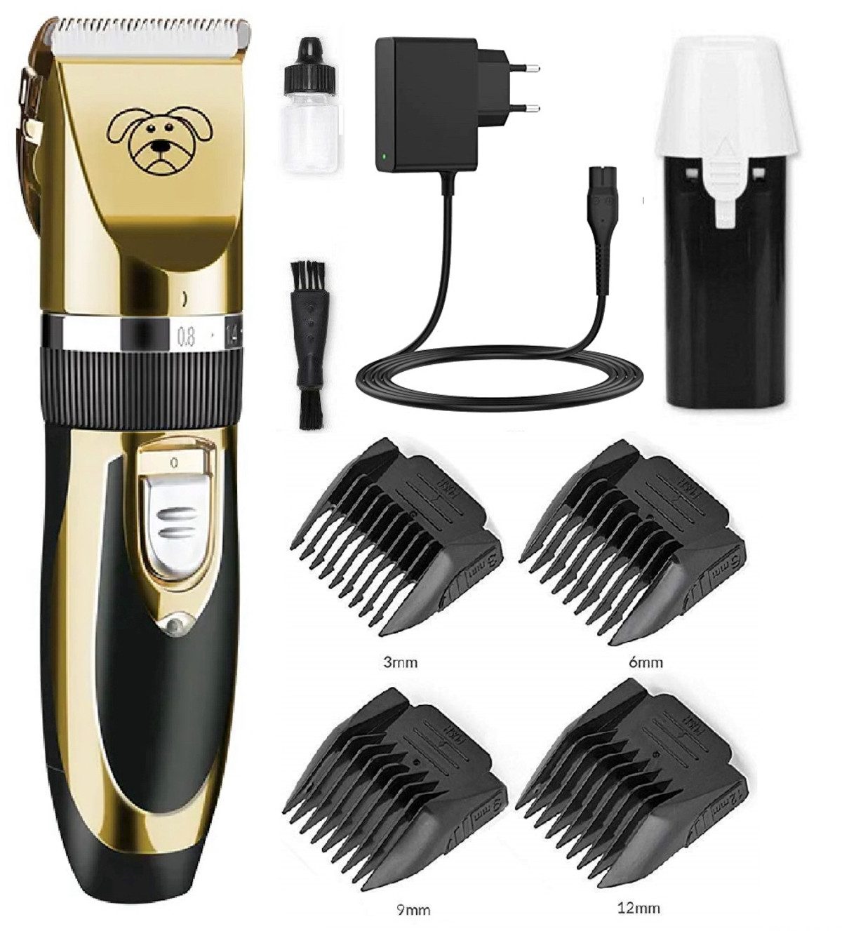 Lieferumfang | 1x Schermaschine, Reinigungsbürste, Ölflasche, Akku, Netzteil, Transportkoffer, 4x Aufsätze |