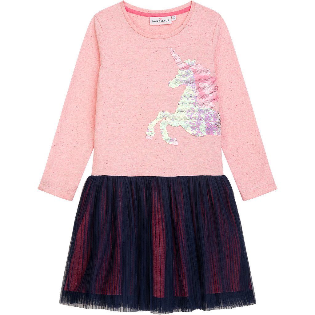 DANAMADE Mädchenkleid „Dkalea“ mit Pailletten-Einhorn – Langarmkleid mit Tüllrock. Mit dem Mädchenkleid „Dkalea“ von DANAMADE wird jeder Tag zum Märchentag! Dieses zauberhafte Langarmkleid kombiniert ein weiches, rosafarbenes Baumwolltop mit einem eleganten navyblauen Tüllrock – ein echter Hingucker. Das Highlight ist das liebevoll gestaltete Pailletten-Einhorn, das sich über Vorder- und Rückseite zieht und im Licht wunderschön schimmert. Dank des bequemen Schnitts und hochwertigen Materials ist das Kleid nicht nur hübsch, sondern auch alltagstauglich. Ob auf Geburtstagsfeiern, in der Schule oder einfach beim Spielen – „Dkalea“ ist immer die richtige Wahl. In den Größen 104 bis 134 erhältlich, passt dieses Kleid perfekt zu modebewussten Mädchen, die von Einhörnern träumen. Vorder- und Rückseite mit Wendepailletten-Einhorn Oberteil: 100 % Baumwolle – hautfreundlich Tüllrock: 100 % Polyester – formstabil und elegant Lining (Futter): 100 % Polyester