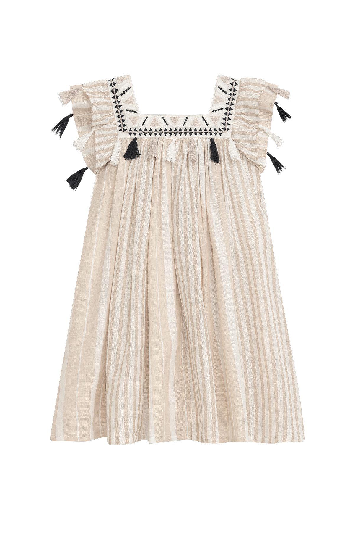 Dieses luftige Boho-Hängerchen vereint natürliche Eleganz mit verspielten Details. Die creme-beige Streifenoptik verleiht dem Kleid einen angesagten Leinen-Look, während es dank der weichen Baumwolle angenehm auf der Haut liegt. Die bestickte Passe und die feinen Quasten setzen stilvolle Akzente und machen das Kleid zum perfekten Begleiter für entspannte Sommertage. Und das Beste: Diesen Look gibt es auch für Mama – für wunderschöne Matching-Outfits!