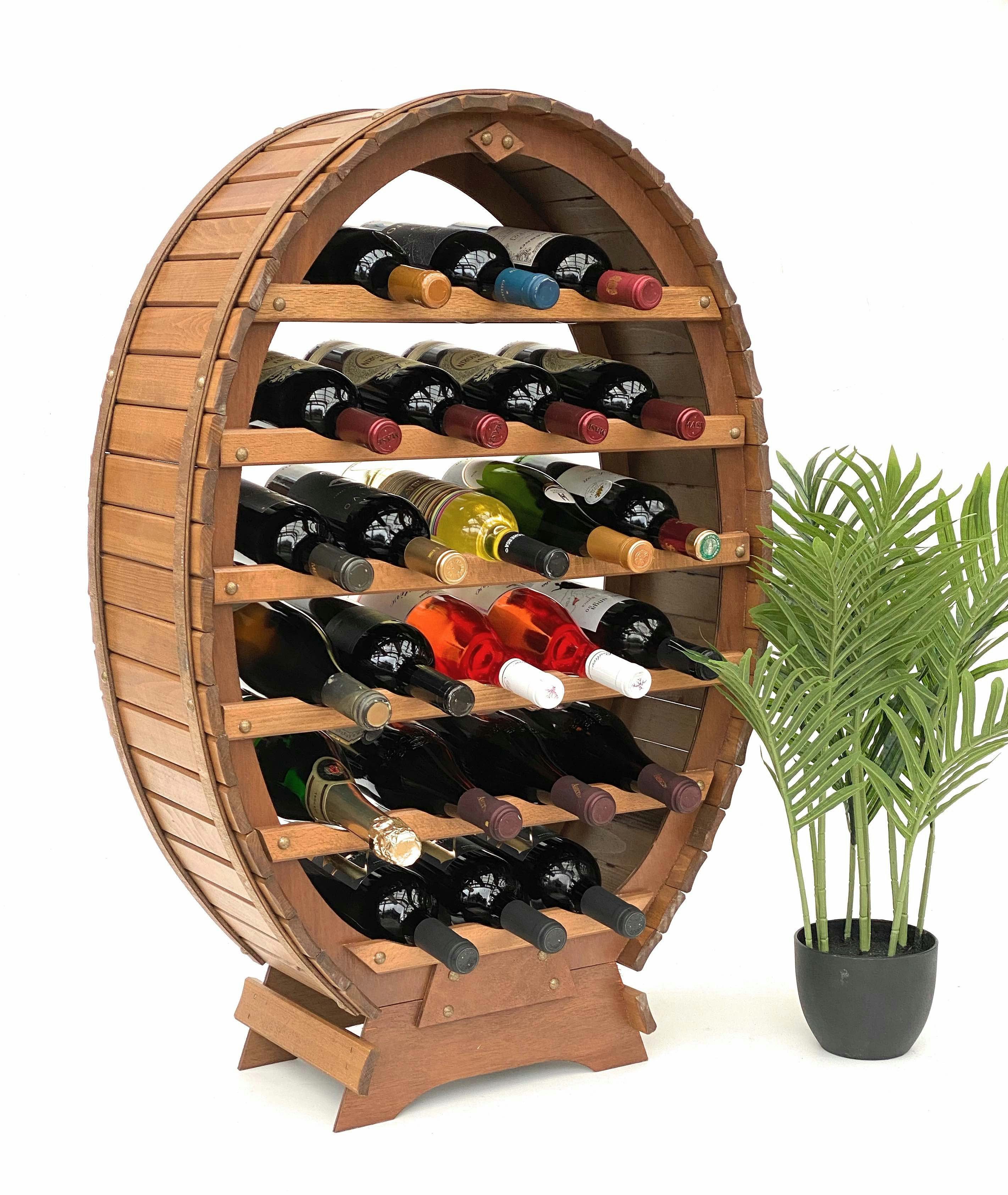 Hochwertiges Design Weinregal aus Holz gefertigt in der Form von einem Weinfass. Das Regal bietet Platz für bis zu 24 Flaschen, sowohl für 0,75 Liter als auch für 1,0 Liter Flaschen geeignet.
