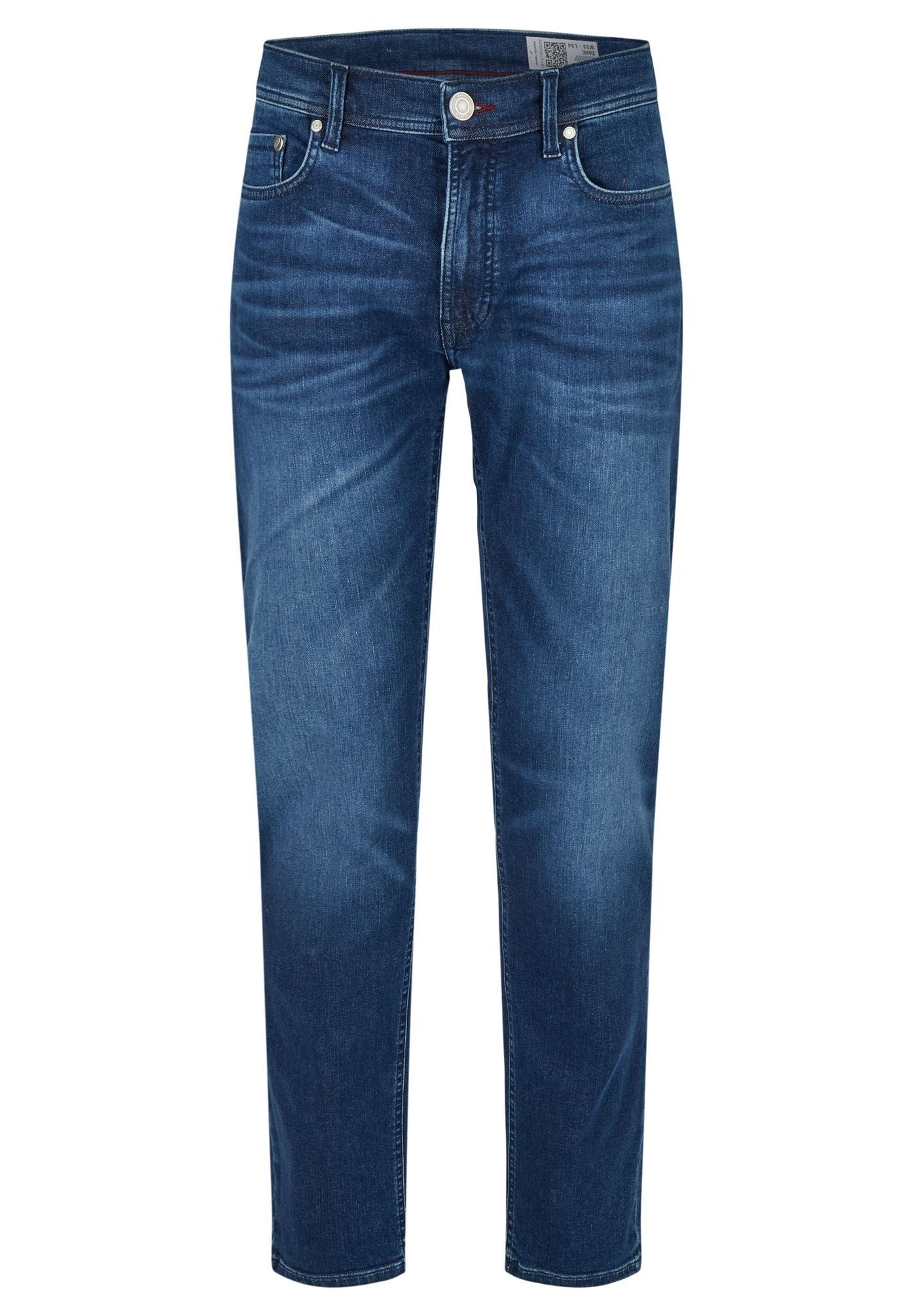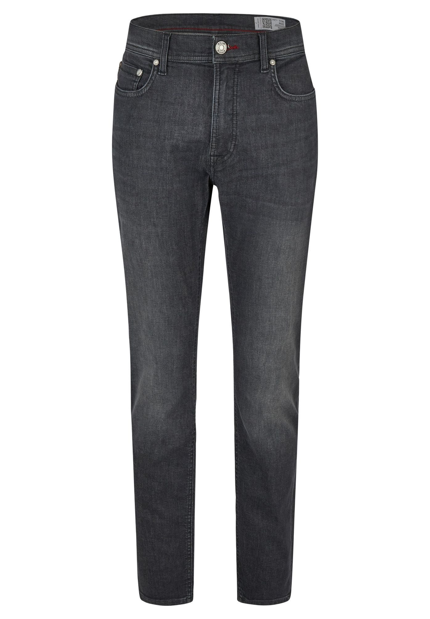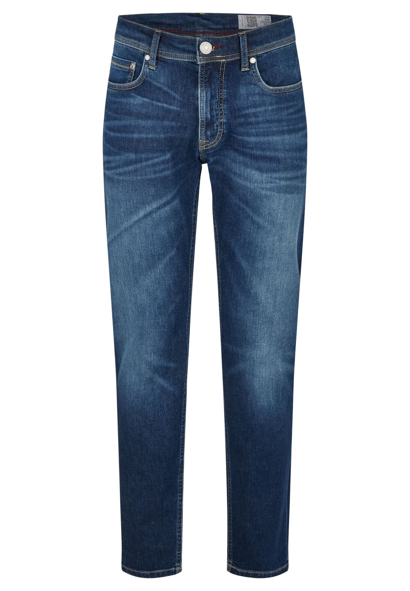 Diese Regular Tapered 5 Pocket Jeans aus einem Spezial-Denim aus Baumwolle und Hightech-Fasern, Style Belfort, verbindet den kernigen Look mit einem angenehm weichen Griff. Knie und Gesäß dieser Jeans von HECHTER PARIS beulen auch nach Stunden nicht aus. Die üblichen Sitzfalten an der Hüfte und den Kniekehlen erholen sich rasch. Die permanente Stretch-Faser macht die Hose super bequem, sehr soft und bietet höchste Bewegungsfreiheit. Das verwendete Denim trocknet 3-mal schneller als herkömmlicher Jeansstoff.