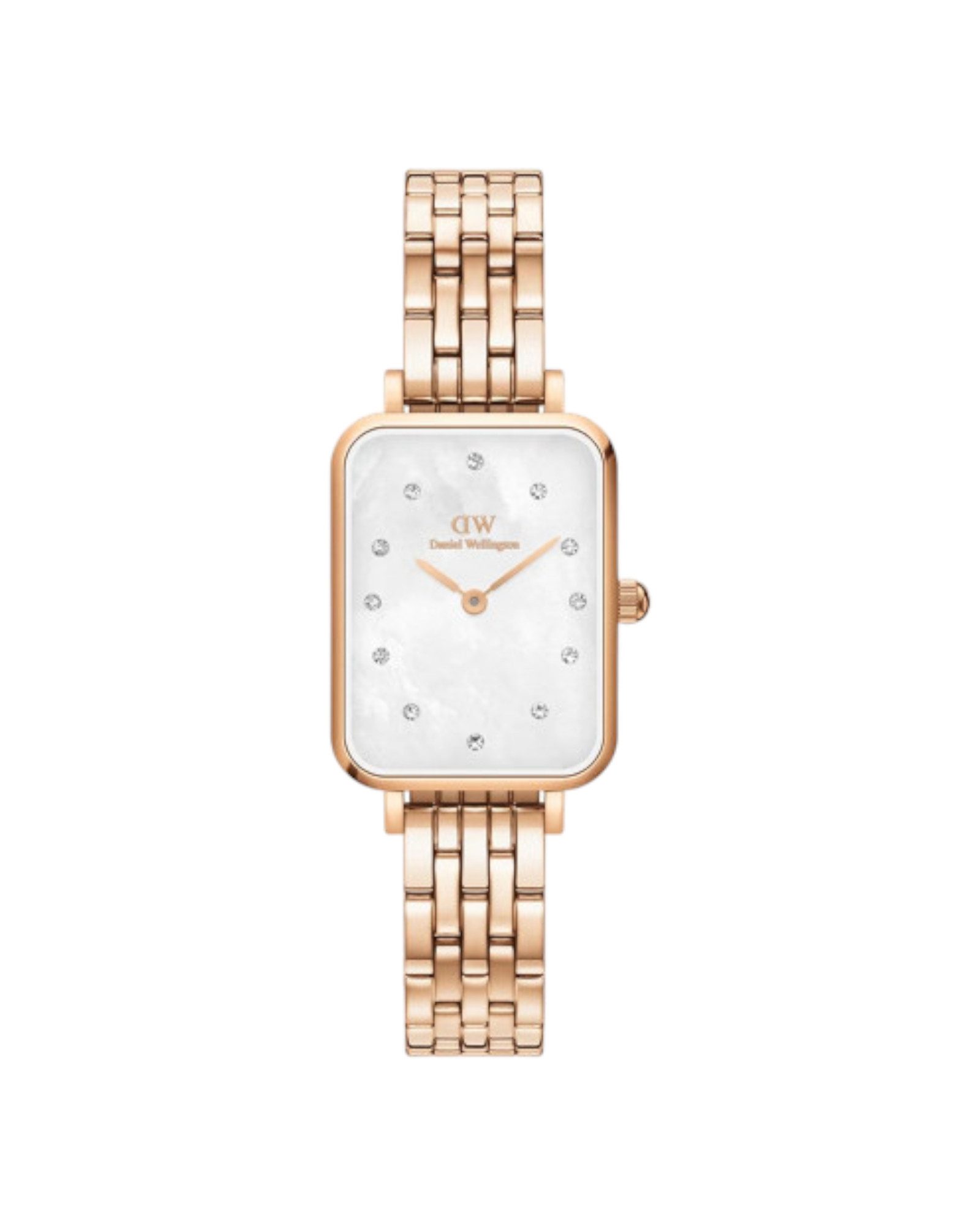 Die Daniel Wellington Quadro Uhr DW00100620 ist eine elegante Damenuhr mit minimalistischem Design. Sie ist aus hochwertigem Edelstahl gefertigt und verfügt über ein weißes Perlmuttzifferblatt mit roségoldenen Zeigern und Indizes. Die Uhr wird von einem zuverlässigen Quarzwerk angetrieben und ist bis 3 bar wasserdicht. Das roségoldene Edelstahlarmband mit Schließe sorgt für einen angenehmen Tragekomfort und rundet das elegante Erscheinungsbild der Uhr perfekt ab.