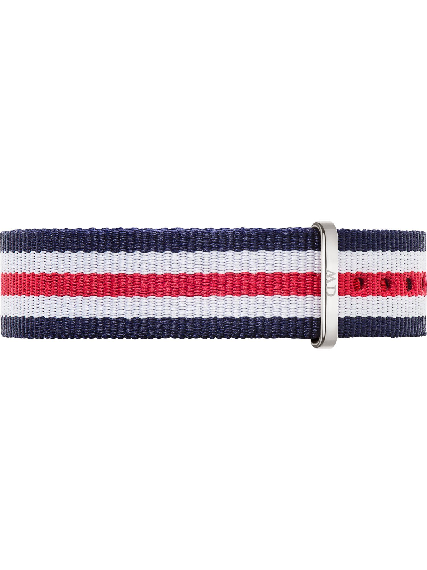 Schick und sportlich-elegant präsentieren Sie sich mit diesem dreifarbigen Daniel Wellington Uhrenarmband zum Wechseln, das Sie ganz einfach an Ihre Damen- oder Herrenuhr anbringen können. Das ca. 18 mm breite Armband besteht aus hochwertigem Textil und wird von einer silberfarbenen Dornschließe veredelt, die für eine komfortable Handhabung sorgt. Für modebewusste Menschen, die Abwechslung lieben!