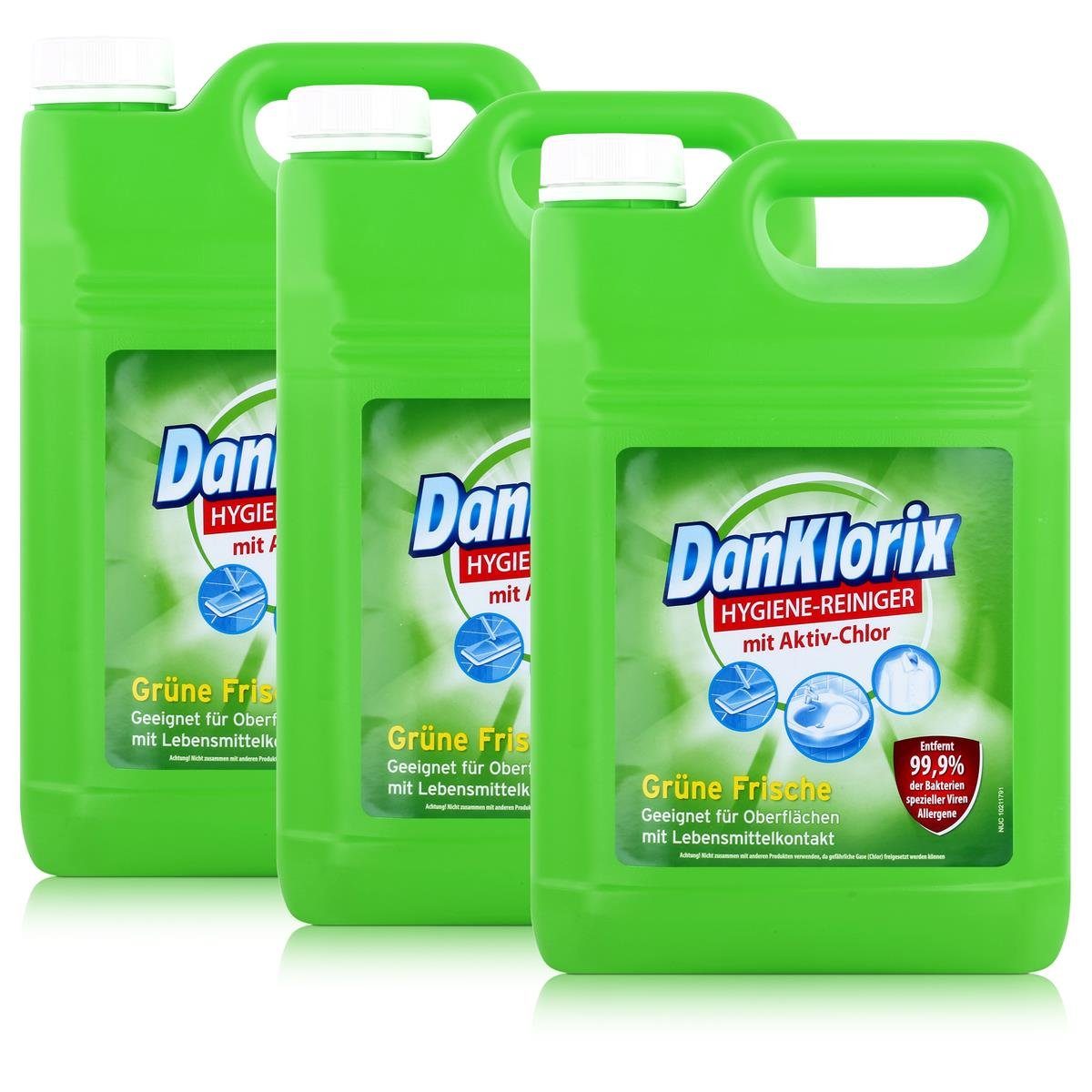 Im Lieferumfang enthalten: DanKlorix Hygiene-Reiniger grüne Frische 5L 3er PackInhaltsstoffe | Unter 5% Bleichmittel auf Chlorbasis, Duftstoffe, Wirkstoff: 2,8g Natriumhypochlorit per 100 g Flüssigkeit |