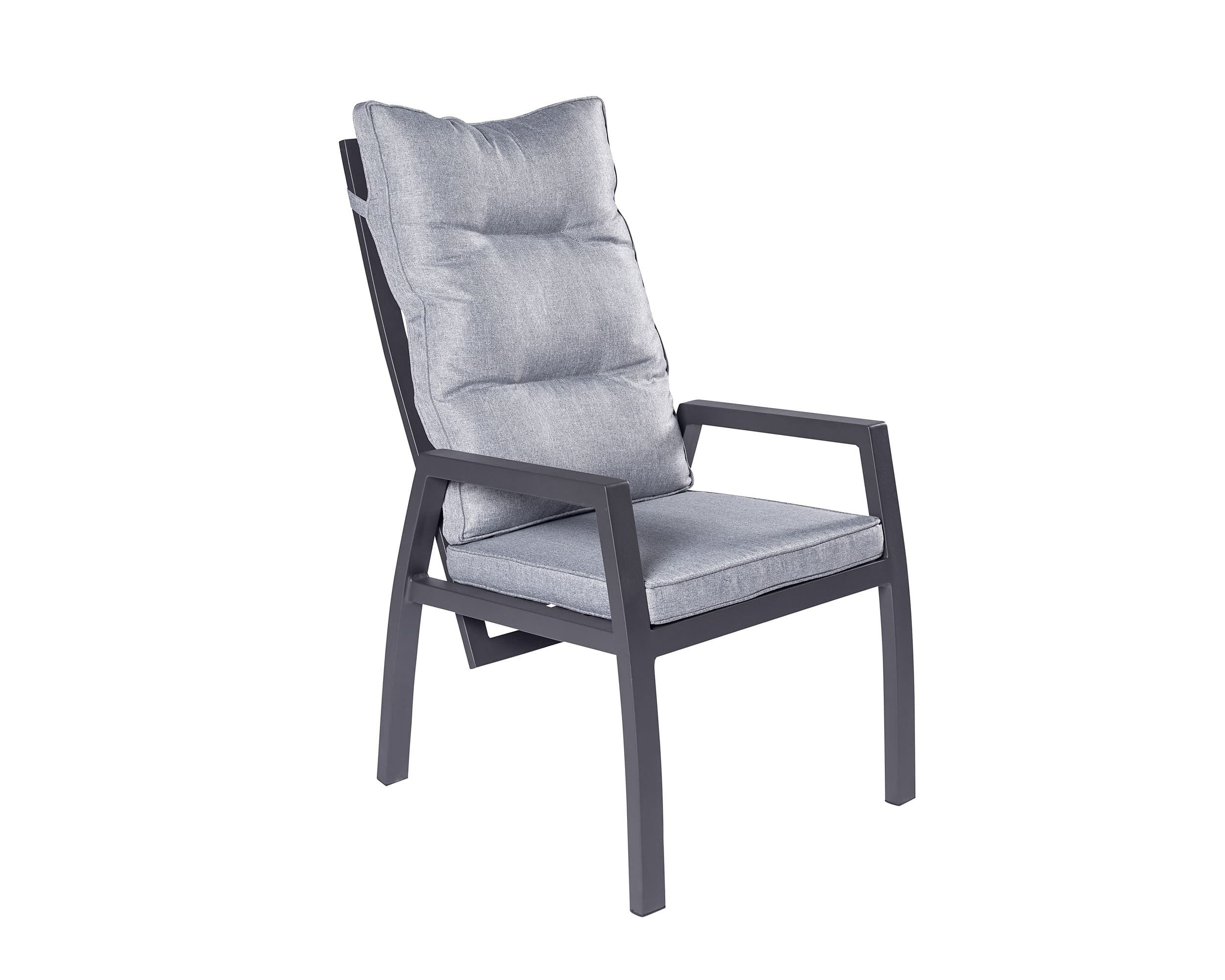 Stil und Funktionalität stehen im Mittelpunkt der fortlaufenden Entwicklung der Möbelserie Burundi. Mit dem neuen Gartensessel können Sie sich und Ihre Gäste begeistern. Die stufenlos verstellbare Rückenlehne und das kombinierte Sitz- und Rückenpolster sorgen für optimalen Sitzkomfort zu jeder Zeit. Ein besonderes Highlight ist die einfache Verstellung der Lehne per Knopfdruck, der nun an der Innenseite der Armlehne angebracht ist. Der Hochlehner aus Aluminium ist leicht und rostbeständig. Die Kombination aus anthrazitfarbenem Rahmen und grau melierter Auflage wird Ihre Terrasse oder Ihren (Winter-)Garten optisch aufwerten. Gönnen Sie sich den Luxus von hochwertigen und langlebigen Gartenmöbeln. Die Anforderungen an Garten- und Terrassenmöbel im Bereich "Dining" sind hoch. Sie müssen kompakt und pflegeleicht sein, aber dennoch den Komfort von Esszimmermöbeln und ein ansprechendes Design bieten.