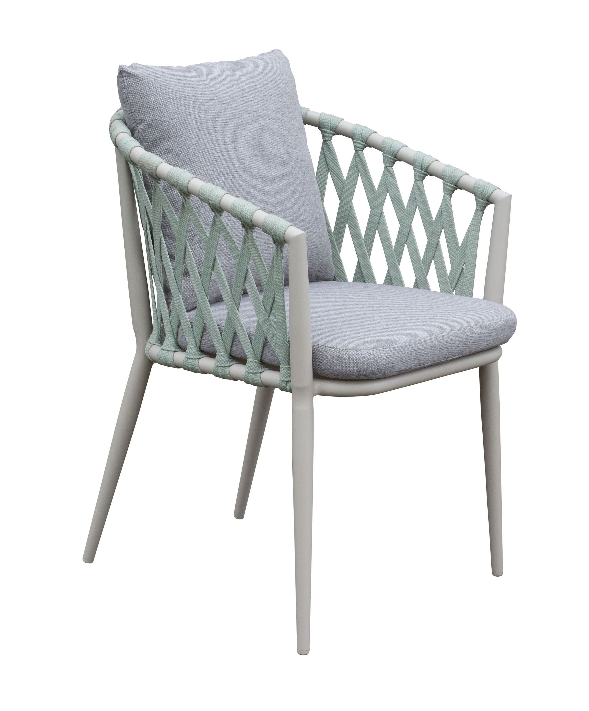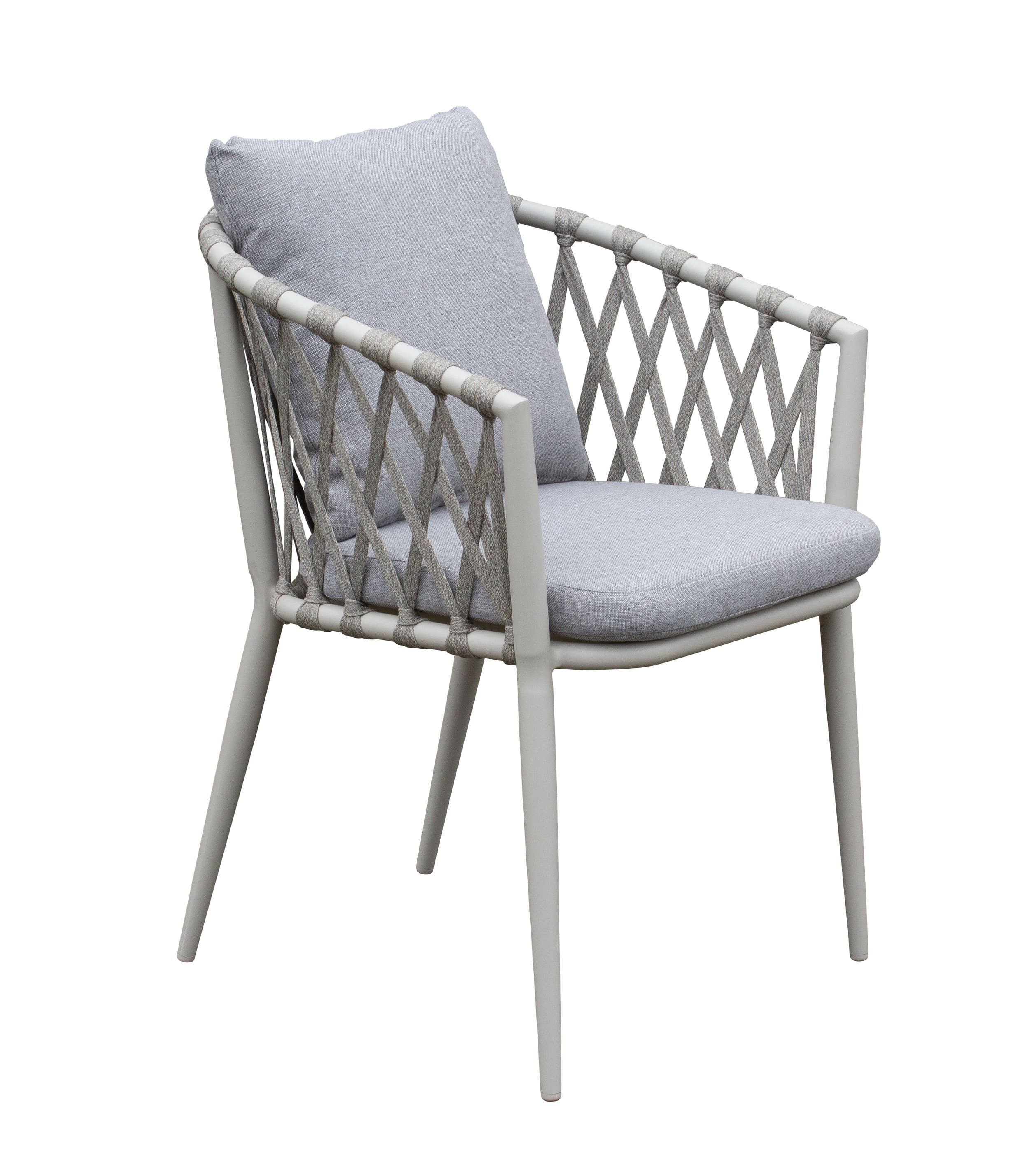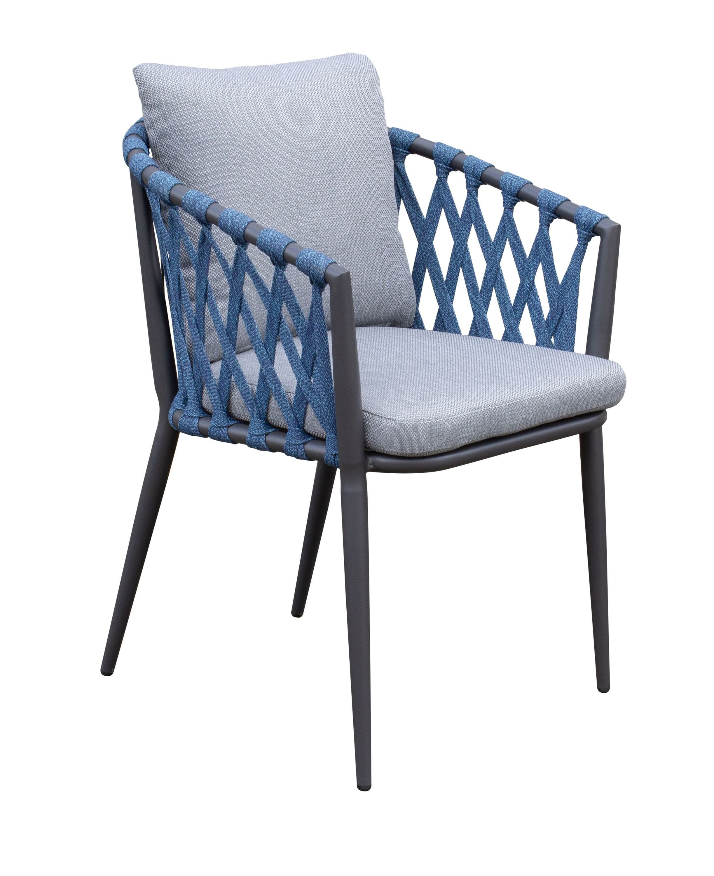 Die Sitz- und Rückenfläche des Stuhls ist mit einer graufarbigen Rope-Bespannung ausgestattet, die nicht nur optisch ansprechend ist, sondern auch als echtes Highlight in jedem Außenbereich fungiert. Die im Lieferumfang enthaltene Sitzauflage sorgt für zusätzlichen Komfort und lädt zum Verweilen ein.