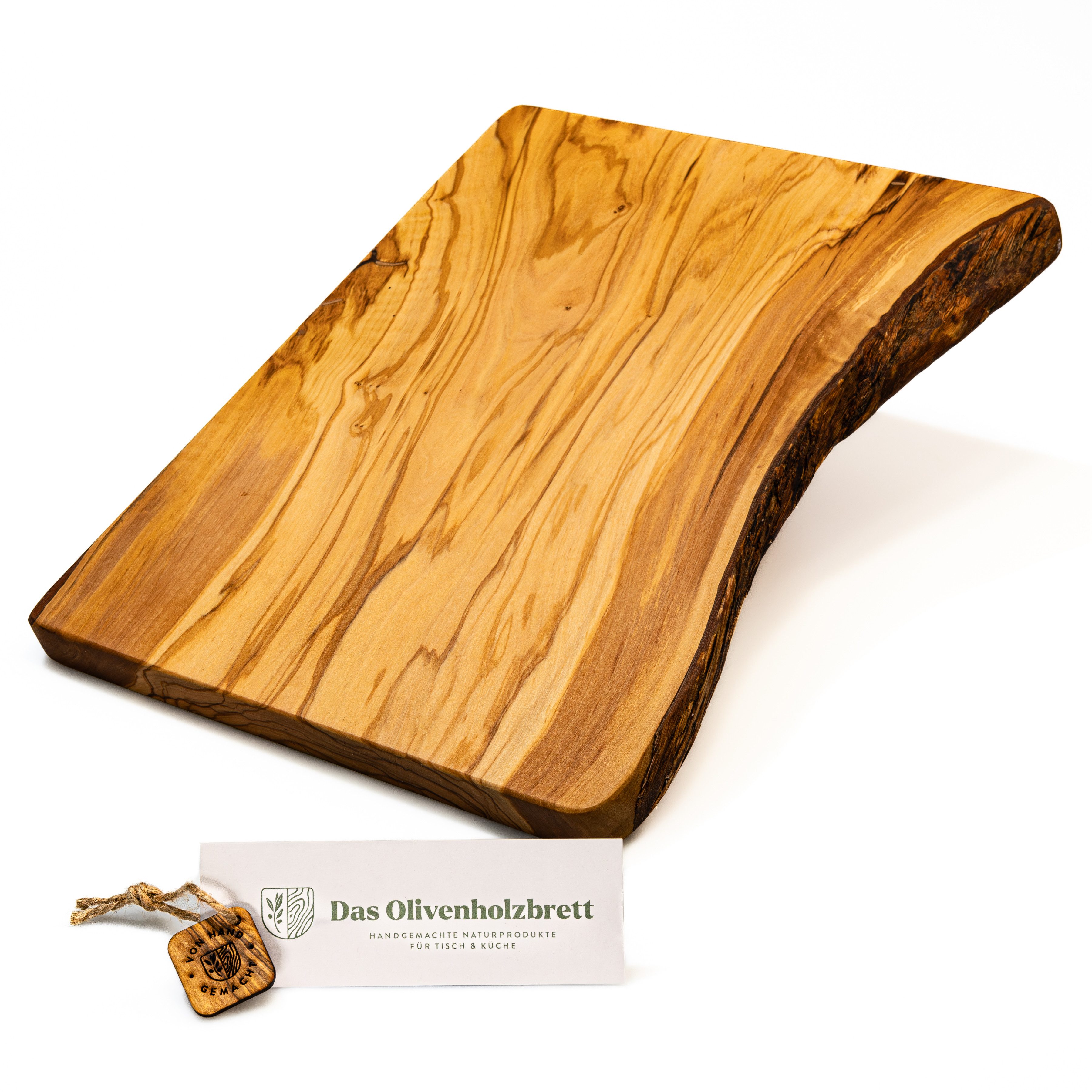Dieses massive Servierbrett aus Olivenholz ist Ihr Helfer für alle Fälle. Mit der Rinde an einer Seite holen Sie sich besonderes rustikales Flair in Ihre Küche. Das Olivenholzbrett stammt aus einem Stück Olivenholz. Durch das spezielle Wachstum hat das Holz eine wunderschöne, grobe Maserung. Mit dem Olivenholzbrett halten Sie ein langlebiges Naturprodukt in den Händen – ein absolutes Unikat. Ihr Schneidebrett ist zu 100% handgefertigt und zu 100% natürlich. Das Brotzeitbrett ist in 8 Größen erhältlich. Natürlich ist das Schneidebrett auch ein praktisches und stilsicheres Hochzeitsgeschenk. Achtung: Durch das besondere Wachstum kann es zu kleinen Rissen im Schneidebrett kommen.