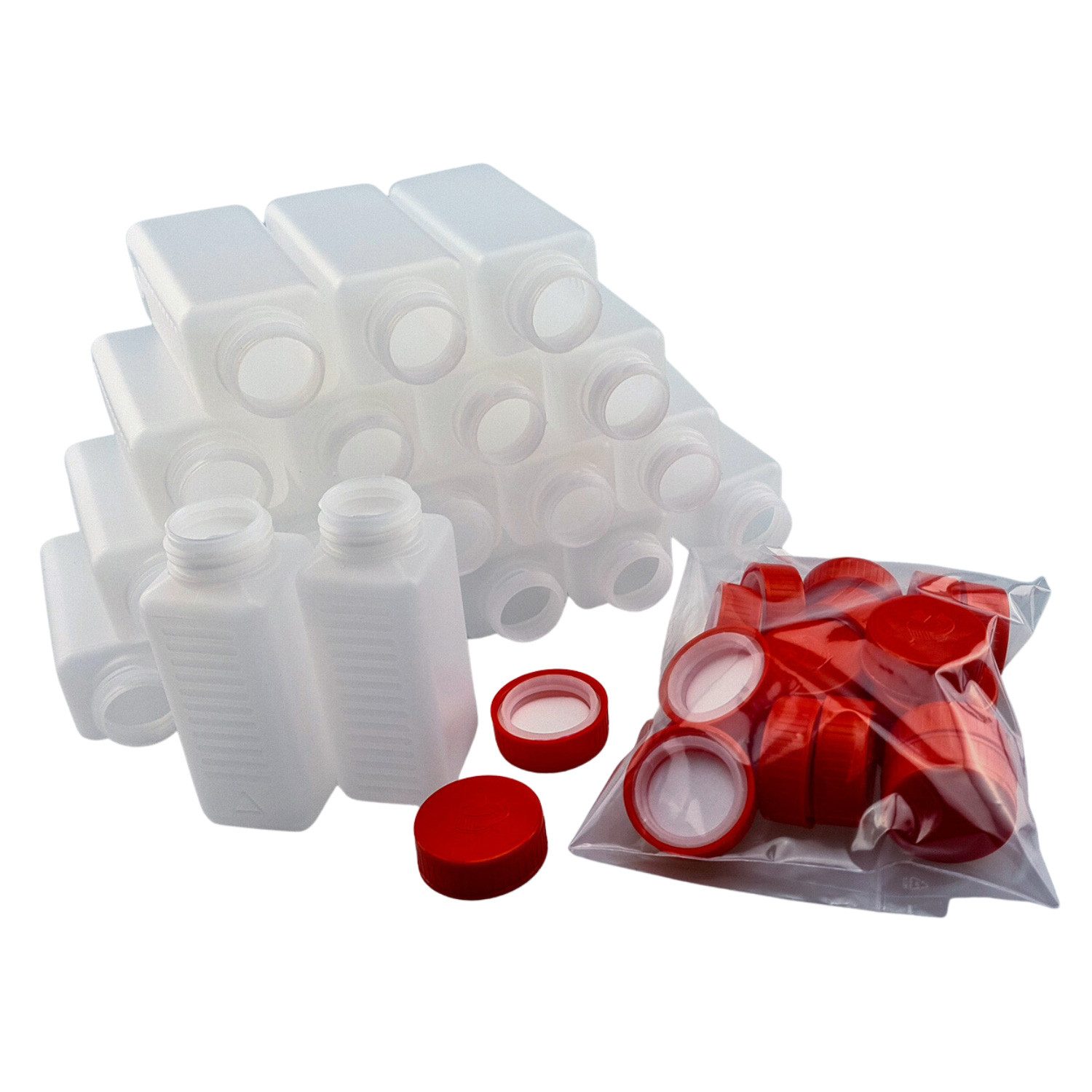Material | 100ml HDPE-Vierkantflasche geriffelt Gewinde 28 mit Kisi (20 Stück) |