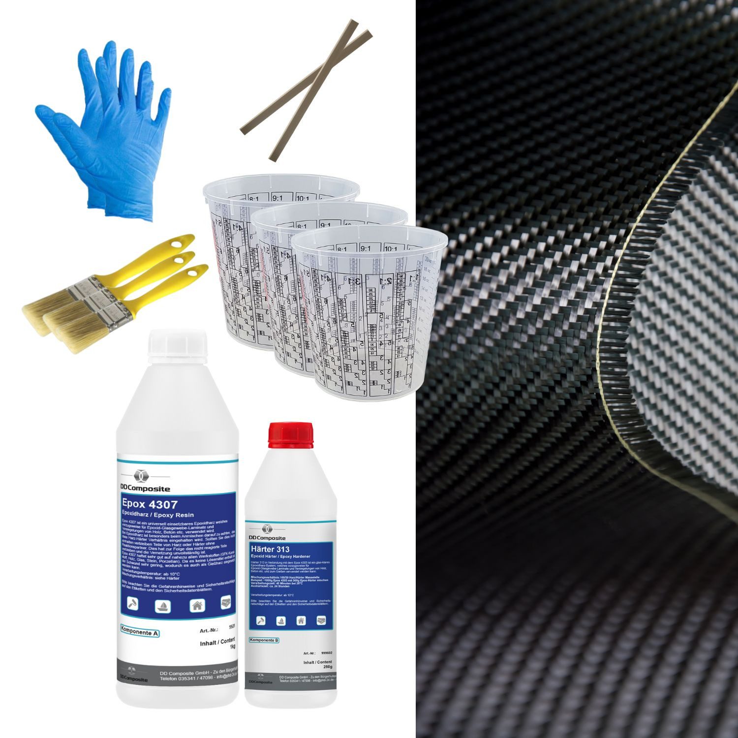 Lieferumfang | 1,5m² Carbongewebe 200g/m² Köper, 1x 1000g Epox 4307 + 500g Härter 313, 3x Pinsel (2x30mm 1x50mm), 3x Rührbecher (600ml), 2x Rührstäbe, 10 Stück Nitrilhandschuhe (Größe: XL) |