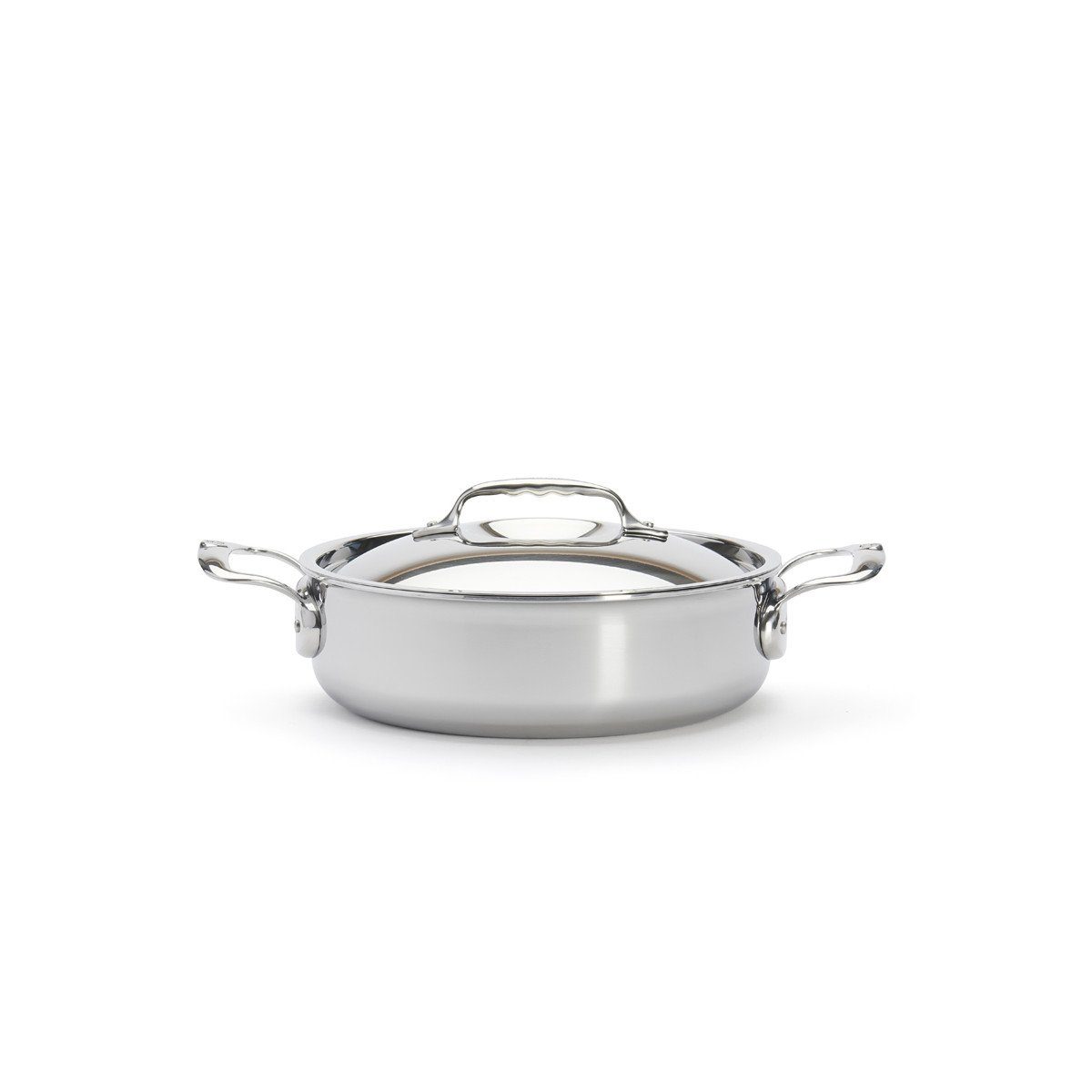 Der mittelgroße Bräter präsentiert sich in einer geraden Form mit einer niedrigeren Höhe, ähnlich einer Sauteuse mit Henkelgriffen. Er bietet ein Fassungsvermögen von 2,6 Litern, einen Durchmesser am oberen Rand von 24 cm und eine Auflagefläche von 20,5 cm bei einer Höhe von 7,5 cm. Die reduzierte Höhe verhindert ein Verdunsten des Kondenswassers und leitet es schneller zurück auf das Gargut. Das Kochgeschirr aus der Affinity Serie besteht aus zwei verschiedenen Materialien in fünf Schichten. Zwei Schichten Edelstahl (innen mattiert, außen hochglänzend poliert) umschließen einen durchgehenden Kern aus Aluminium. Dieser bis zum oberen Rand reichende Kern ermöglicht eine sehr schnelle Erhitzung auf allen Herdarten. Die gleichmäßige Wärmeverteilung sorgt dafür, dass das Gargut von den Seitenwänden und vom Boden gleichmäßig erhitzt wird. Temperaturveränderungen werden direkt ins Innere übertragen, was besonders auf Induktionsherden bemerkbar ist. Der Bratentopf verfügt zudem über einen Schüttrand für tropffreies Ausgießen und zwei großzügige, vernietete Henkelgriffe aus Edelstahlguss. Die Griffe erwärmen sich nur leicht, da ein Sicherheitsabstand zum Korpus gewährleistet ist. Ein bewährter Deckel aus Edelstahl mit mittig angeordneter Wölbung ist ebenfalls im Lieferumfang enthalten.