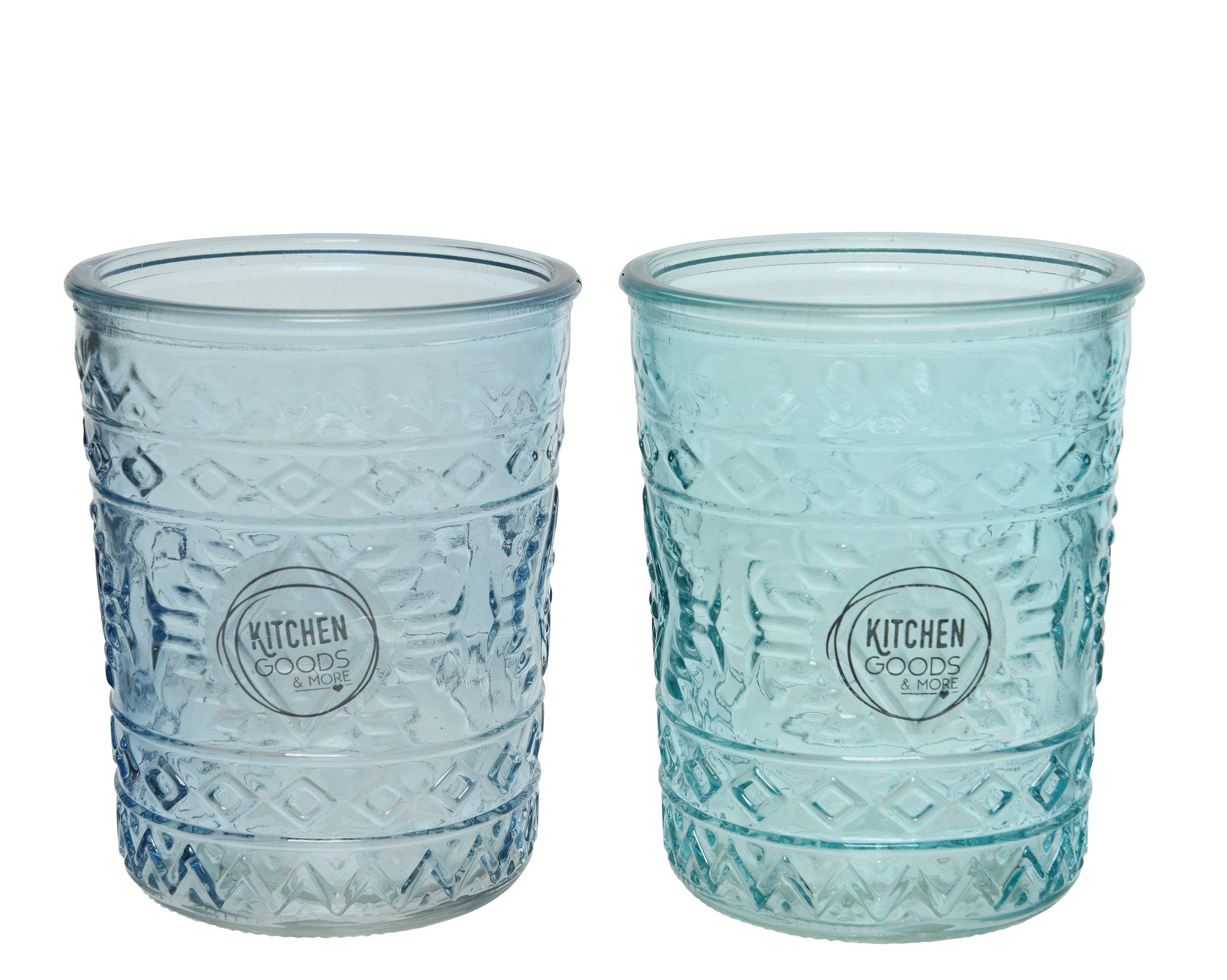 PRODUKT: Wasserglas mit Ornamenten / INHALT: 1 Becher (Auslieferung nach Zufallsprinzip) / DURCHMESSER: ca. 6,3 cm (unten), ca. 8,5 cm (oben) / HÖHE: ca. 10,3 cm / VOLUMEN: ca. 400