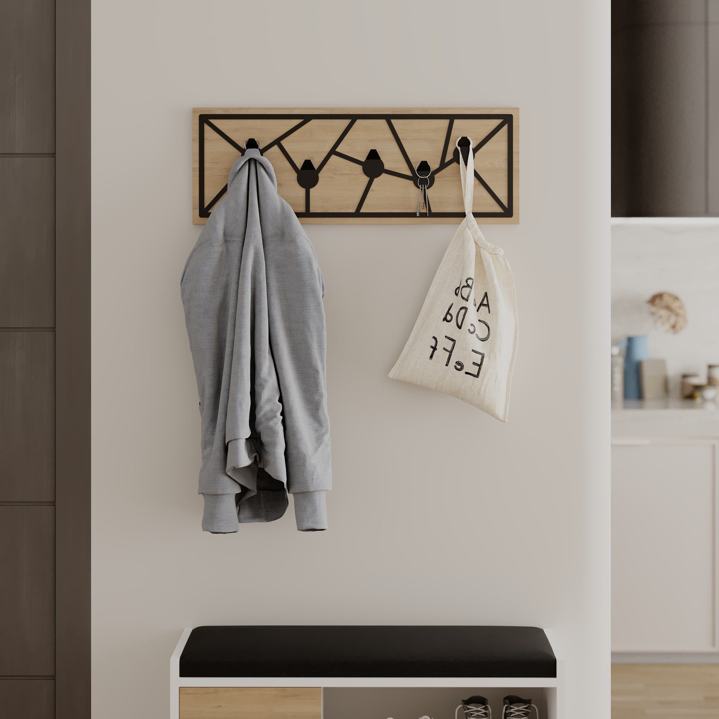 Bringen Sie Eleganz und Ordnung in Ihr Zuhause mit Trace: einem modernen Kleiderständer, der Funktionalität und Stil nahtlos miteinander verbindet. Ob im Eingangsbereich, im Schlafzimmer, im Kinderzimmer oder im Wohnbereich – das raffinierte Design von Trace kommt überall zur Geltung. Wählen Sie zwischen strahlendem Weiß oder warmem Eichenholz, jeweils akzentuiert durch dezente schwarze Metalllinien, und ergänzen Sie Ihre Einrichtung mit einem vielseitigen Möbelstück. Aber Trace sieht nicht nur gut aus, sondern ist auch unglaublich praktisch. Mit seinen 5 stabilen schwarzen Metallhaken, die reichlich Platz für Mäntel, Jacken, Schals, Taschen und mehr bieten, halten Sie Unordnung in Schach. Der Trace ist aus hochwertigem Holzwerkstoff und einem strapazierfähigen Edelstahlrahmen gefertigt und kann bis zu 5 kg Gewicht tragen, sodass er auch im täglichen Gebrauch eine gute Figur macht. Und trotz seiner großzügigen Stauraumkapazität bleibt er mit seinen Abmessungen von 74,6 cm Breite, 1,8 cm Tiefe und 26,6 cm Höhe platzsparend und eignet sich somit ideal auch für kompakte Räume. Dank des benutzerfreundlichen Designs lässt er sich schnell und problemlos aufstellen, sodass Sie Ihren neuen Organizer in wenigen Minuten nutzen können. Verschönern Sie Ihren Raum und sorgen Sie für Ordnung mit dem Trace: der perfekten Kombination aus modernem Design, Funktionalität und müheloser Montage.