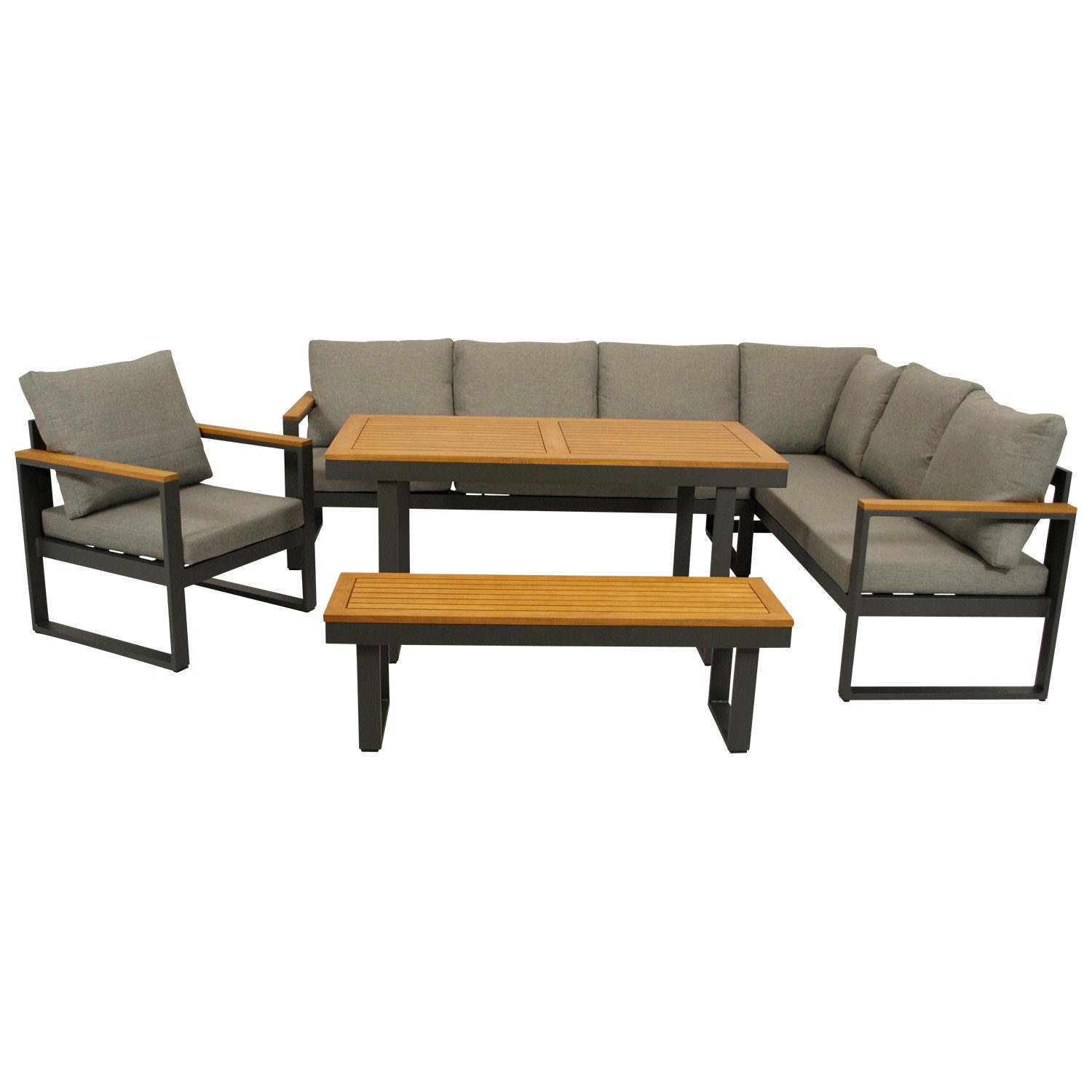 Lieferumfang | 1x Eckbank mit Polstern 1x Sessel mit Polstern 1x Hockerbank 120cm 1x Tisch 140x70cm |