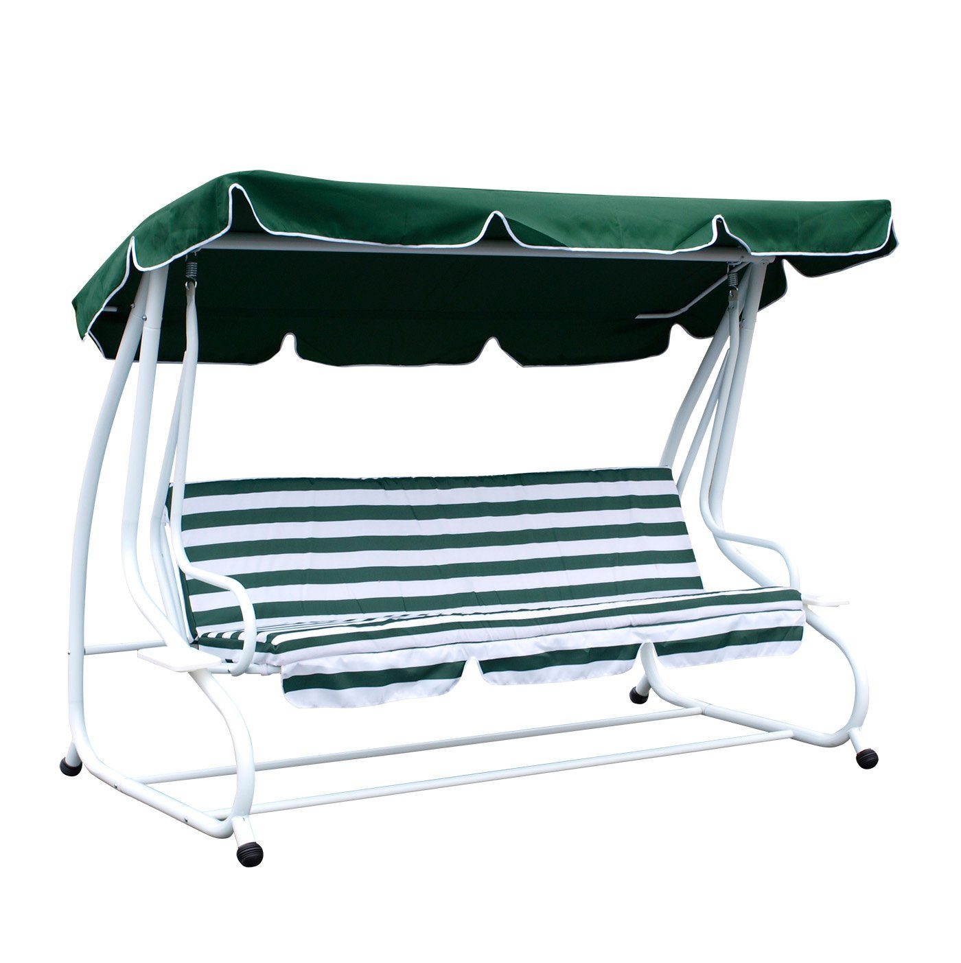 Extragroße 4-sitzer Funktions- Hollywood-Schaukel Miami, Abmessungen 228x120x164cm, Gestell weiss pulverbeschichtet. Durch Umklappen der Rückenlehne kann die Schaukel auch als bequeme Liege genutzt werden (siehe kleines Bild unten). Durch die großzügigen Maße des Sitz-Liegeteils bietet die Liegefläche auch großgewachsenen Personen bequem Platz. Maße: Breite total: 228cm, Tiefe total: 120cm, Höhe total: 164cm, Breite Sitzfläche: 190cm, Sitztiefe: 50cm, Höhe Rückenlehne: 50cm, Maße Liegefläche umgeklappt: 190x100cm Das Gestell ist aus extra stabilem Stahlrohrrahmen (pulverbeschichtet - Durchmesser der Rohre des Hauptgestänges 48mm) gefertigt. Das Dach besteht aus einem stabilen und witterungsbeständigen Polyester-Bezug / 180g/m² in der Farbe dunkelgrün mit weißen Kedern am Rand. Die grün/weiß gestreiften Kissen sind gepolstert - bequem und äußerst widerstandsfähig zugleich. Seitlich befinden sich zwei Ablagen für Getränke o.ä. Die Füße sind zum Schutz zusätzlich mit schwarzen Kunststoffkappen versehen (im Bild nicht zu sehen). Die Schaukel ist bis 240kg belastbar. Material Bezüge: 100% Polyester.
