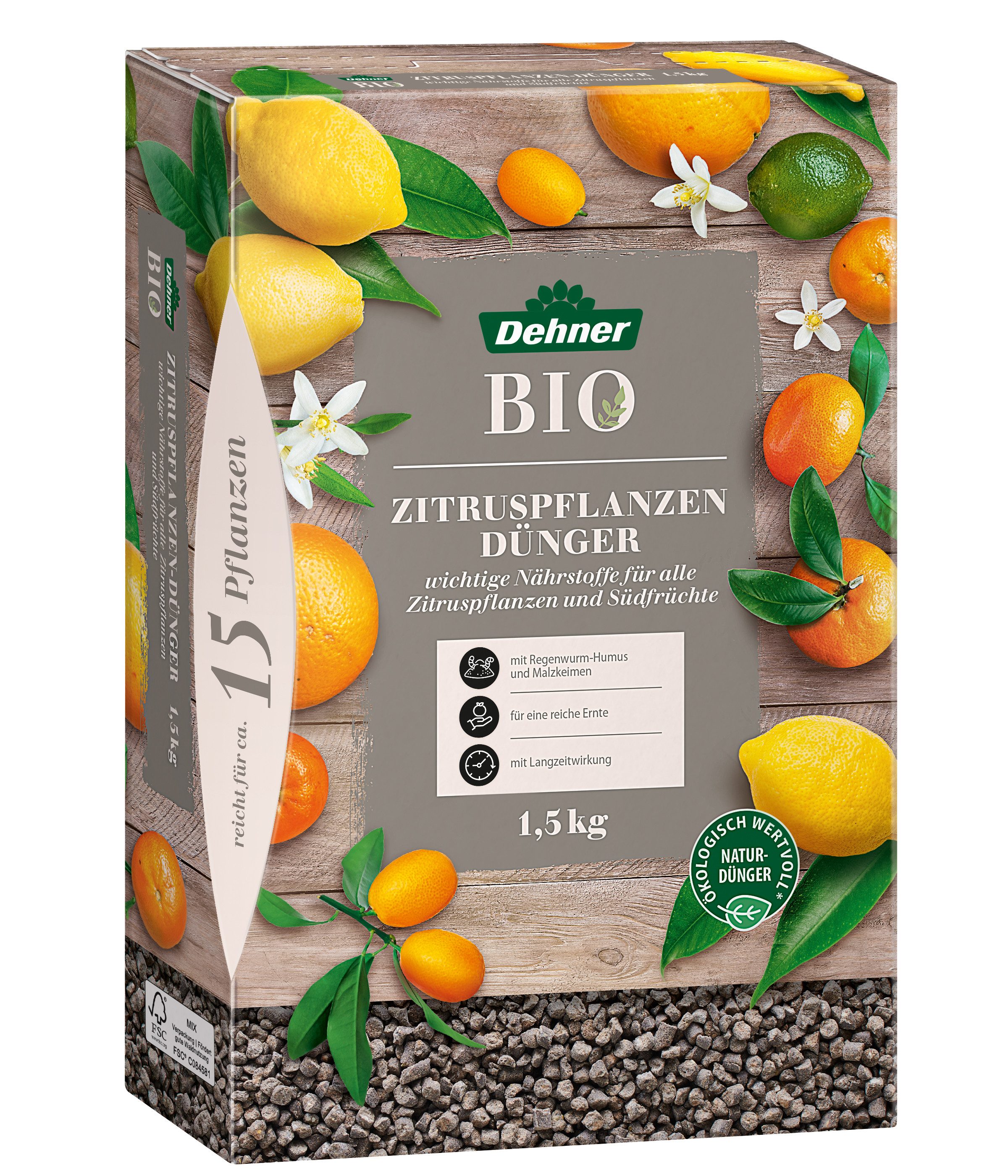 Vor allem beim Umtopfen und im Zeitraum von März bis Oktober sind Zitruspflanzen auf eine hohe Nährstoffzufuhr angewiesen. Stärken Sie Ihre Gewächse, damit ihre Abwehrkräfte verbessert werden und sie sich vor Krankheiten und Schädlingen schützen können. Pflanzen, die mit Dehner Bio Zitruspflanzen Dünger versorgt werden, wachsen besser und werden besonders kräftig. Dank der natürlichen Langzeitwirkung brauchen Sie nur alle acht Wochen nachdüngen. Mit der ausreichenden Wasserzufuhr und der organischen Zugabe der notwendigen Nährstoffe durch den Bio Dünger von Dehner erzielen Sie eine reiche Ernte.