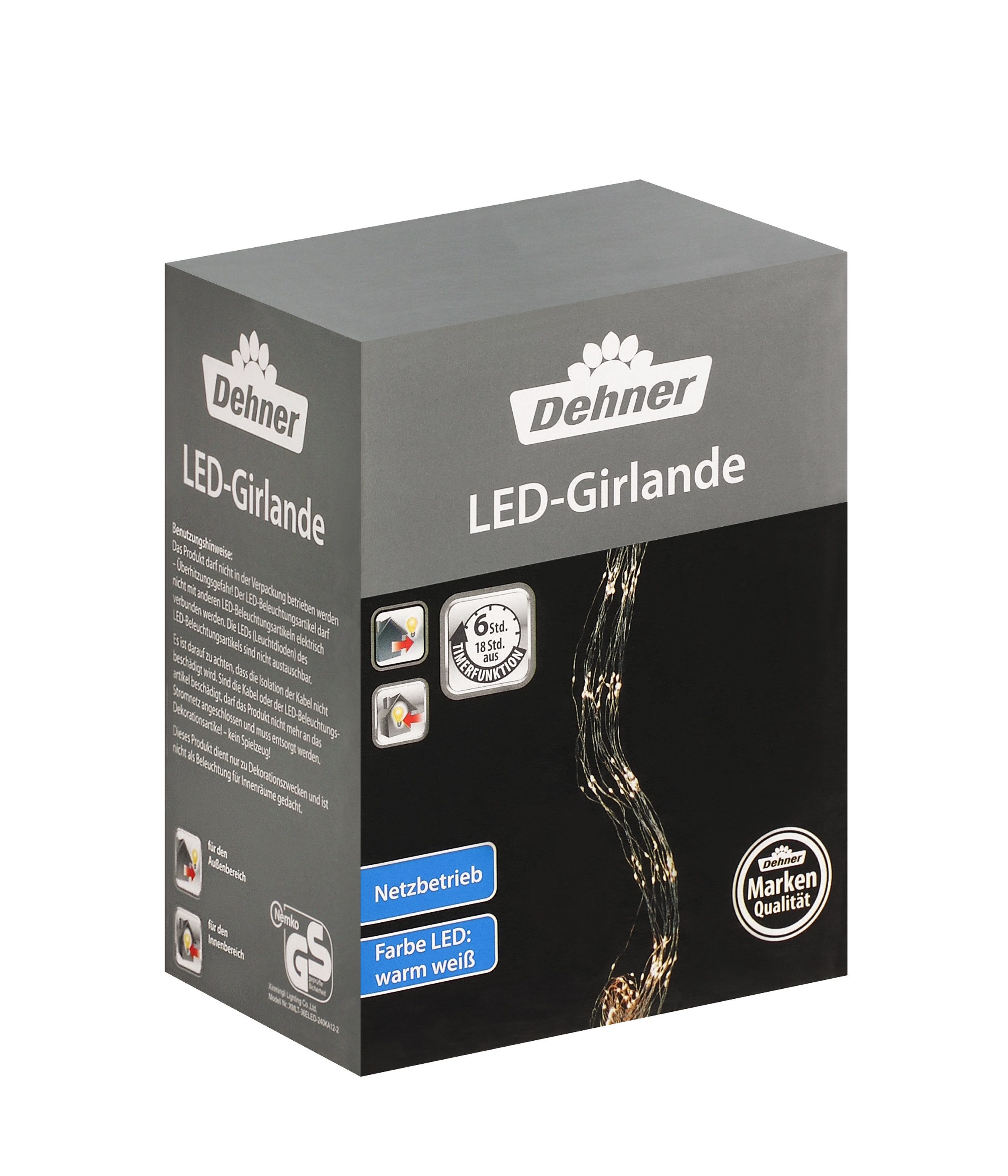 Sie möchten die Dehner LED-Lichtergirlande nicht jeden Abend per Hand einschalten? Dann ist der integrierte Timer für Sie perfekt. Er ermöglicht es, dass die Dehner LED-Lichtergirlande sich für sechs Stunden automatisch einschaltet. Außerdem besitzt die Dehner LED-Lichtergirlande eine extralange Zuleitung. Dies macht sie sehr flexibel einsetzbar. Zuletzt ist sie sogar wasserdicht und kann deshalb innen und außen genutzt werden. Besonders in der Weihnachtszeit ist die Dehner LED-Lichtergirlande ein echter Hingucker. Sorgen auch Sie für eine gemütliche und festliche Stimmung mit der Dehner LED-Lichtergirlande in bekannter Markenqualität!