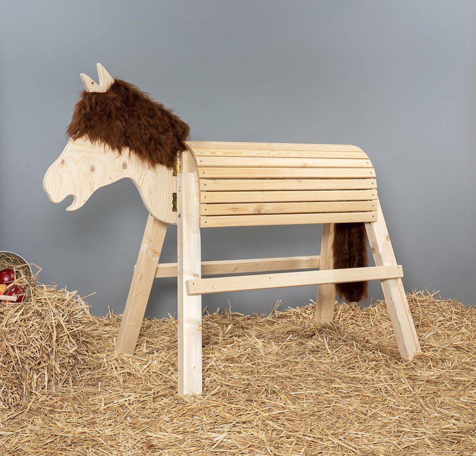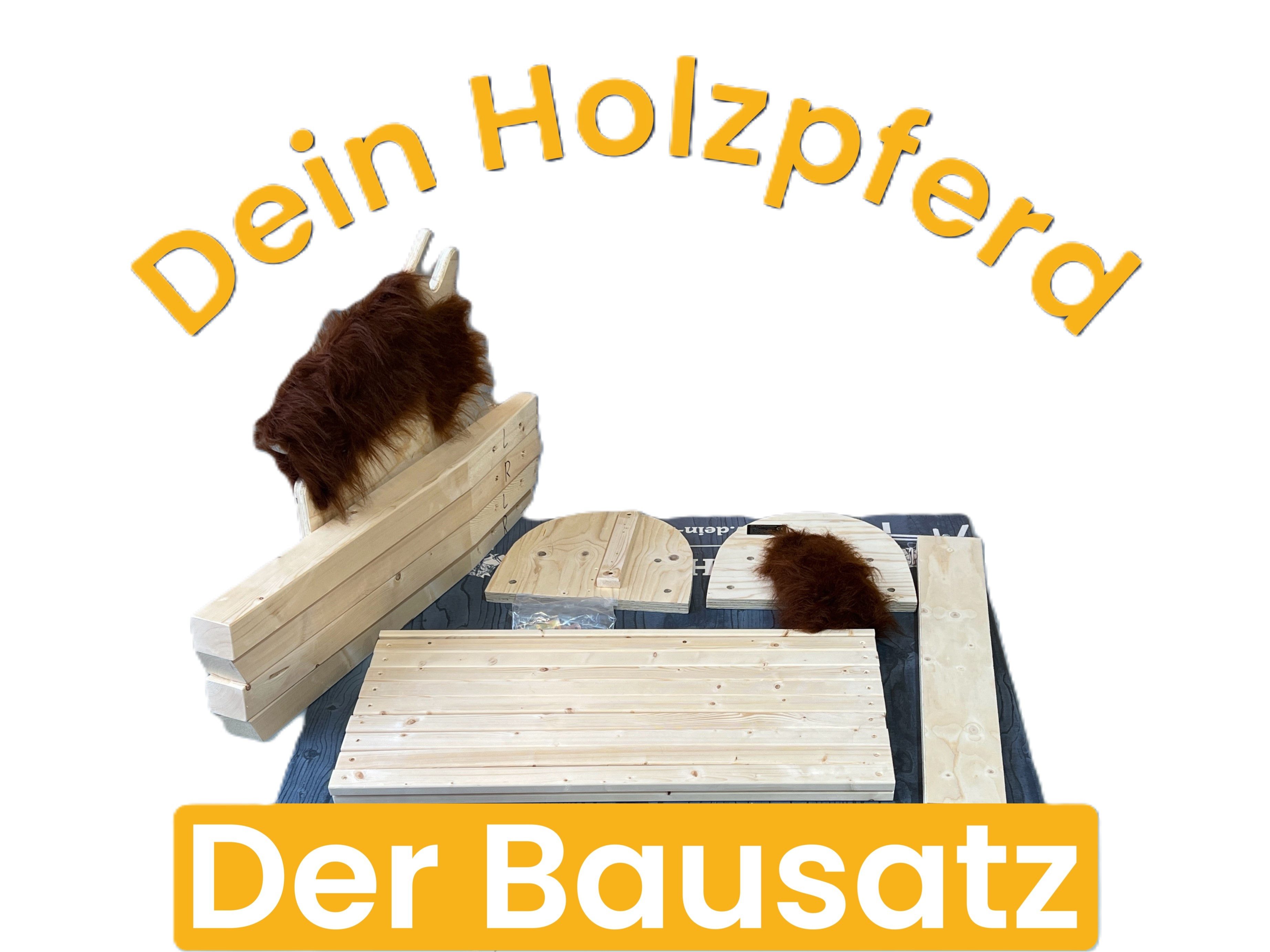 Lieferumfang | Holzpferd, Sitzhöhe 100cm 4 Beine 1 beweglicher Kopf (schwenkbar nach rechts und links) mit Mähne und Schopf Rumpflpatten - hinten mit Schweif Rumpfverstärkung Rumpfleisten Schrauben, Muttern, Unterlegscheiben Abstandsplättchen |