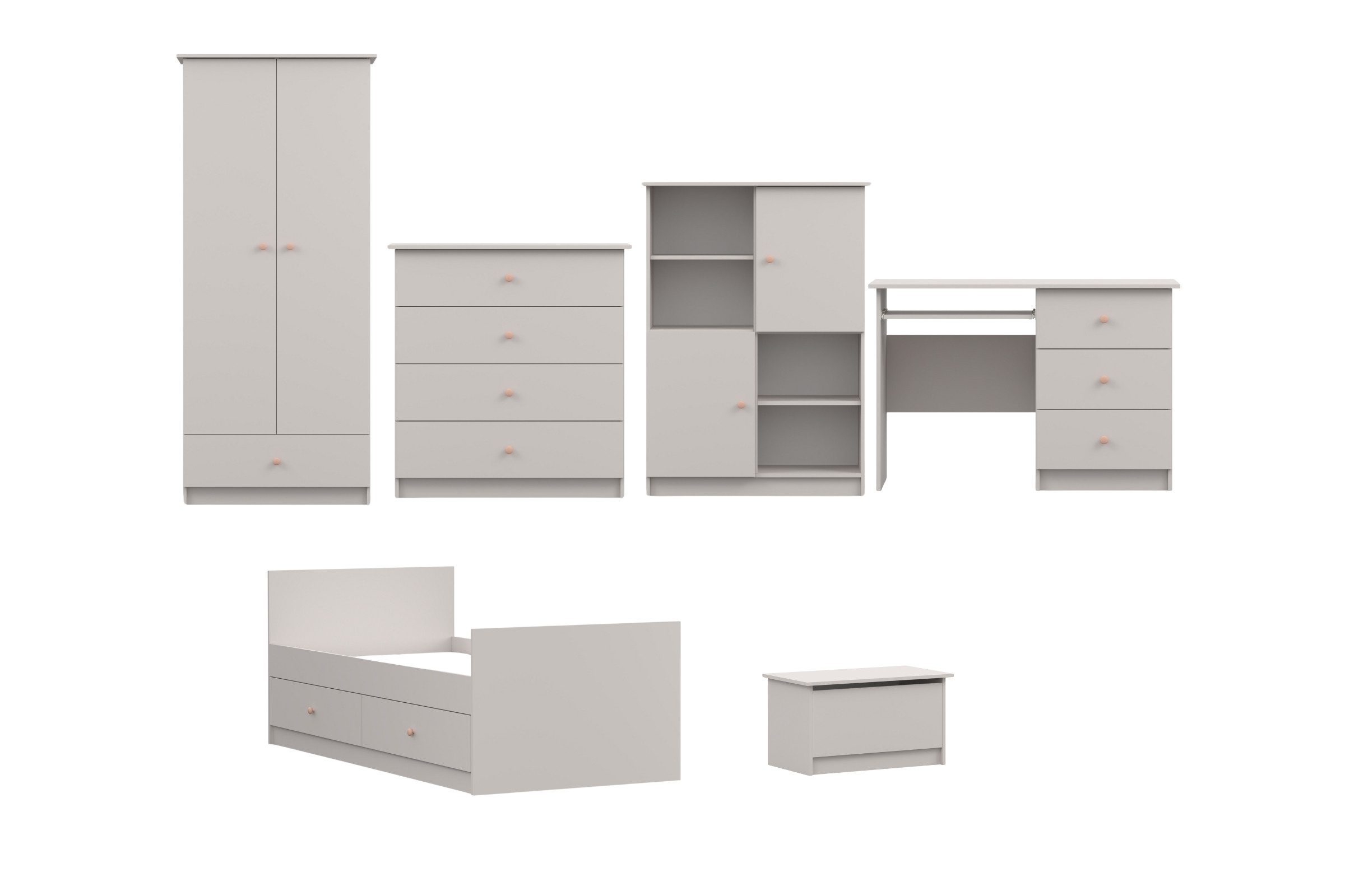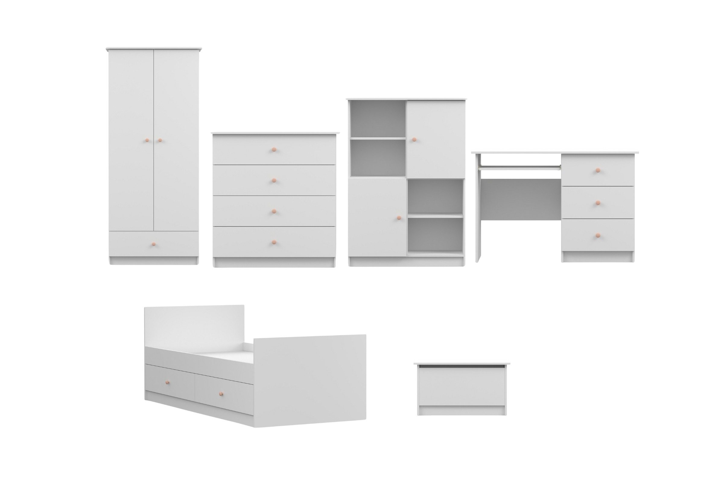 Set beinhaltet | Kleiderschrank, Schreibtisch, Kommode, Bett, Regal, Spielzeugtruhe |