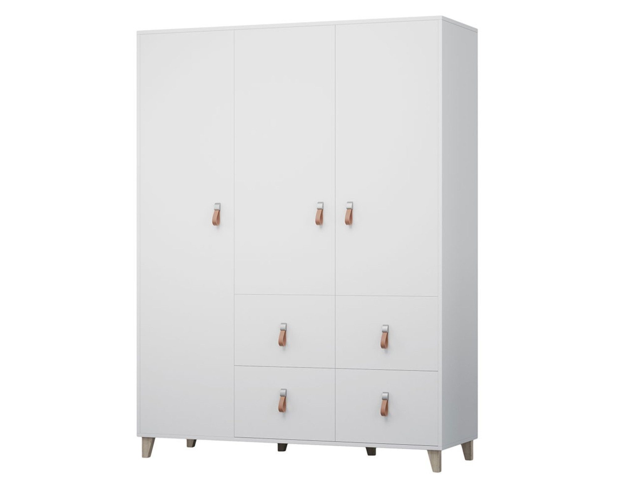 Moderne Ledergriffe tragen zum Charme der Möbel bei. Die Kanten der Möbel durch ABS-Kanten geschützt. Perfekte Möbel für ein Kinder- oder Jugendzimmer, helle Farben, moderner skandinavischer Stil.