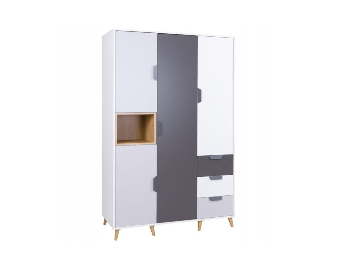Gestalten Sie ein modernes und funktionales Zimmer mit dem 3-türigen Kleiderschrank JUSTIN 1. Mit seinem zeitlosen Design in Weiß, Graphit, Grau und Eiche passt er perfekt ins Jugendzimmer, Schlafzimmer, den Flur oder das Wohnzimmer.