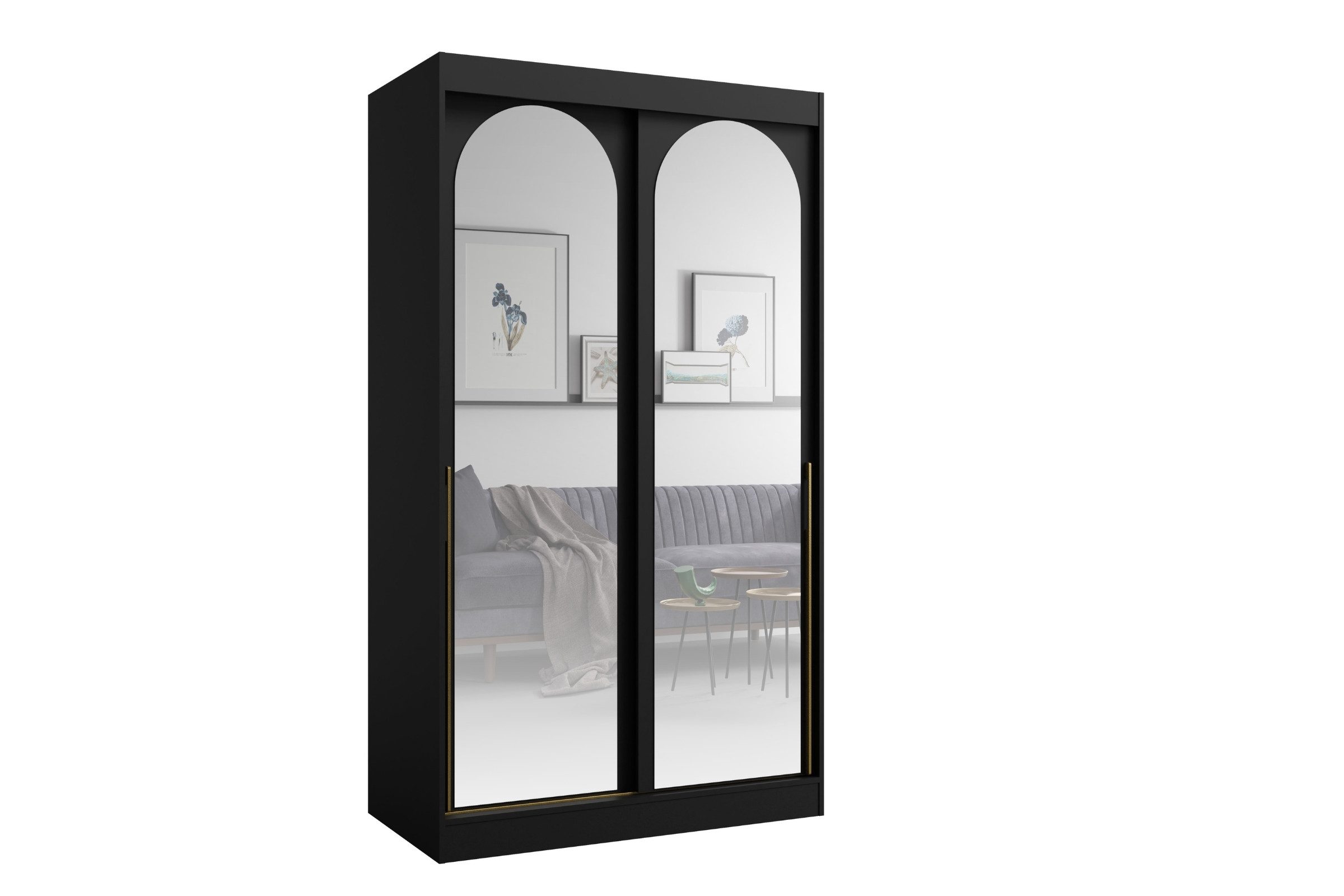 Der Schiebetürenschrank MOSSA verbindet modernes Design mit hoher Funktionalität. Die eleganten Spiegeltüren mit sanft geschwungenem Bogen-Design und edlen Griffen in Gold oder Schwarz verleihen Ihrem Schlafzimmer ein helles und luxuriöses Ambiente.