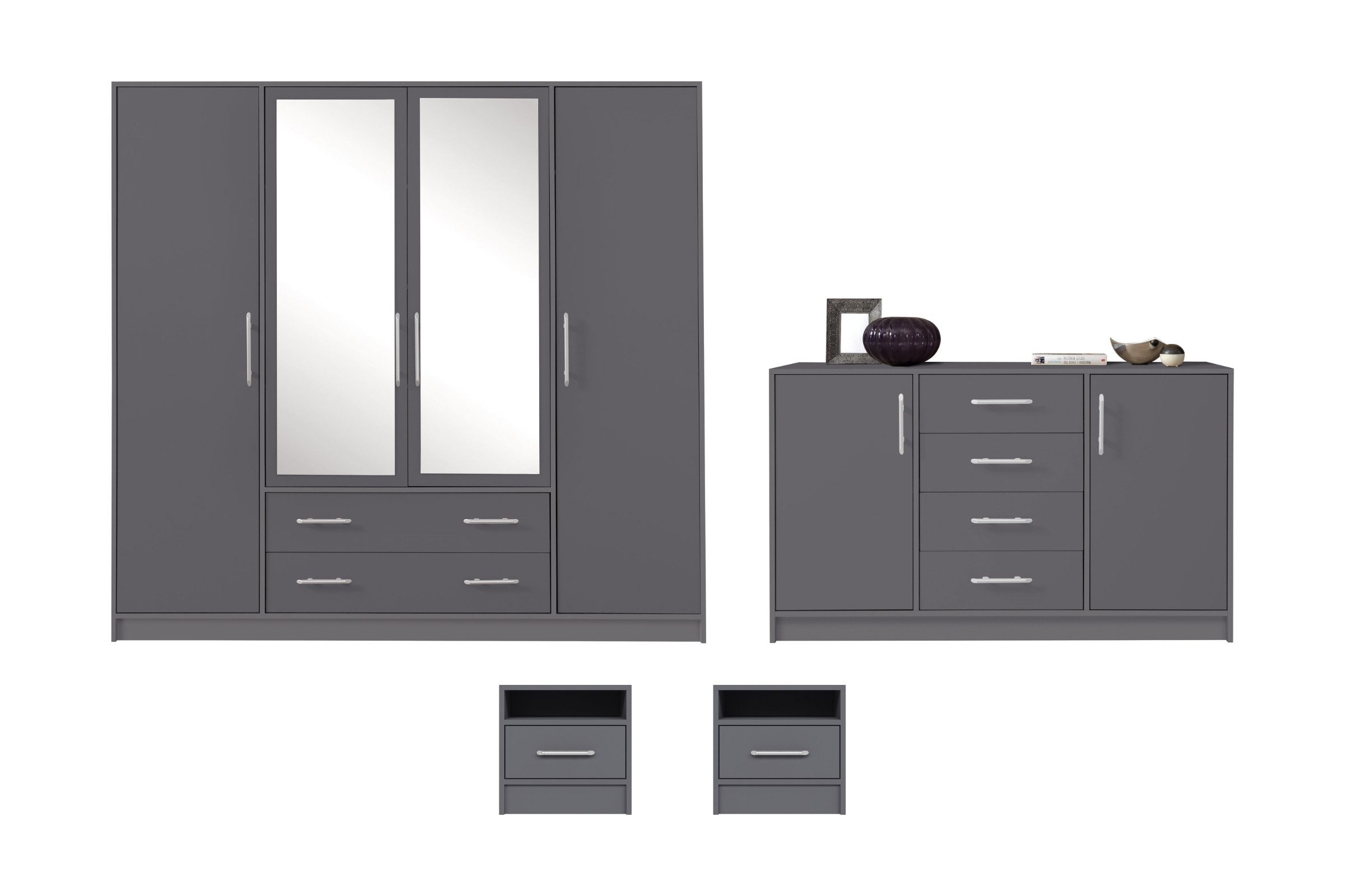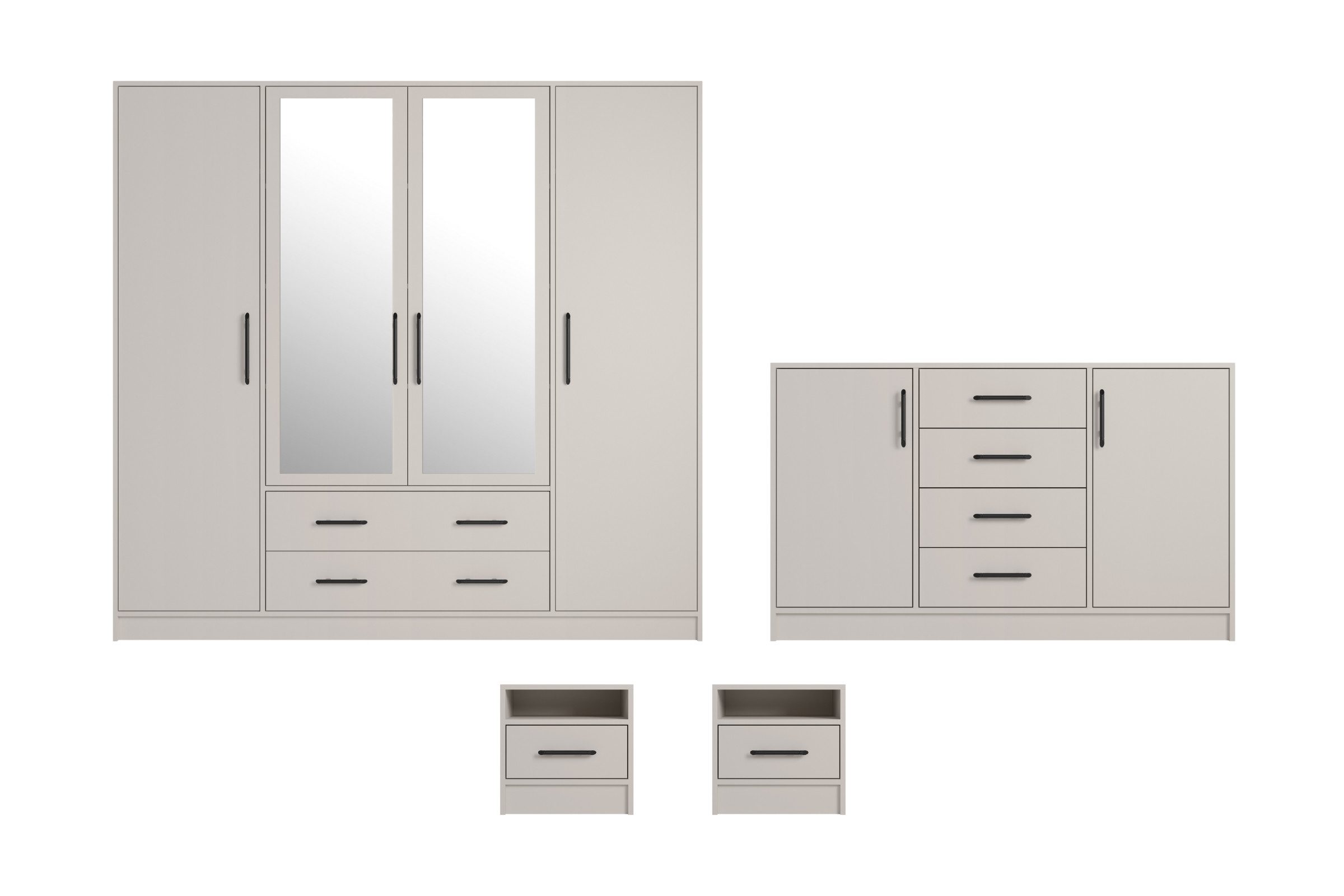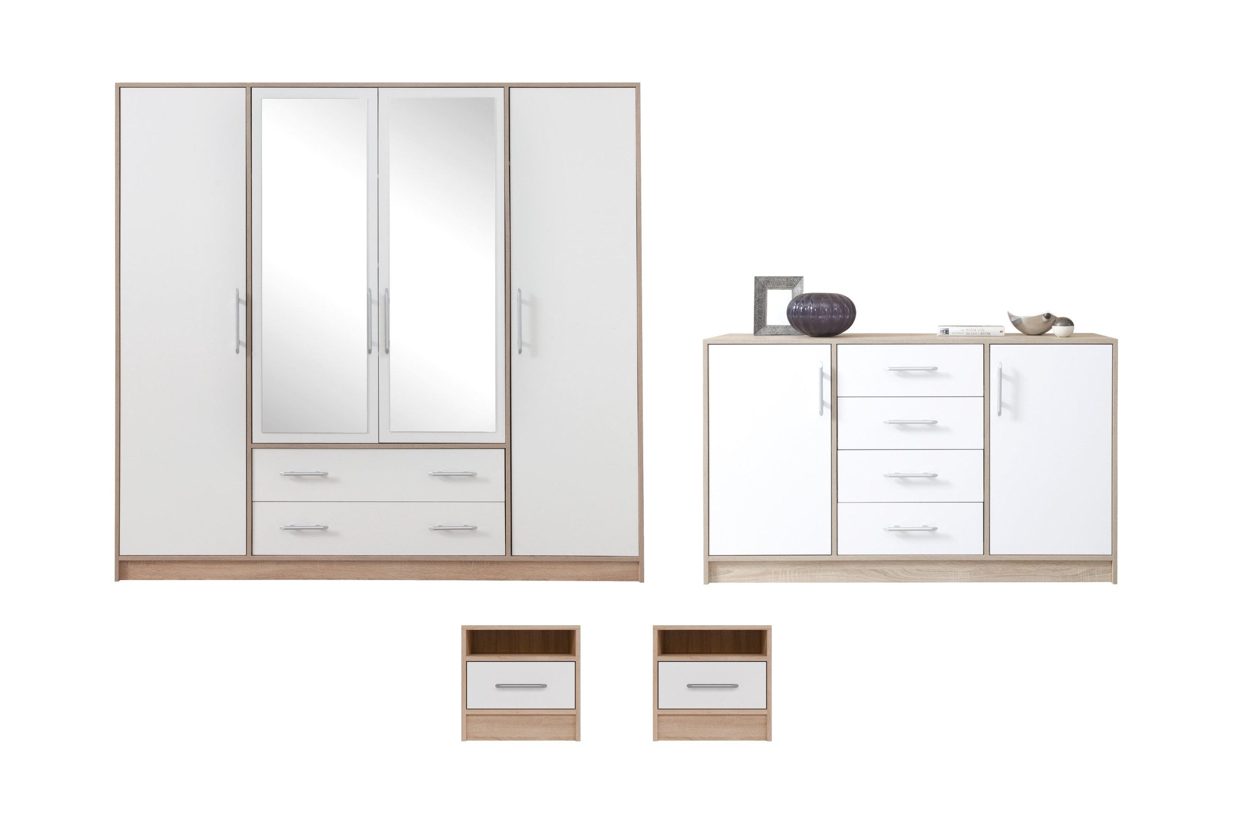 Lieferumfang | Kleiderschrank 4-türig mit Spiegel 200 / 190 / 56 cm Kommode 140 / 84 / 40 cm 2x Nachttisch 40 / 40 / 35 cm |