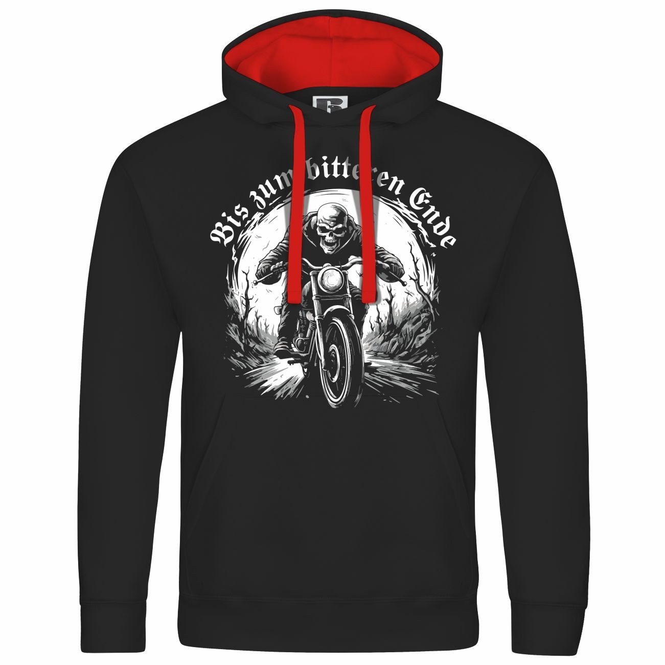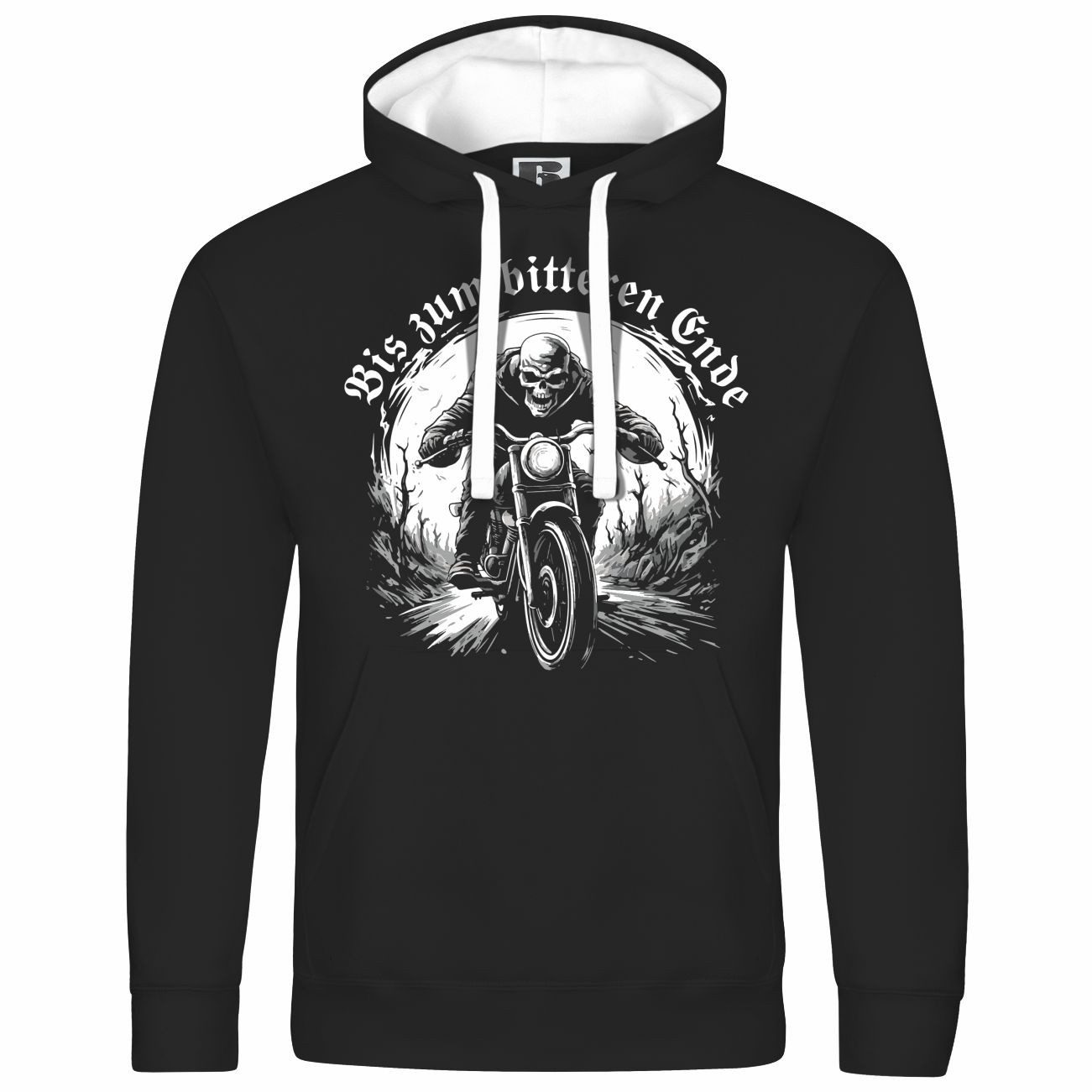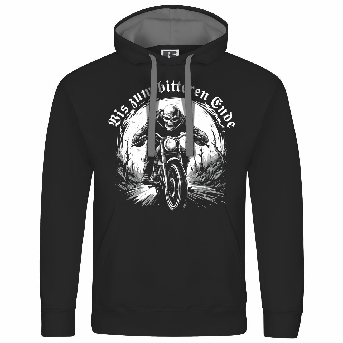 Design des Kapuzenpullovers Das Motiv zeigt einen Schädel auf einem Motorrad mit dem Schriftzug „Bis zum bitteren Ende“. Ein cooler Hoodie für Biker, die Freiheit und Abenteuer lieben!
