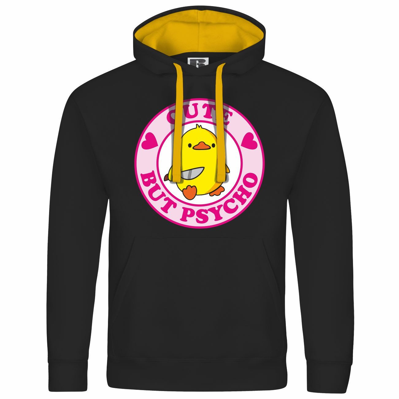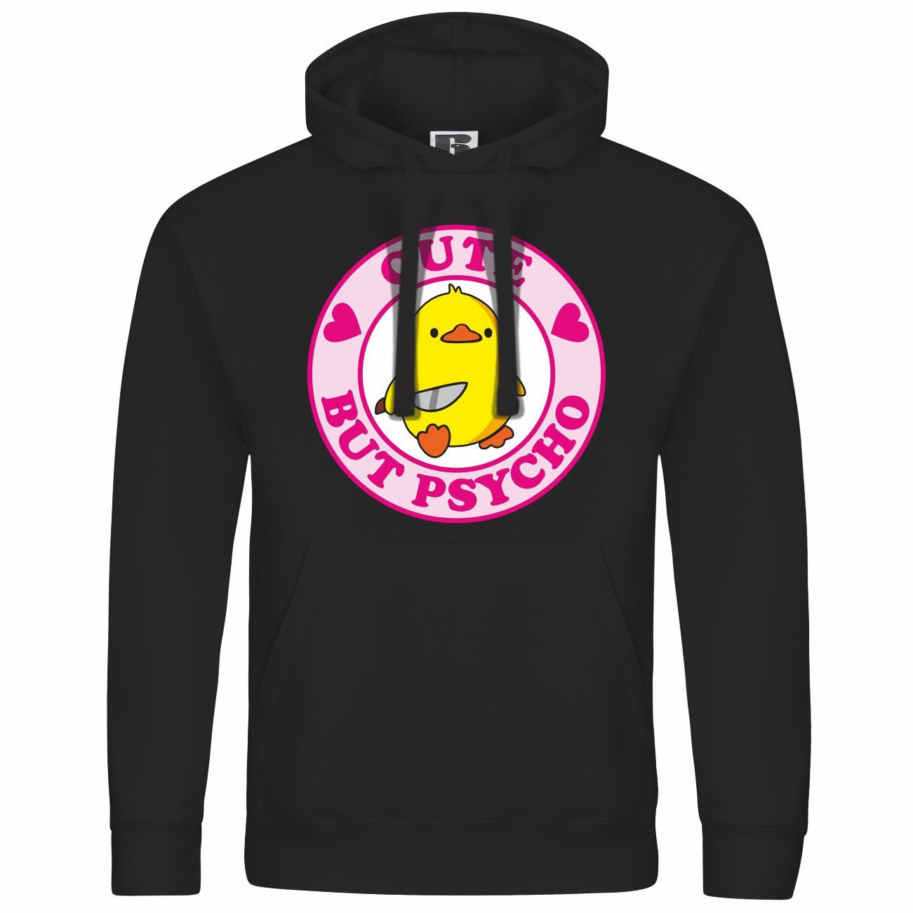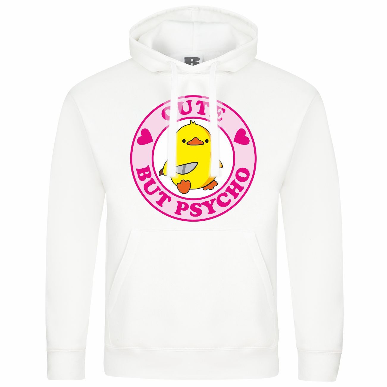 Der Kapuzenpullover zeigt ein niedliches, gelbes Entchen mit einem Messer und den Schriftzug „Cute But Psycho“ in einem pinken Kreis mit Herzen. Perfekt für Humor und Stil in einem Hoodie!
