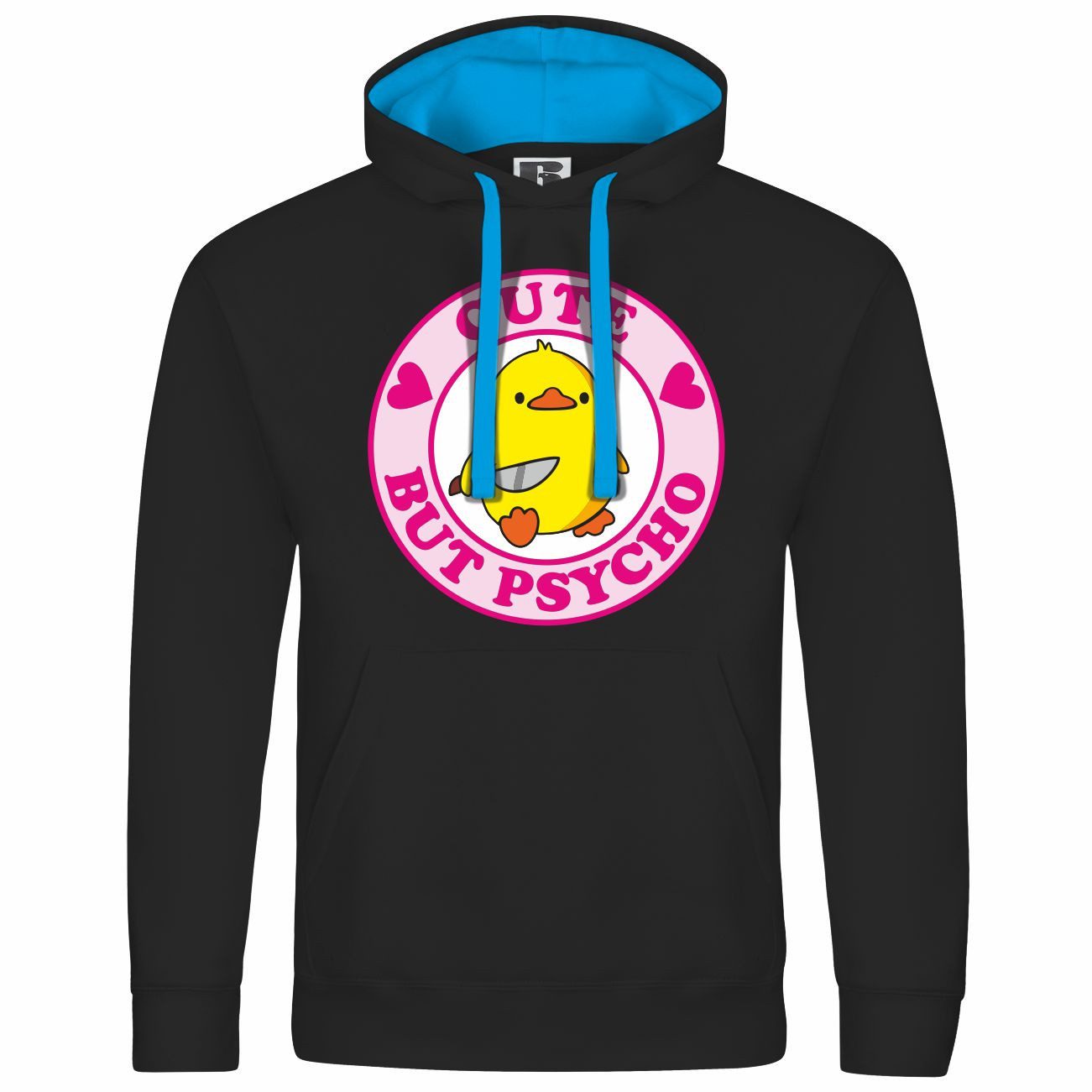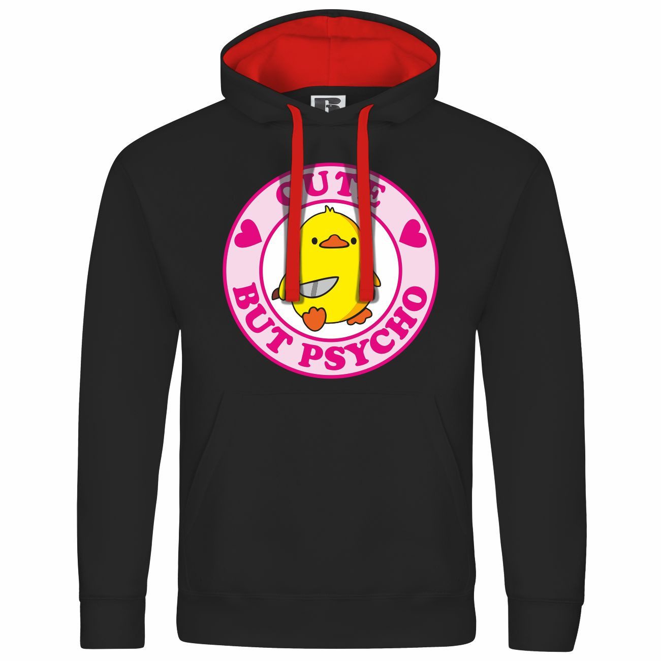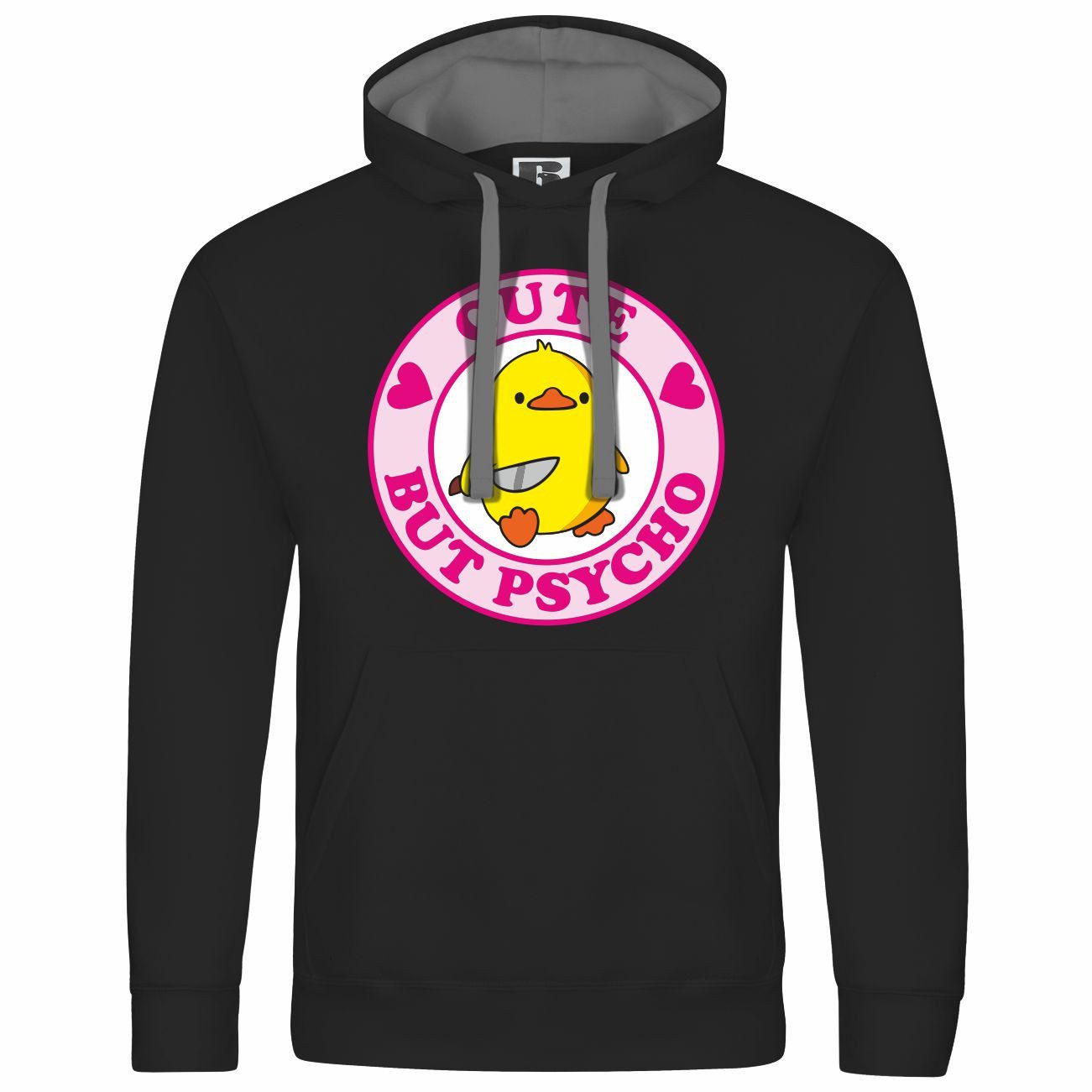 Der Kapuzenpullover zeigt ein niedliches, gelbes Entchen mit einem Messer und den Schriftzug „Cute But Psycho“ in einem pinken Kreis mit Herzen. Perfekt für Humor und Stil in einem Hoodie!