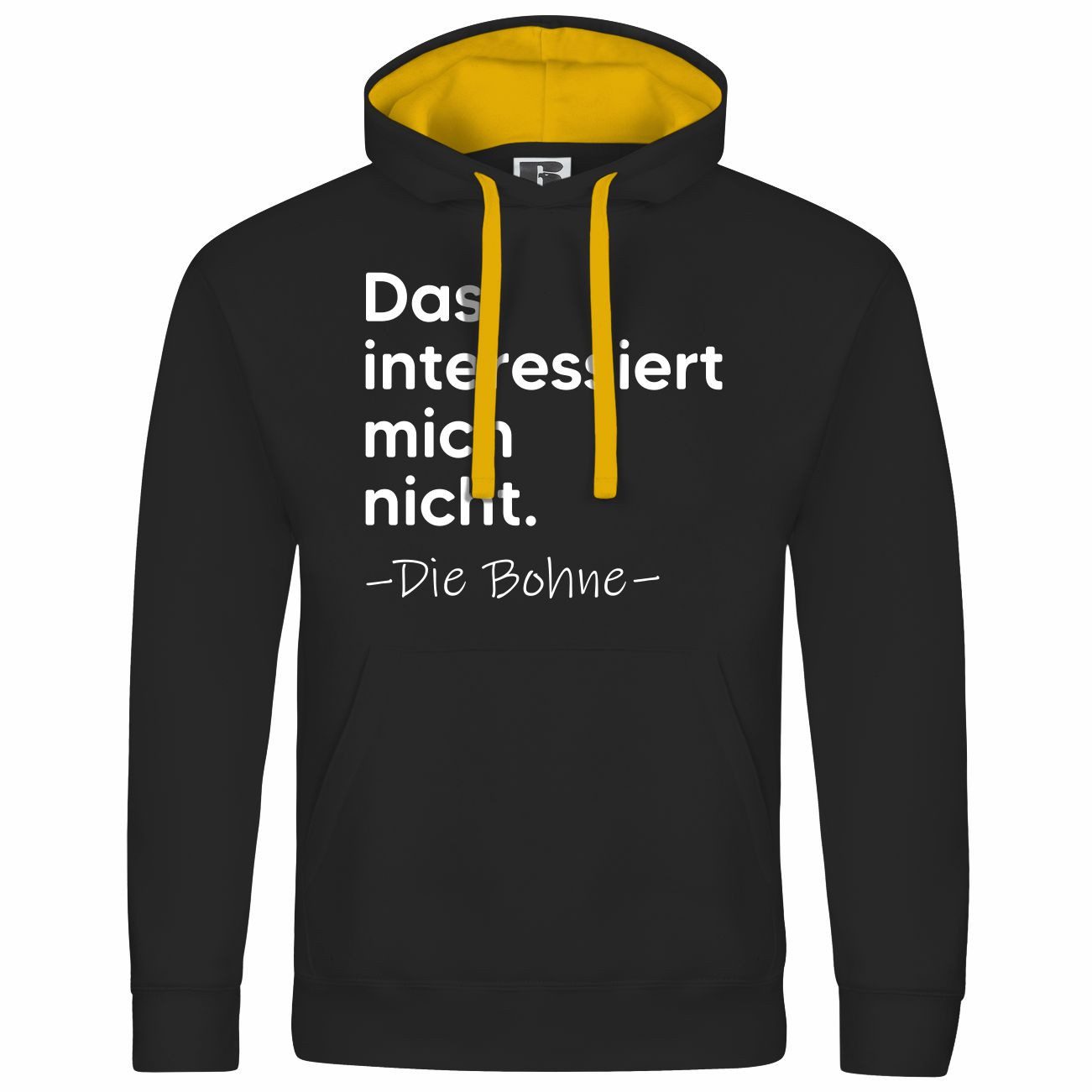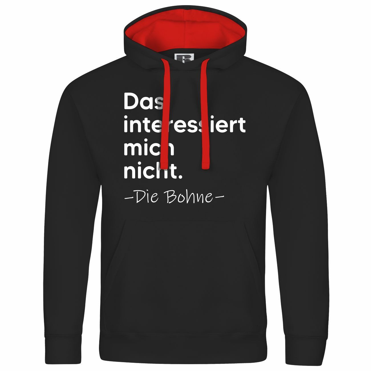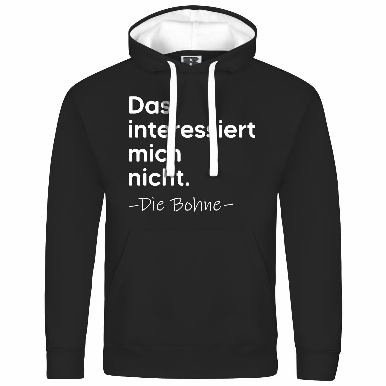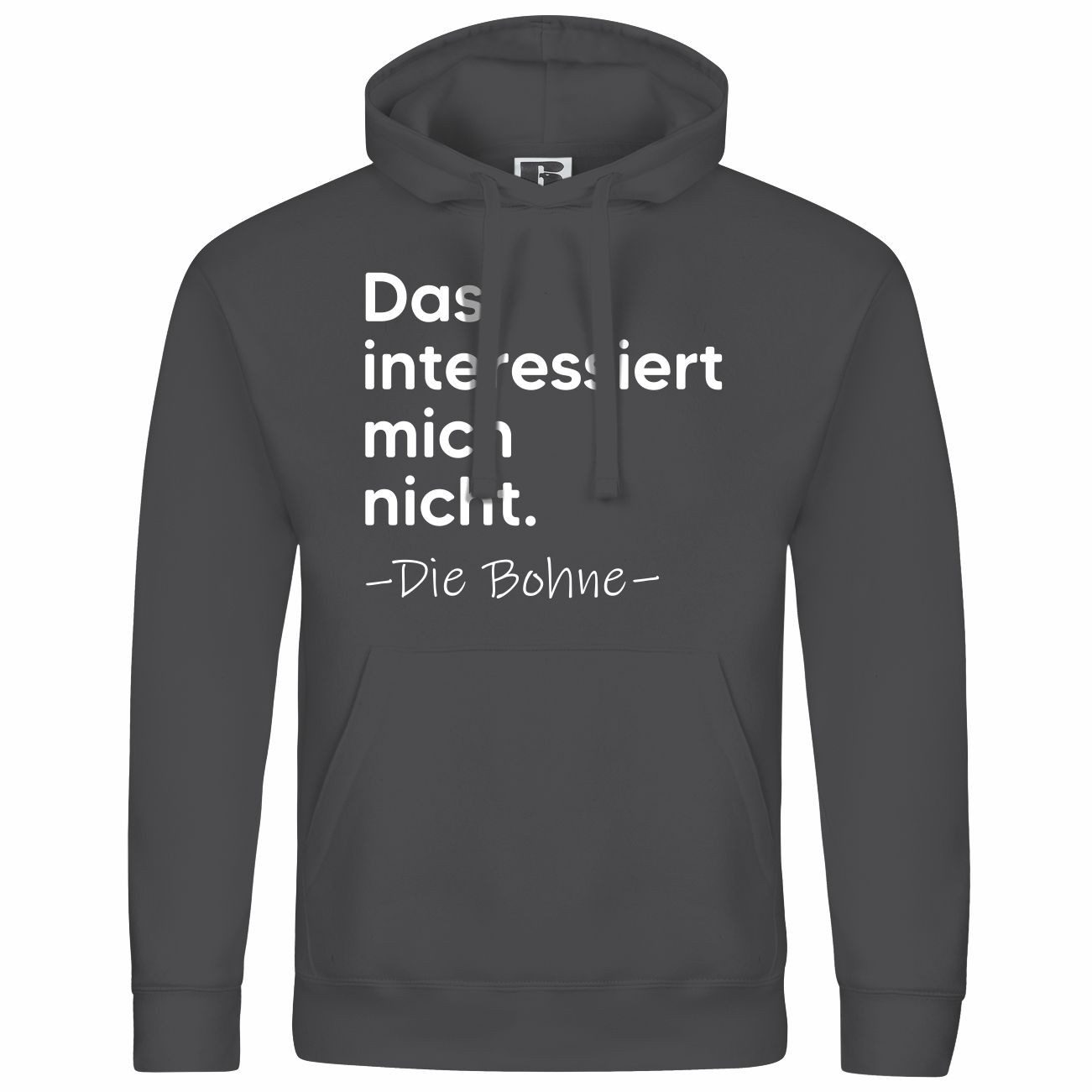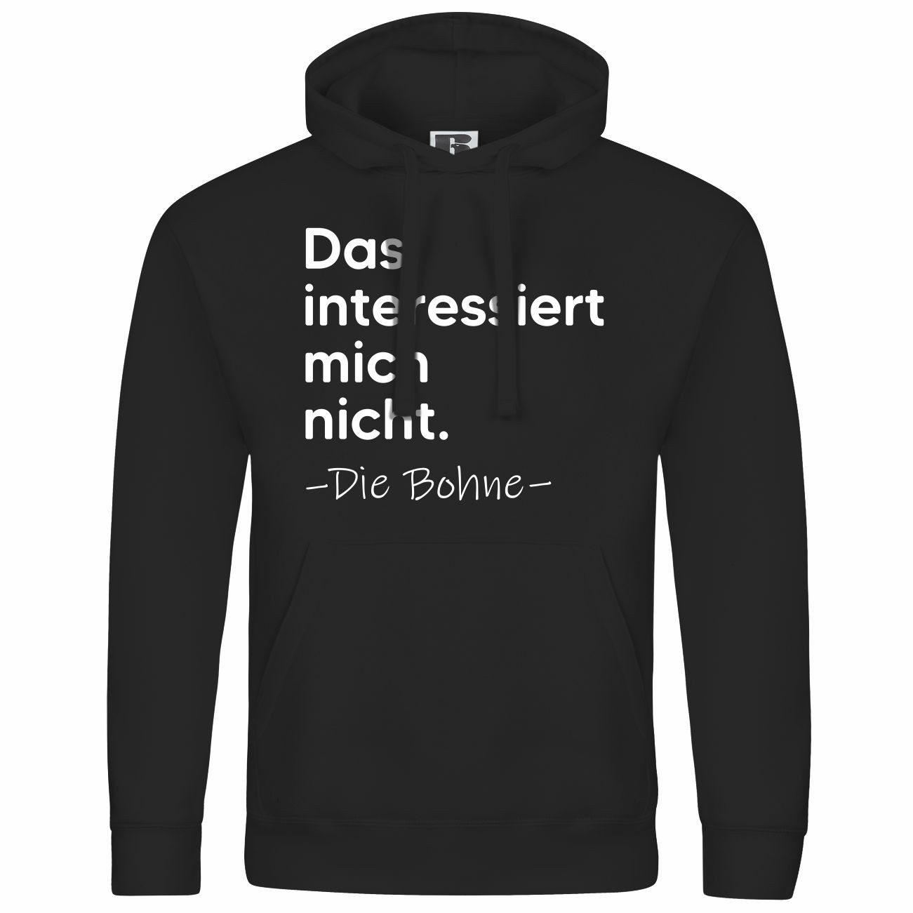 Das Kapuzenpullover-Motiv zeigt den humorvollen Spruch: „Das interessiert mich nicht. - Die Bohne“. Ein minimalistisches, witziges Design, perfekt für alle, die ein Statement mit Humor setzen möchten!