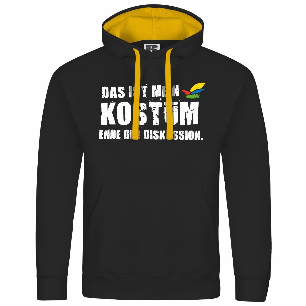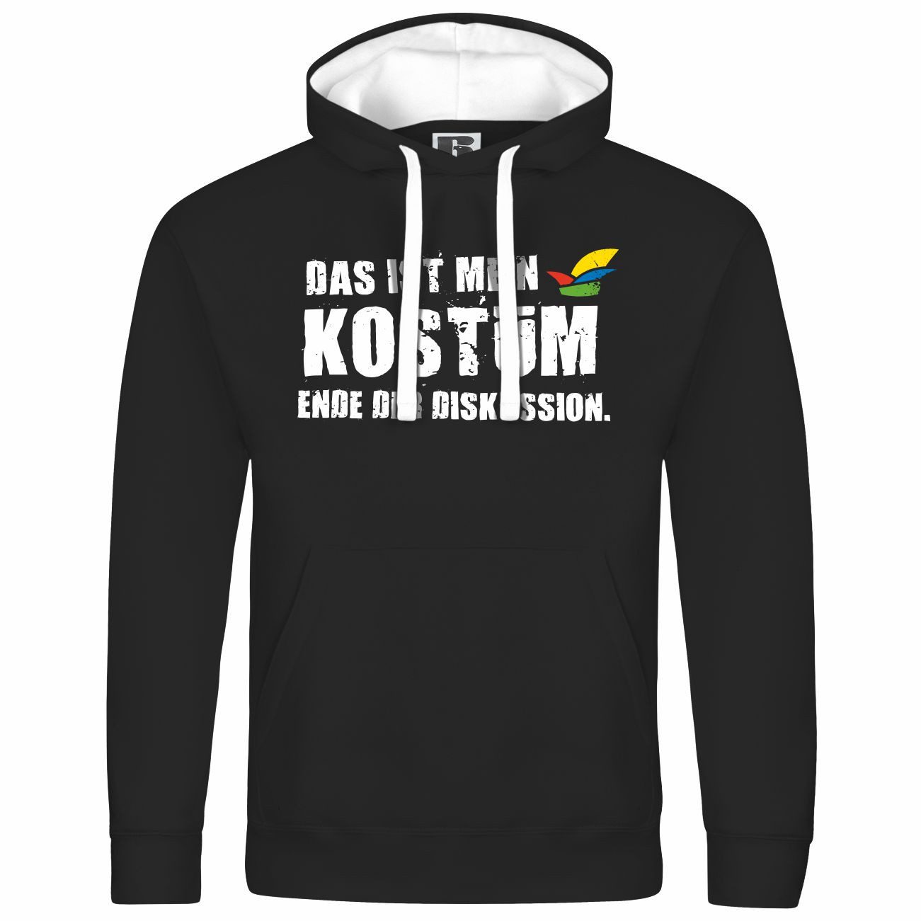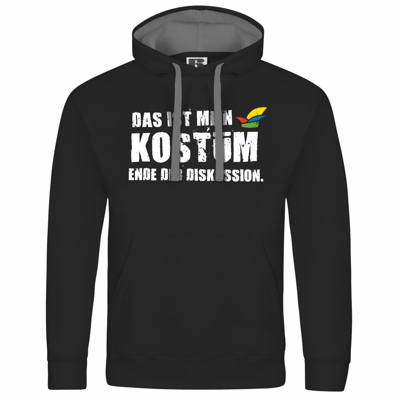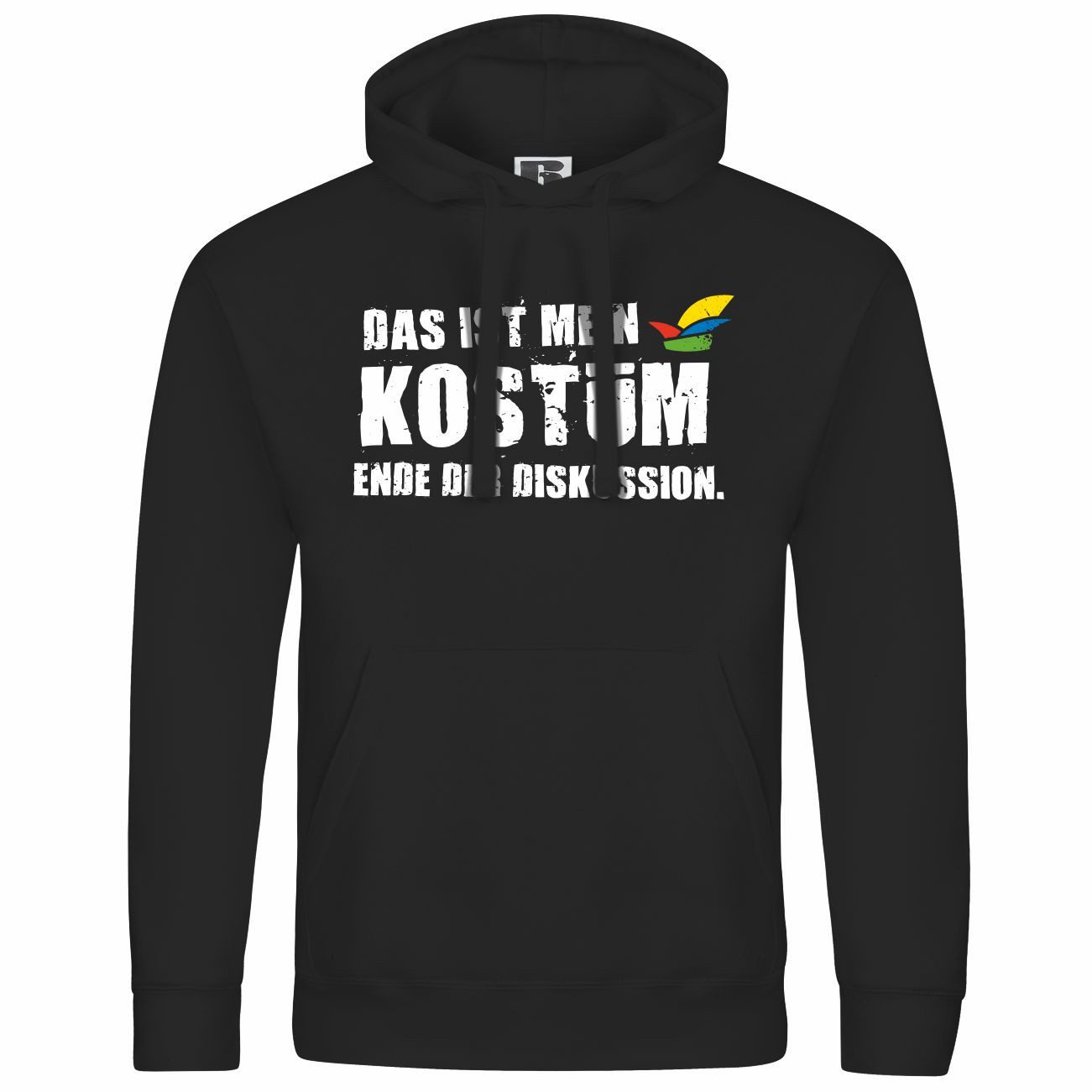 Der Kapuzenpullover zeigt den witzigen Spruch „Das ist mein Kostüm – Ende der Diskussion“ in auffälliger, weißer Schrift mit einer bunten Feder. Ideal für Karneval und Fasching!