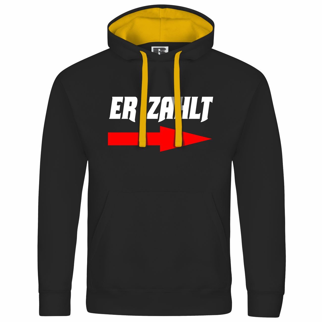 Das Motiv zeigt den humorvollen Schriftzug „Er Zahlt“ in großen Buchstaben mit einem auffälligen Pfeil, der nach rechts zeigt. Perfekt für Freundesrunden mit einem Augenzwinkern!