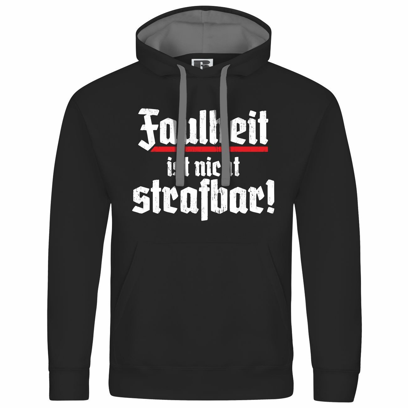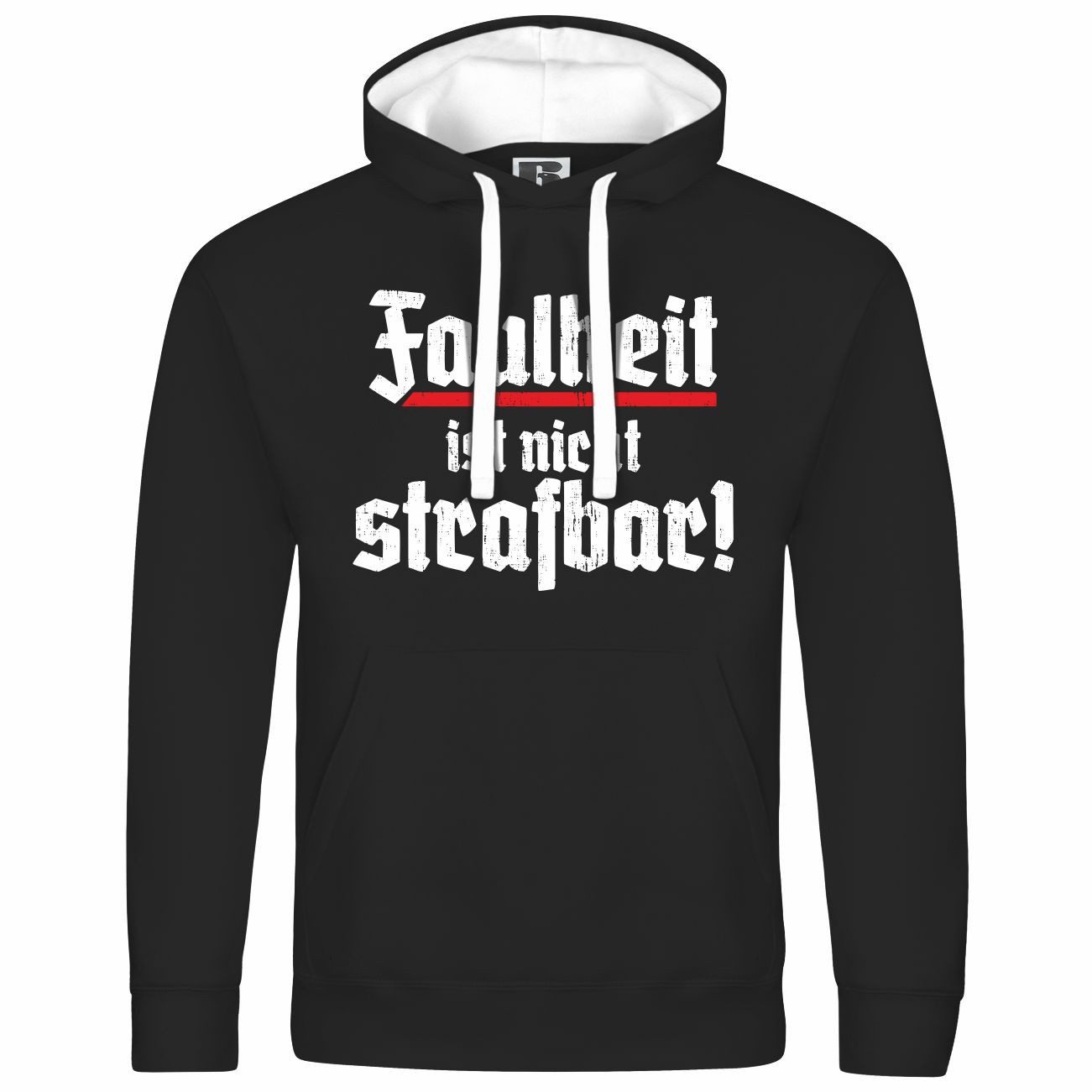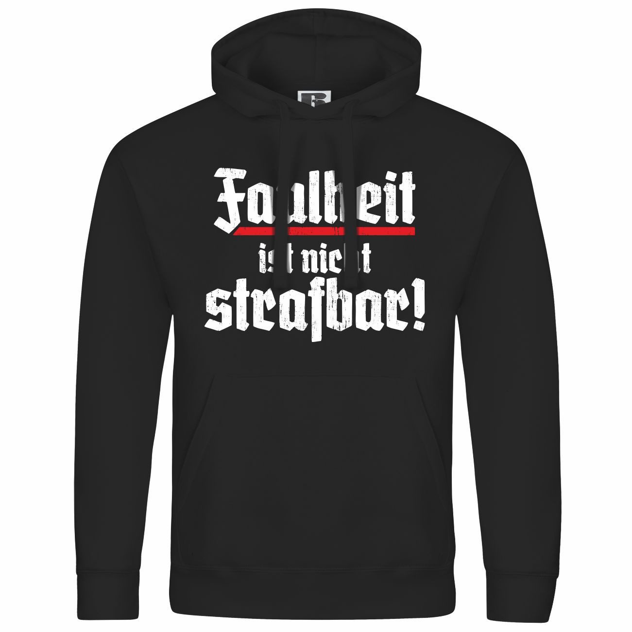 Das Motiv auf diesem Kapuzenpullover zeigt den provokanten Schriftzug "Faulheit ist nicht strafbar!" in einer auffälligen, kontrastreichen Typografie. Perfekt für humorvolle Statements im Alltag.