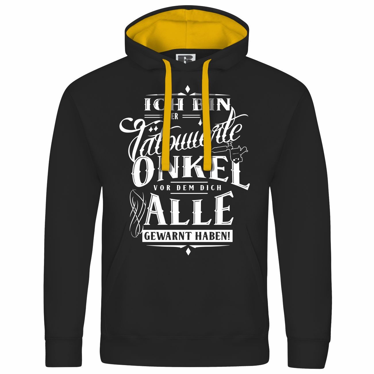 Der Kapuzenpullover zeigt den Schriftzug „Ich bin der tätowierte Onkel, vor dem dich alle gewarnt haben!“ und kombiniert ihn mit stilvollen Tattoo-Elementen. Perfekt für selbstbewusste Onkel!