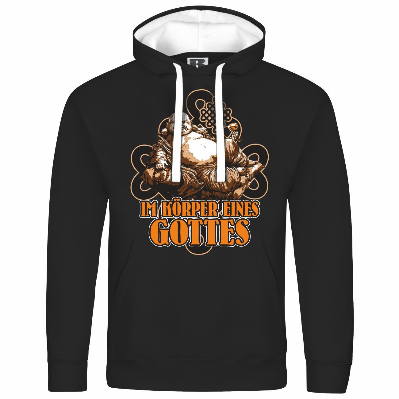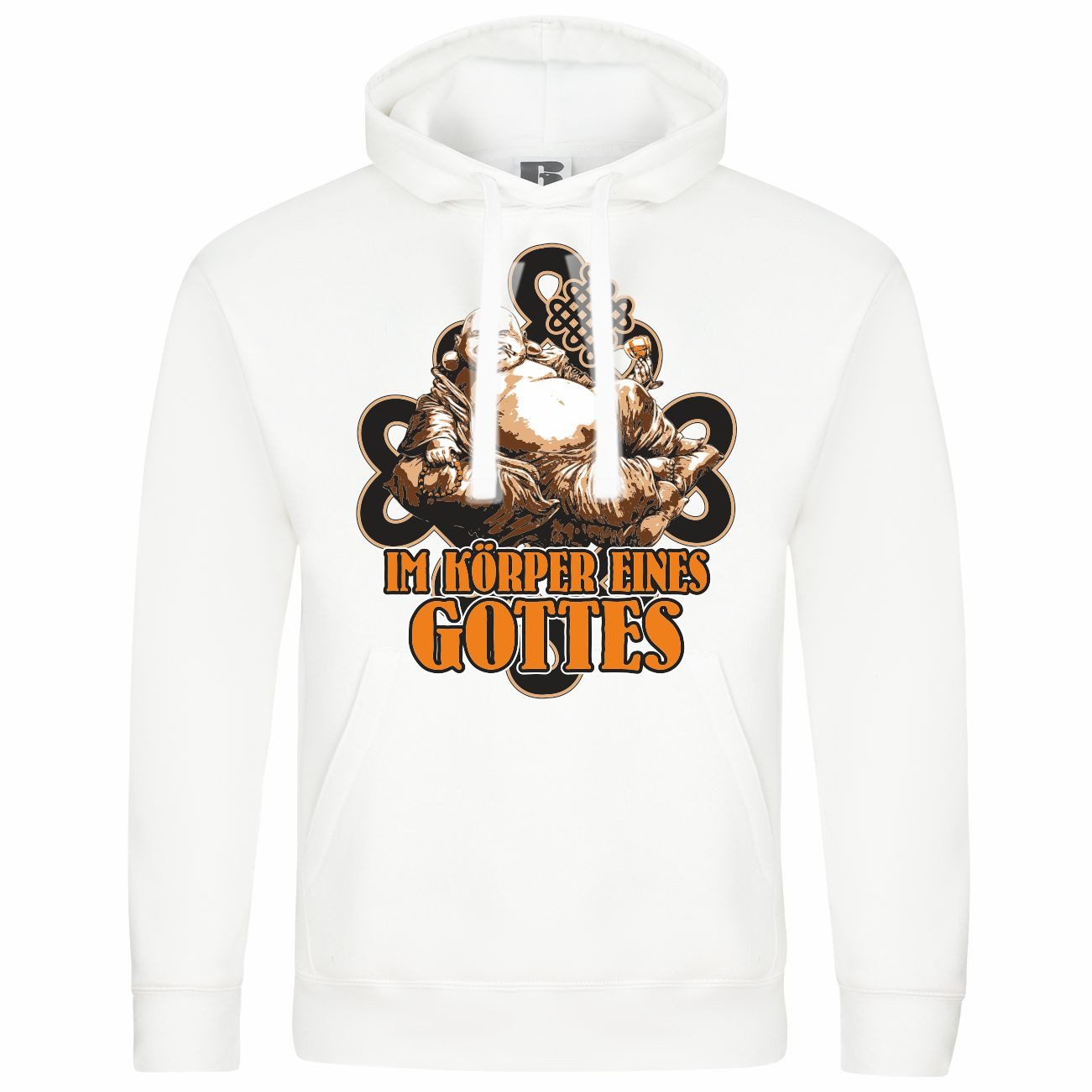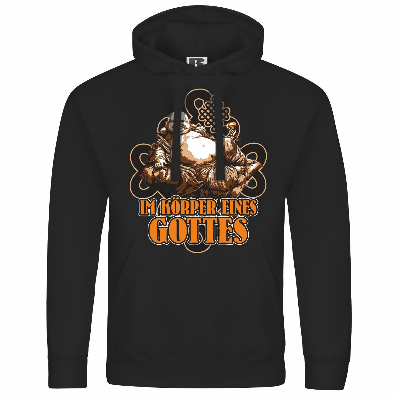 Dieser Kapuzenpullover zeigt ein humorvolles Design mit einem Buddha und dem Spruch „Im Körper eines Gottes“. Perfekt für alle, die stolz zu ihrem Körper stehen und Selbstbewusstsein mit Humor verbinden.