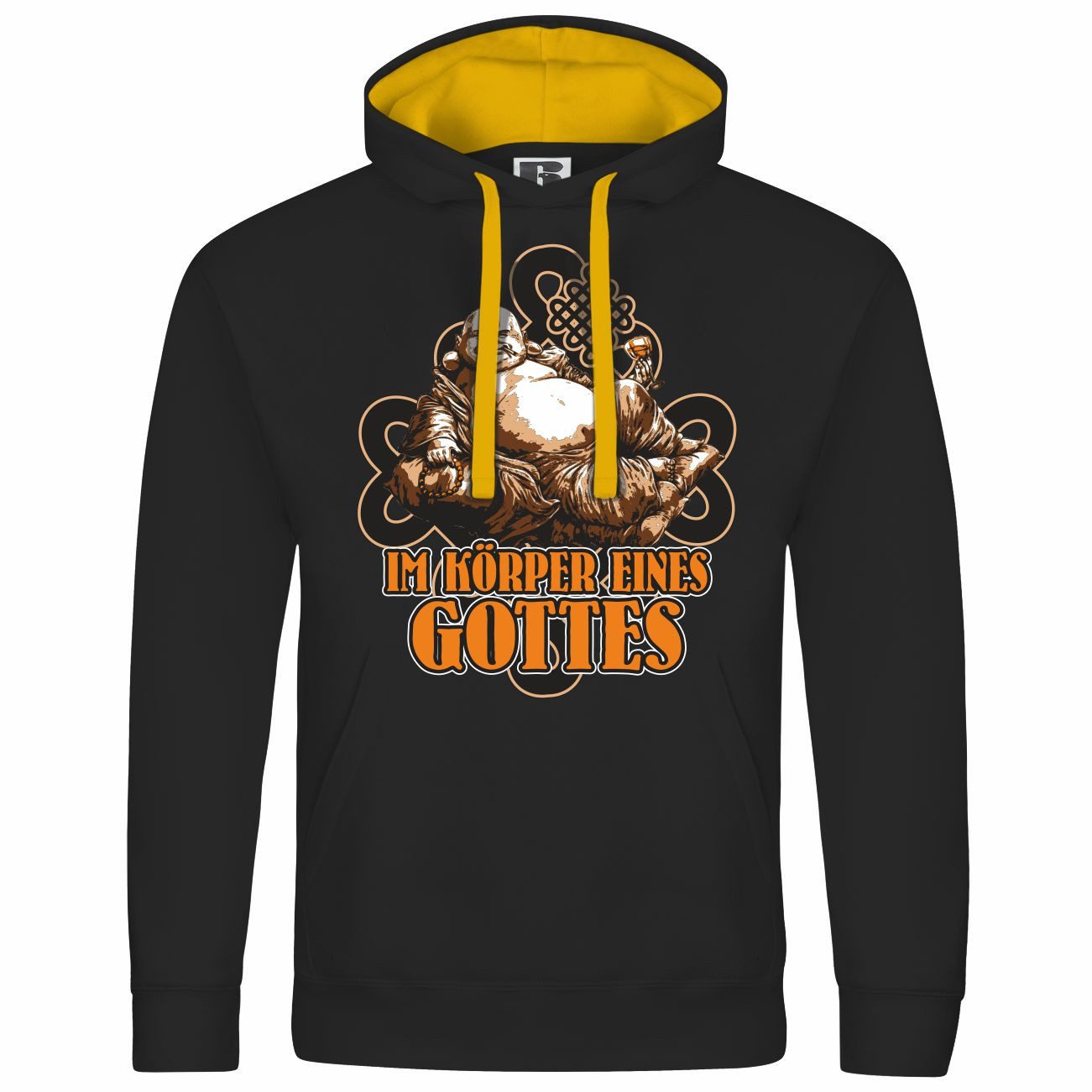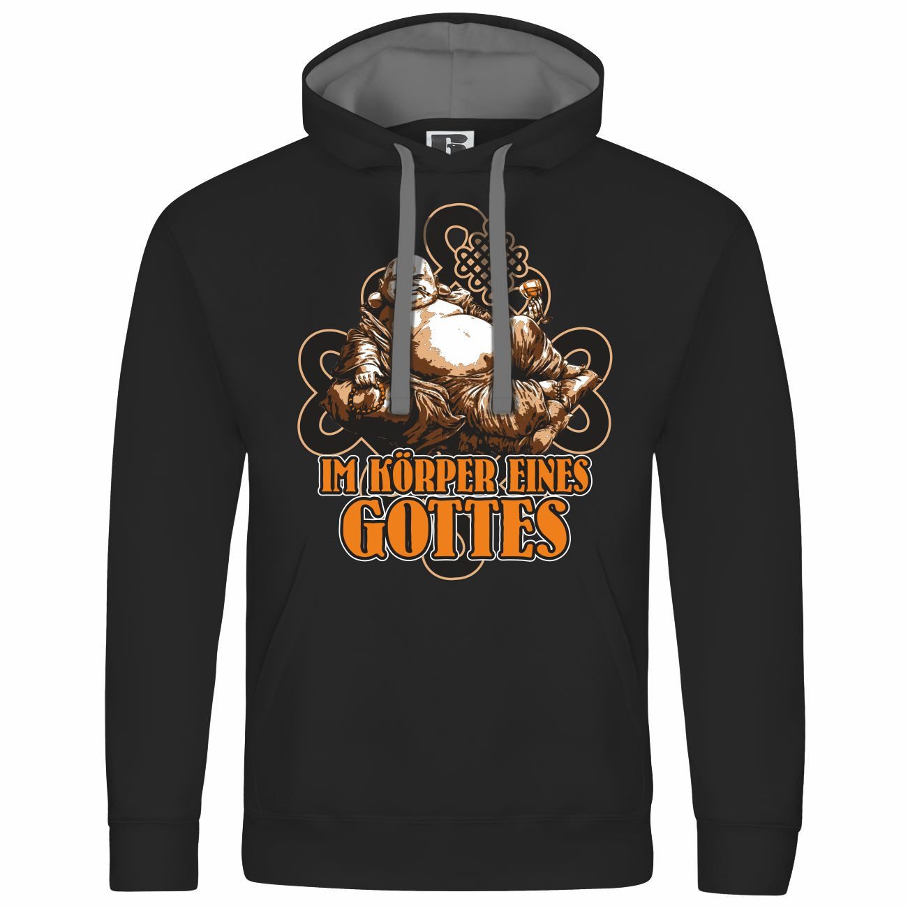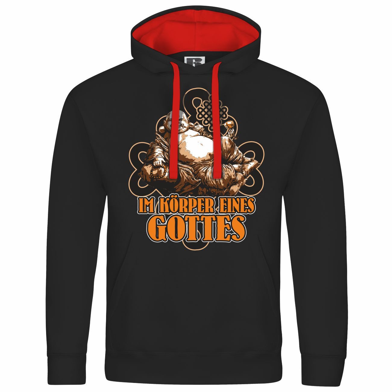 Dieser Kapuzenpullover zeigt ein humorvolles Design mit einem Buddha und dem Spruch „Im Körper eines Gottes“. Perfekt für alle, die stolz zu ihrem Körper stehen und Selbstbewusstsein mit Humor verbinden.