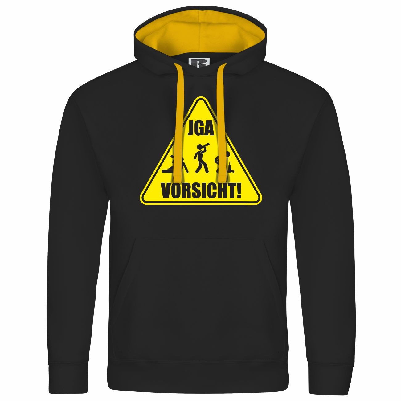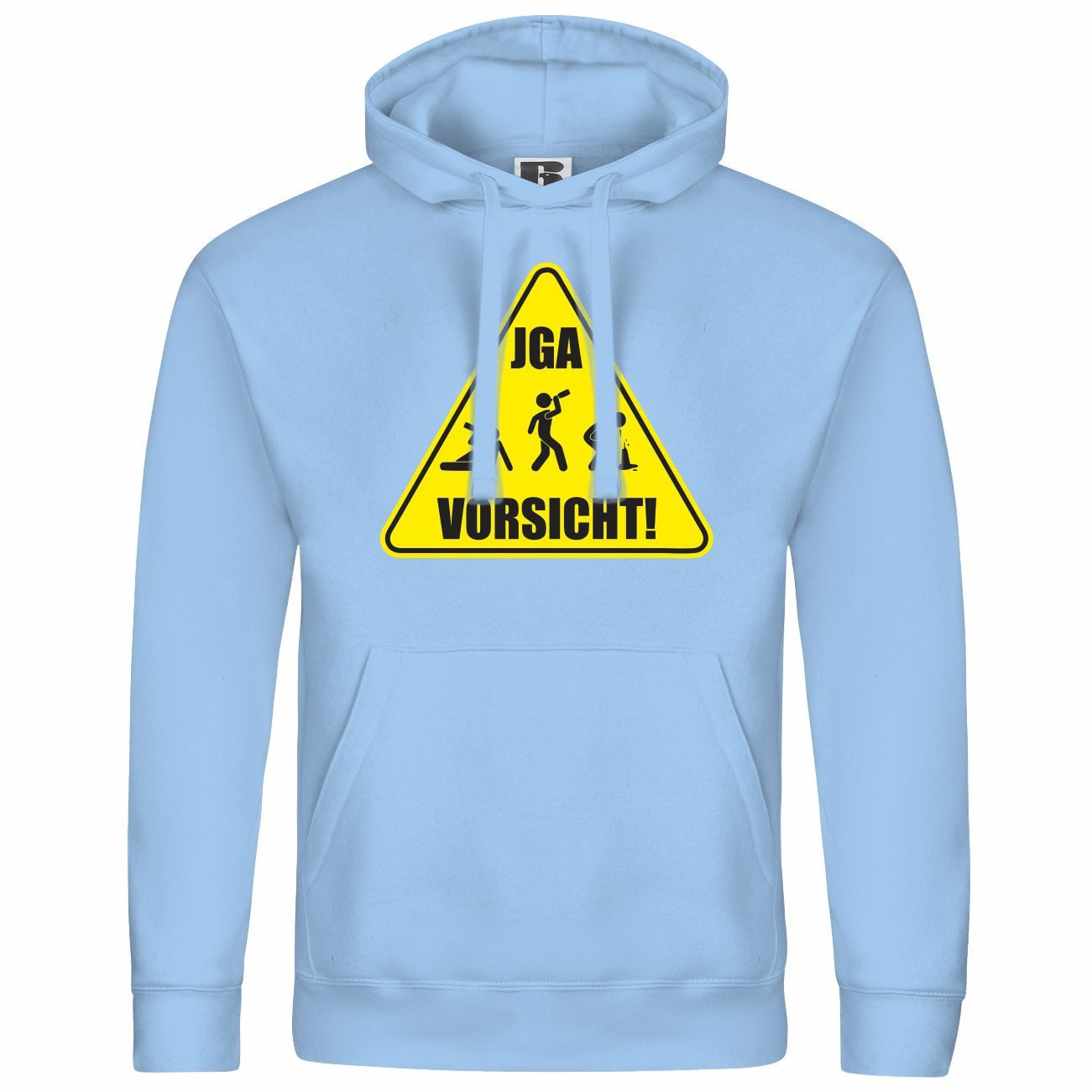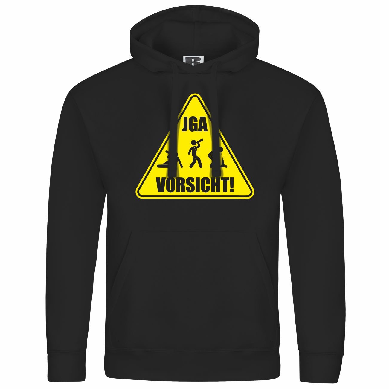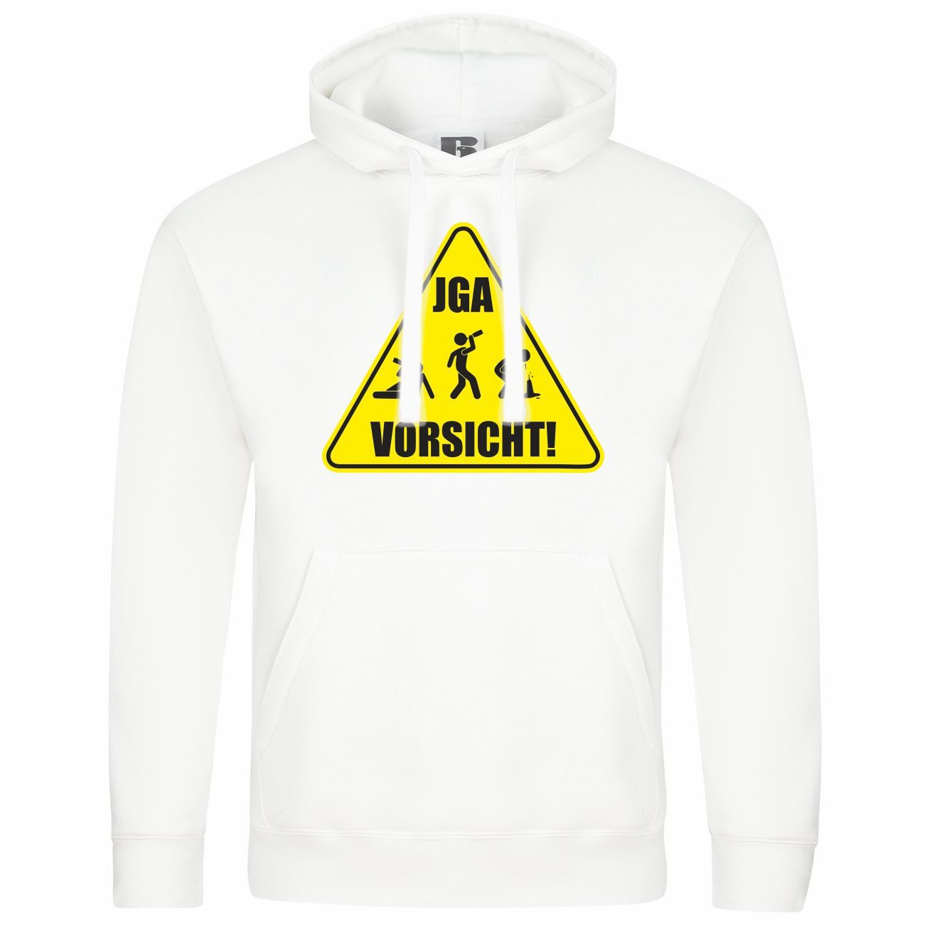 Das Motiv auf diesem Kapuzenpullover zeigt ein gelbes Warnschild mit der Aufschrift "JGA VORSICHT!". Piktogramme symbolisieren typische Party- und Trinkaktionen – perfekt für den Junggesellenabschied!