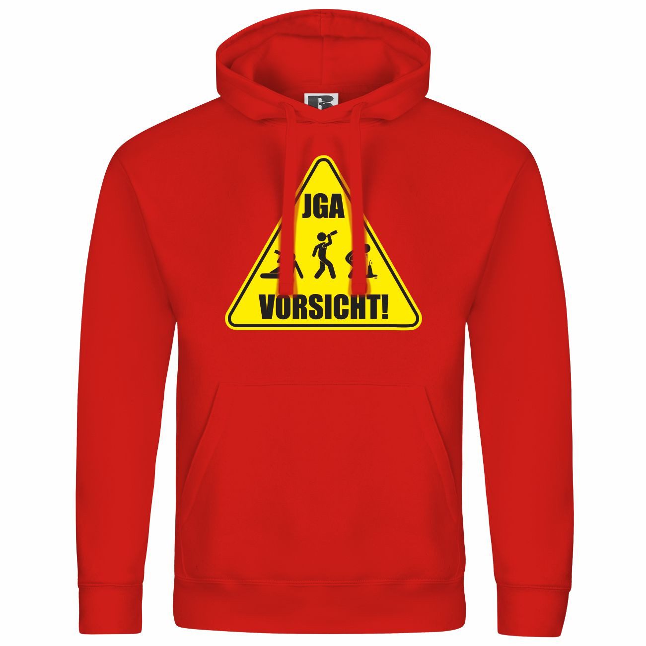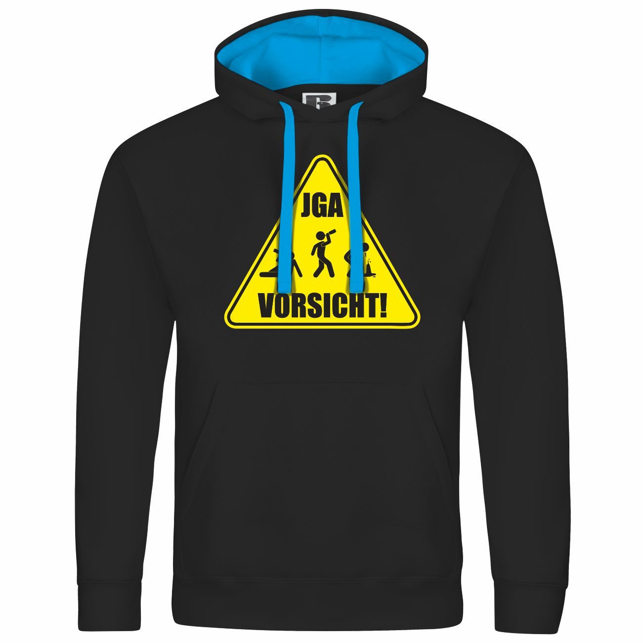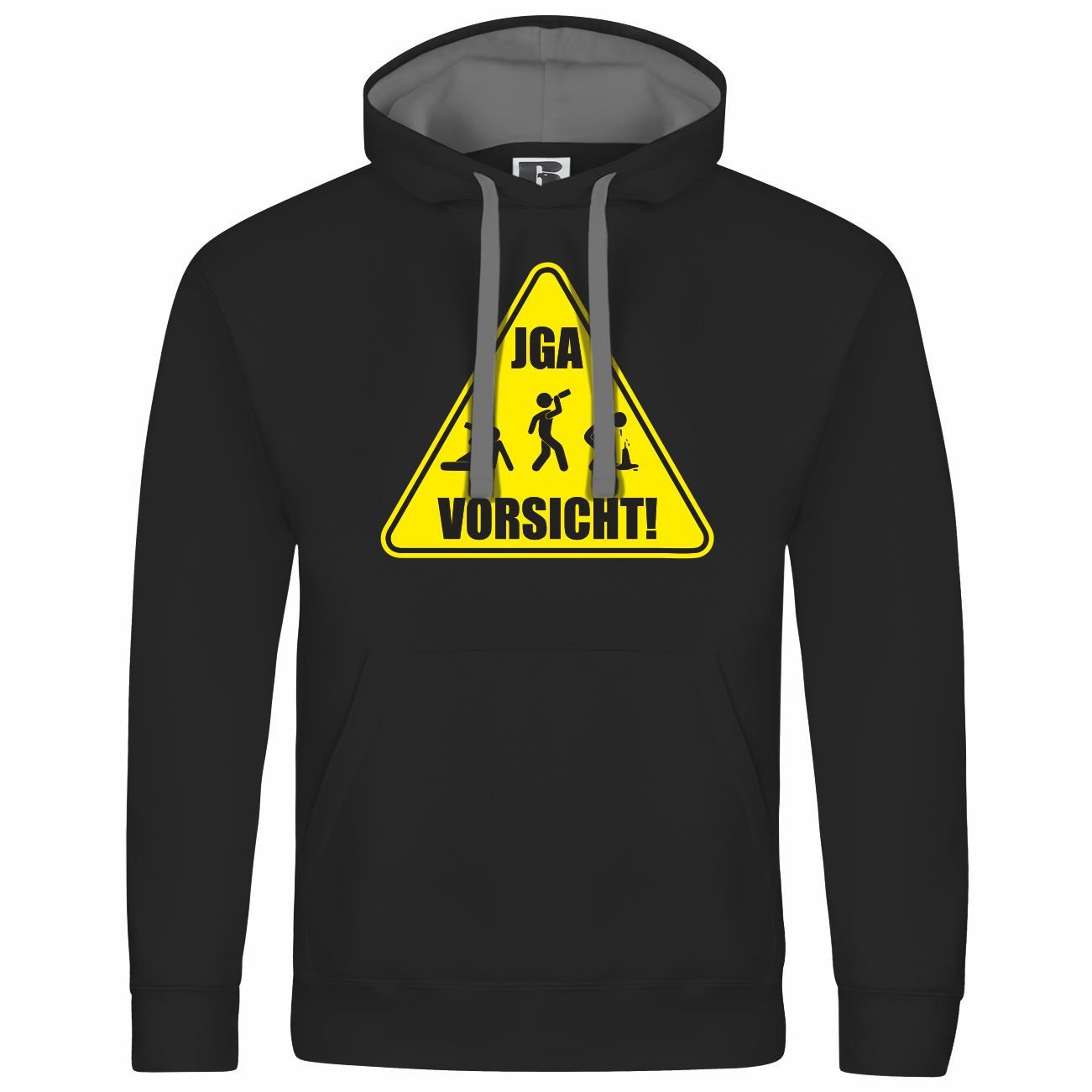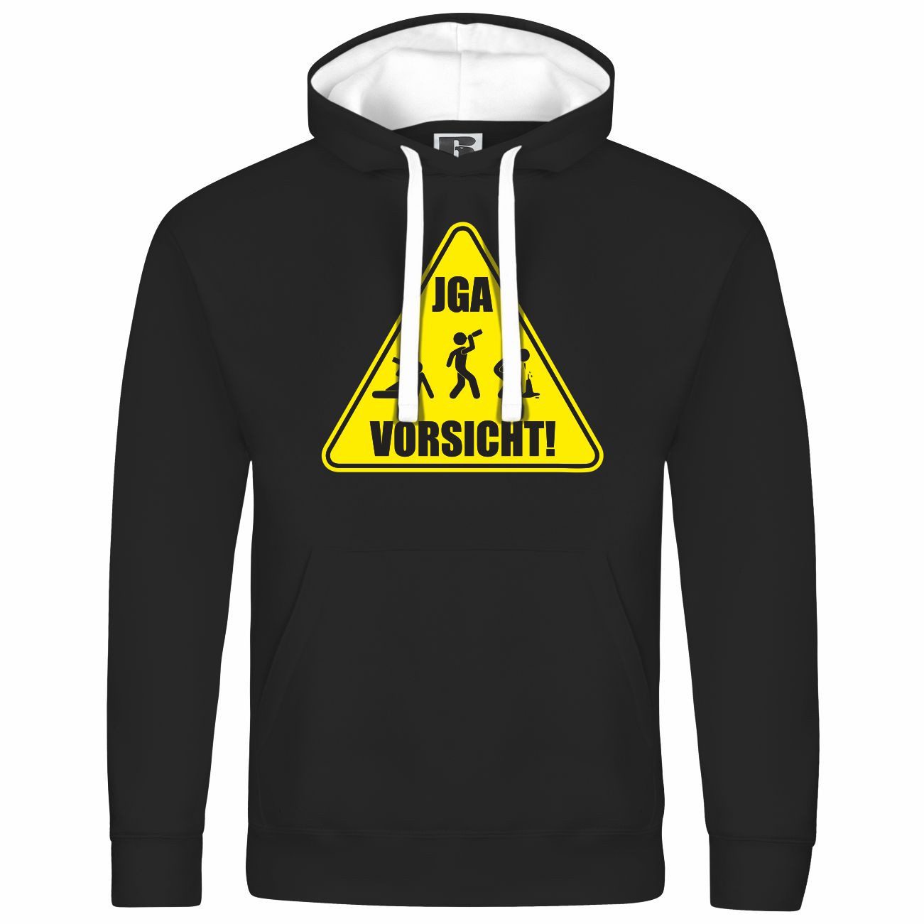Das Motiv auf diesem Kapuzenpullover zeigt ein gelbes Warnschild mit der Aufschrift "JGA VORSICHT!". Piktogramme symbolisieren typische Party- und Trinkaktionen – perfekt für den Junggesellenabschied!
