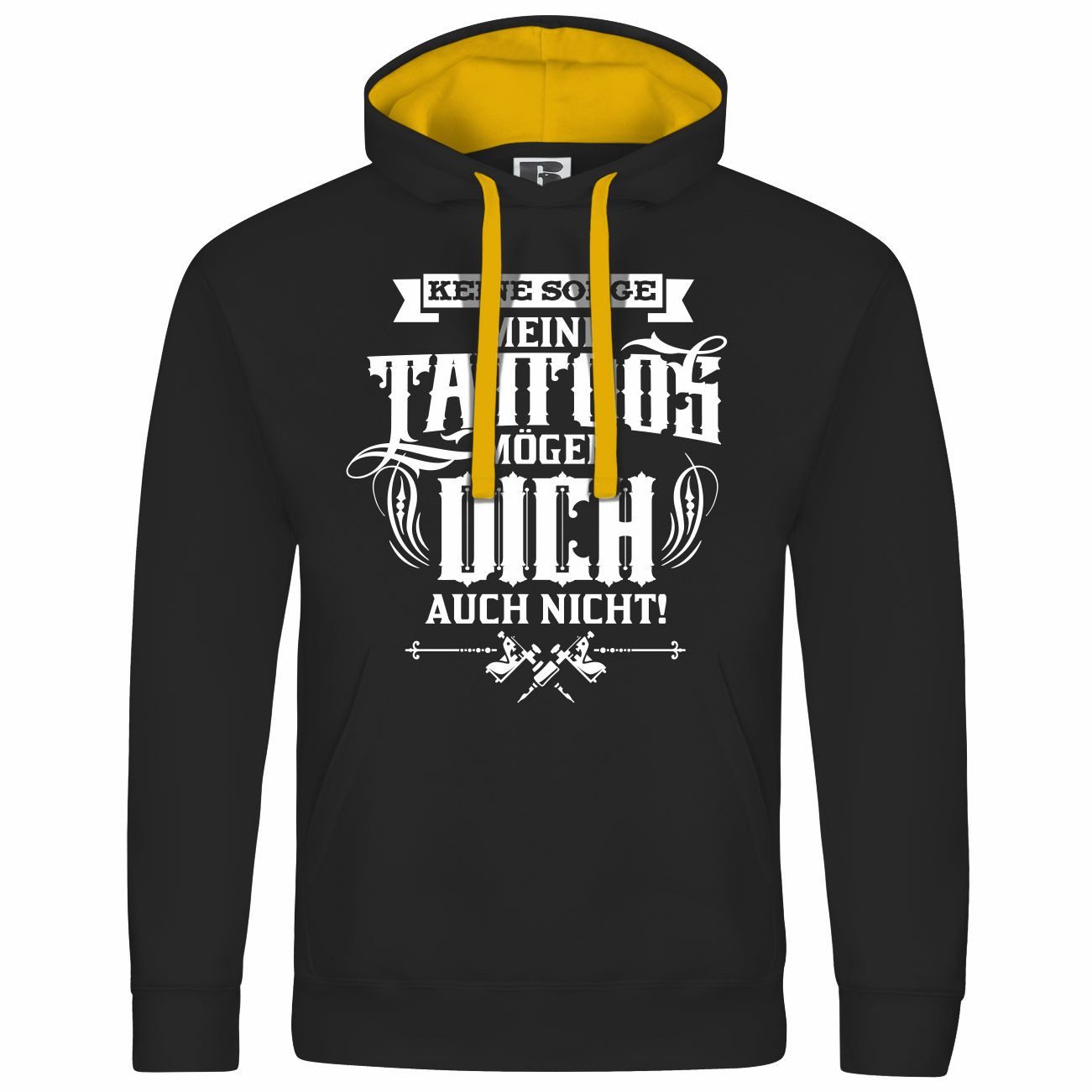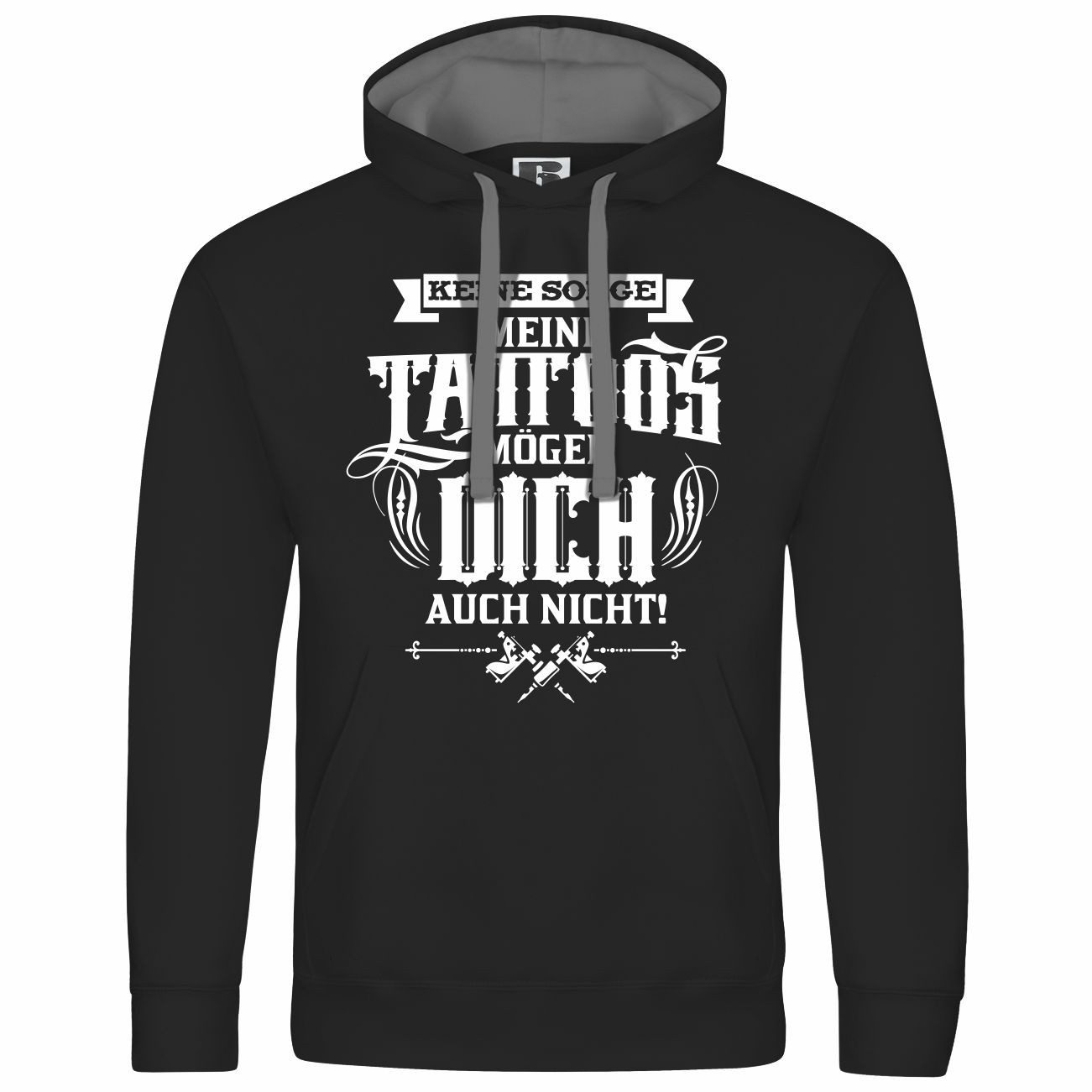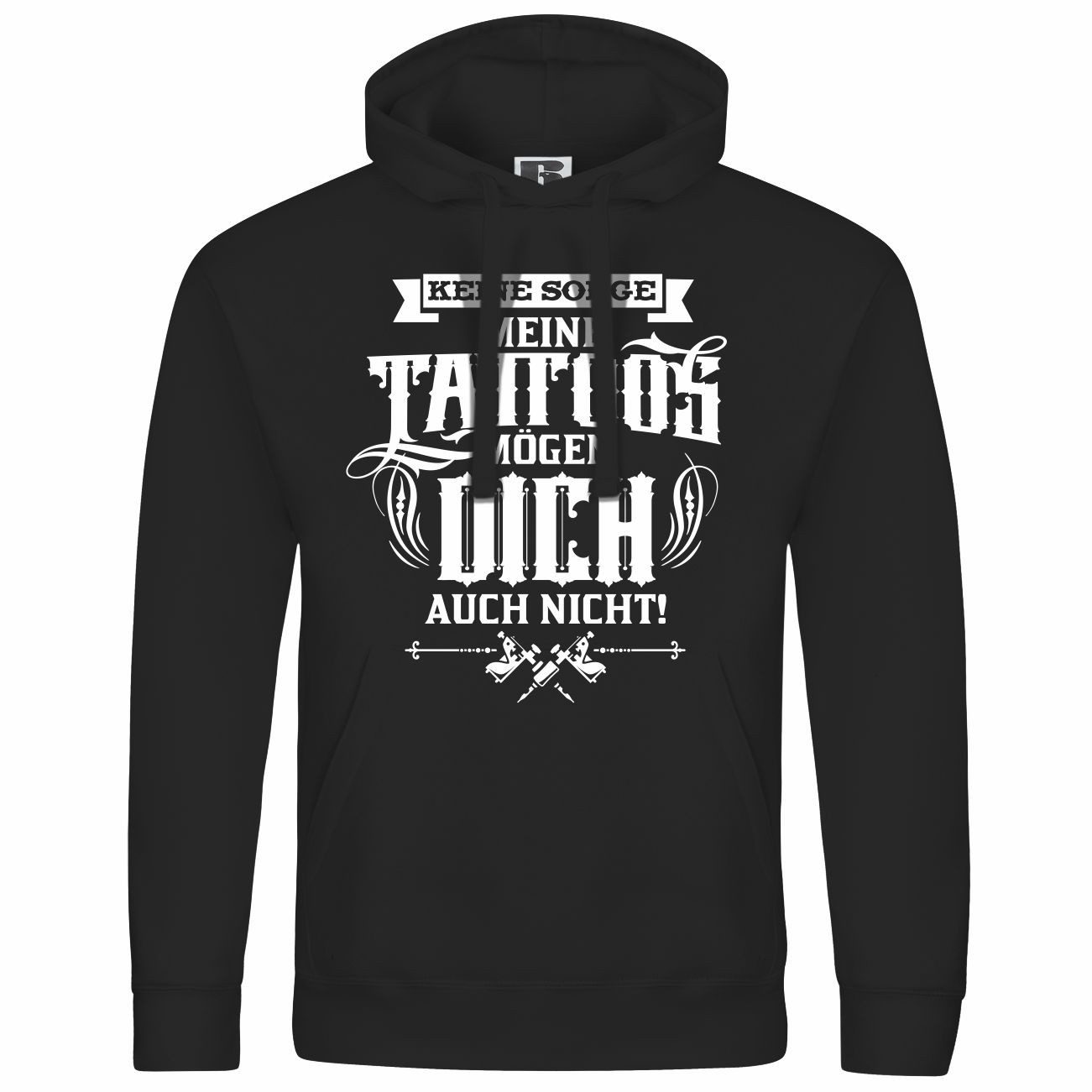 Der Kapuzenpullover zeigt das Statement „Keine Sorge, meine Tattoos mögen dich auch nicht!“ in auffälliger Schrift mit Tattoo-Elementen und zwei tätowierten Maschinen. Perfekt für Tattoo-