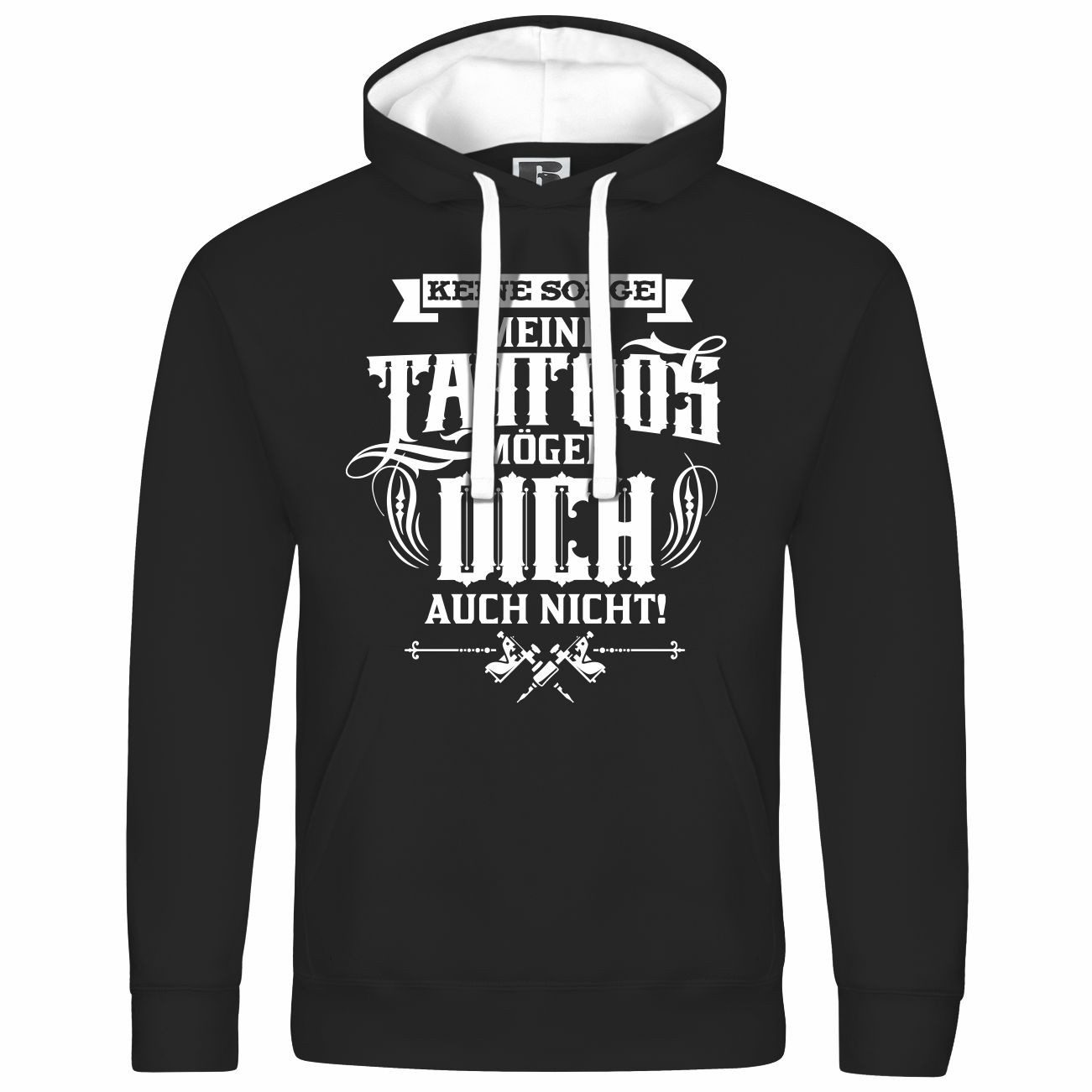 Der Kapuzenpullover zeigt das Statement „Keine Sorge, meine Tattoos mögen dich auch nicht!“ in auffälliger Schrift mit Tattoo-Elementen und zwei tätowierten Maschinen. Perfekt für Tattoo-