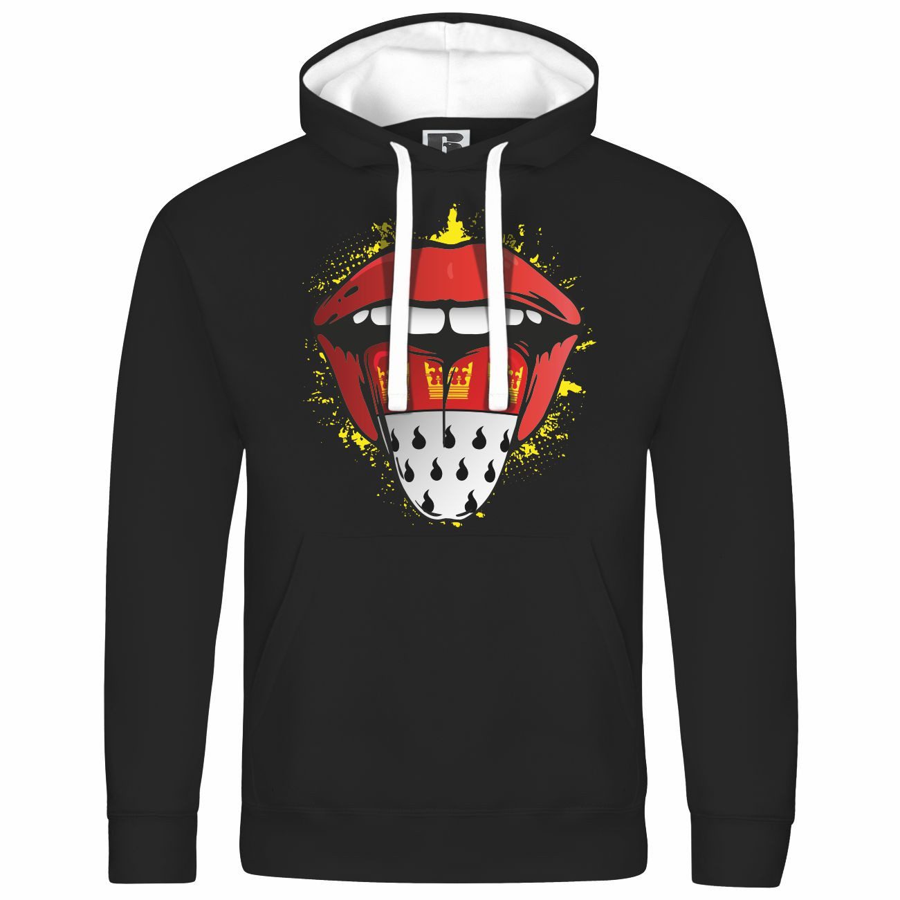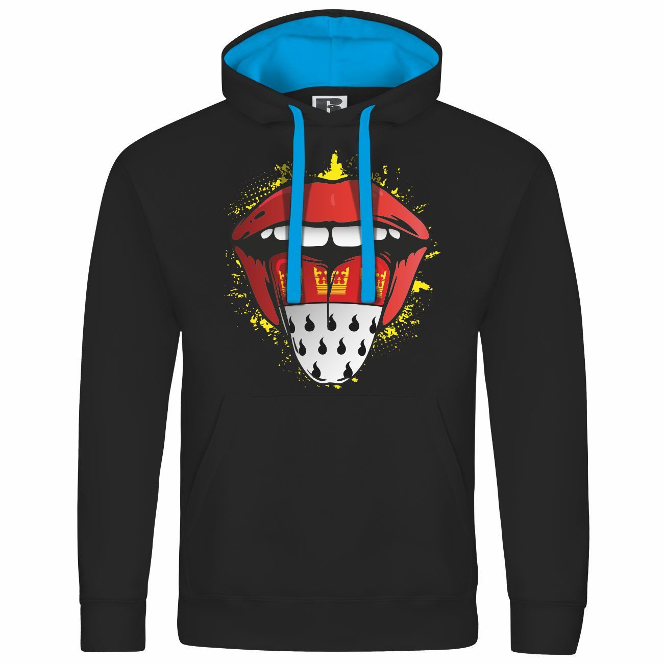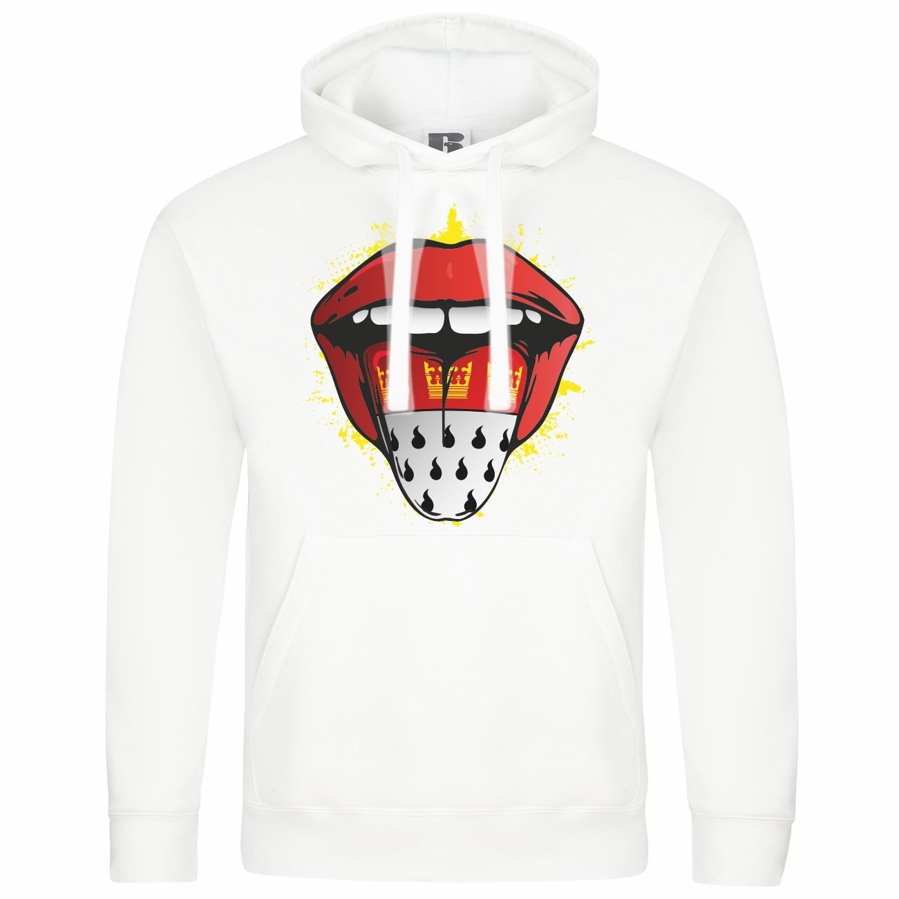 Der Kapuzenpullover zeigt ein auffälliges Motiv mit einem offenen Mund, dessen Zunge das Köln Wappen trägt. Umrahmt von leuchtenden Farben ist er perfekt für alle Köln-Fans, die auffallen wollen.