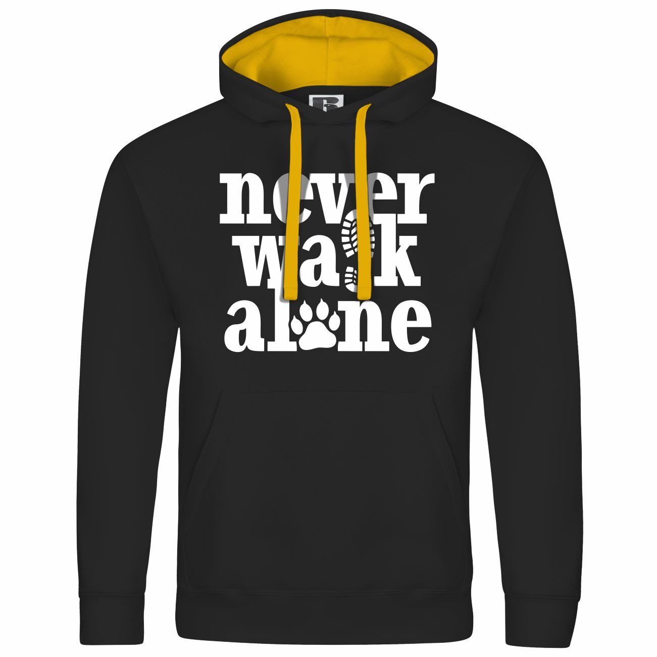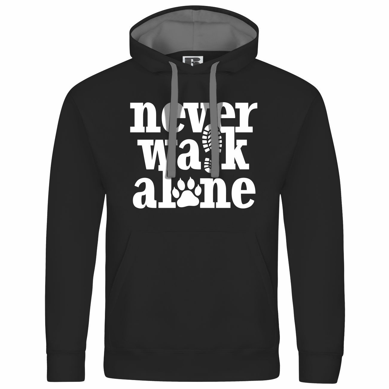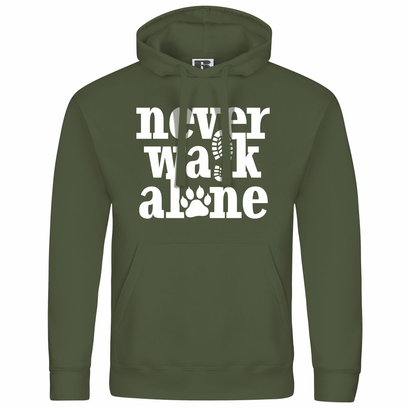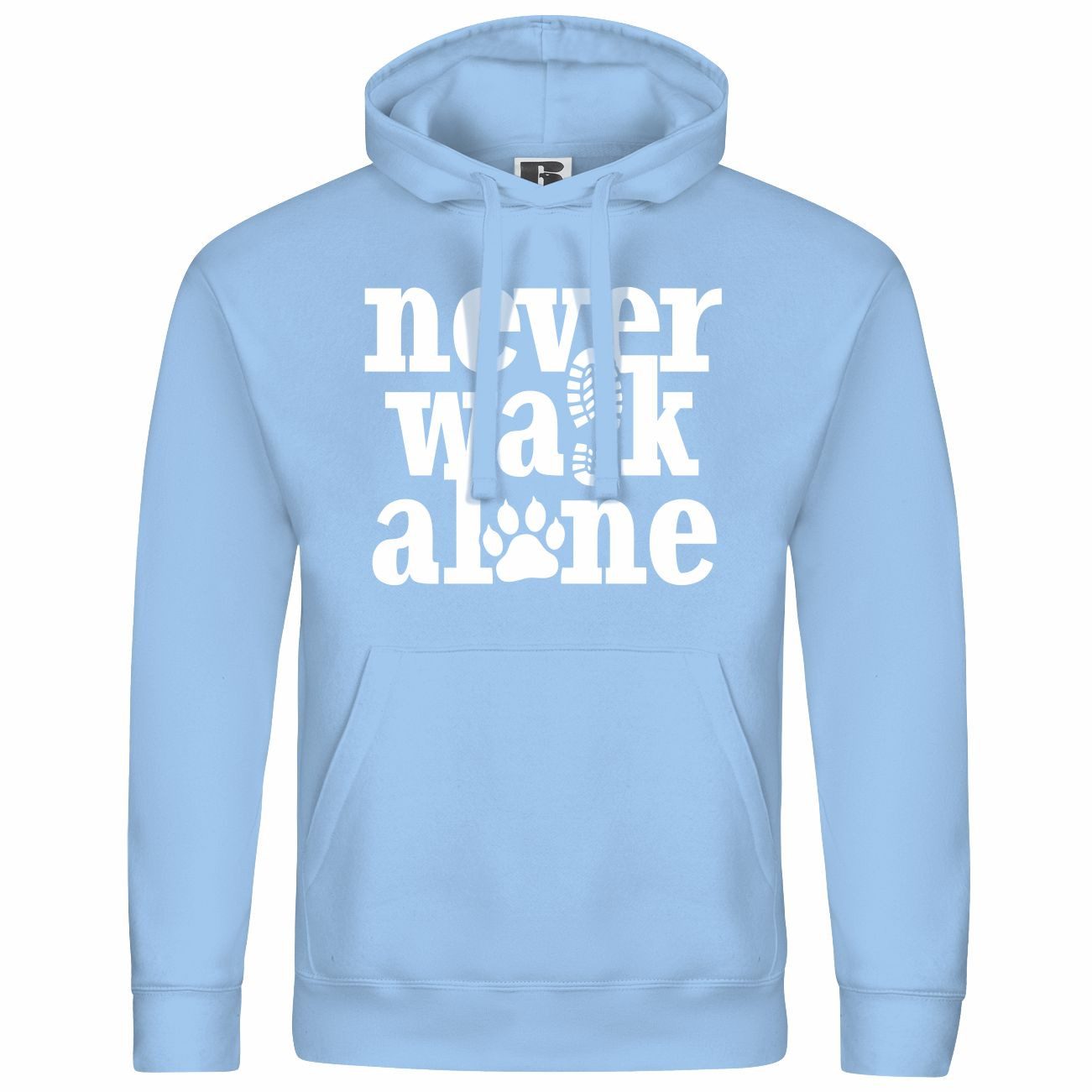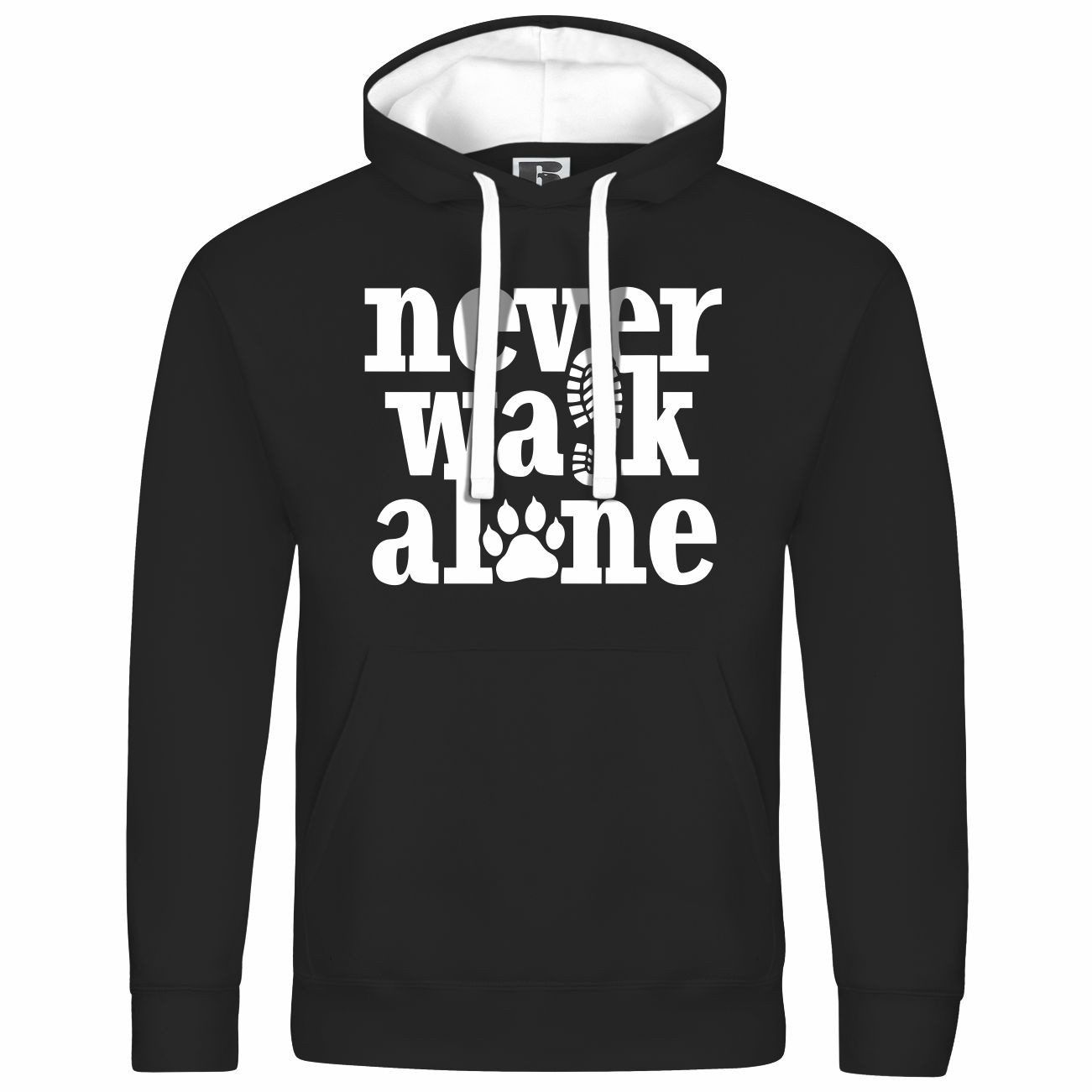 Dieser Kapuzenpullover zeigt den Schriftzug „Never Walk Alone“ mit einem Pfotenabdruck und einem Schuhabdruck. Perfekt für Hundebesitzer, die ihre enge Verbindung zu ihrem vierbeinigen Freund zeigen möchten!