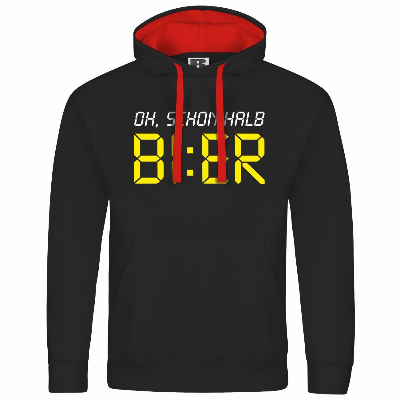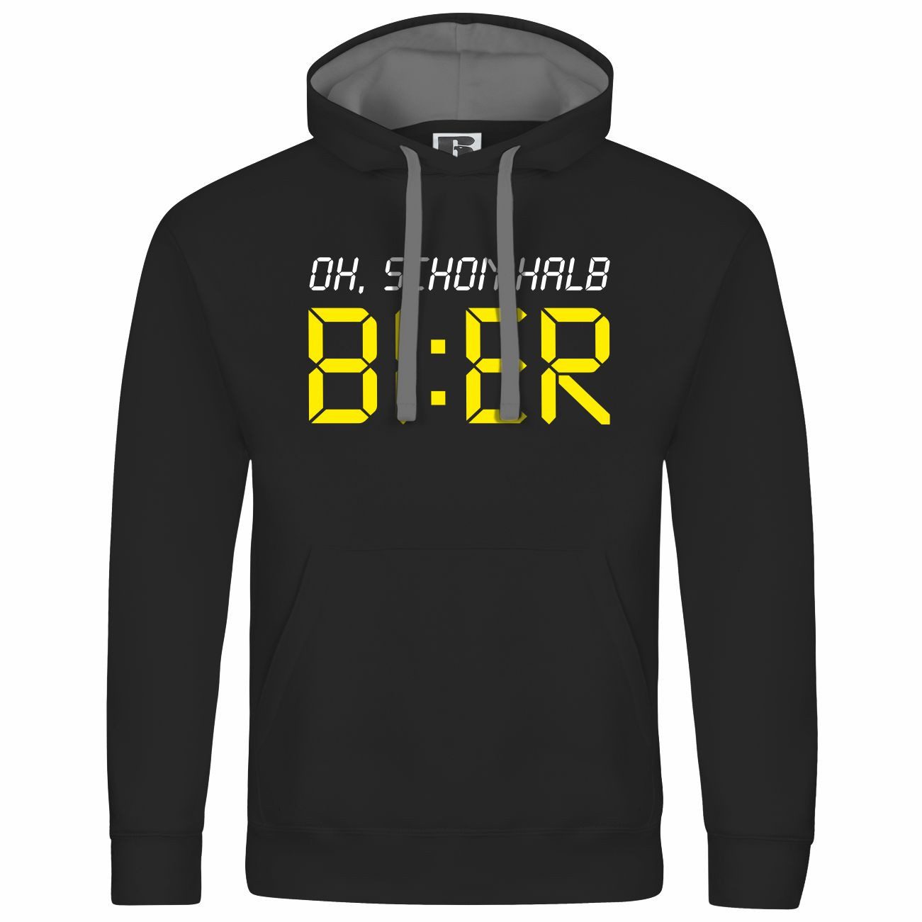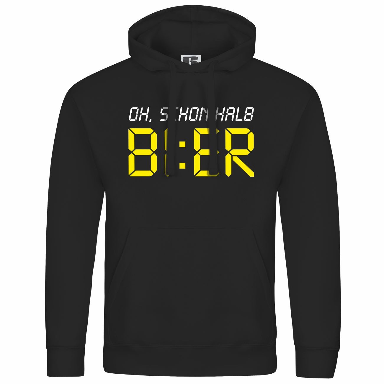 Dieser Kapuzenpullover zeigt das humorvolle Motiv „Oh, schon halb BI