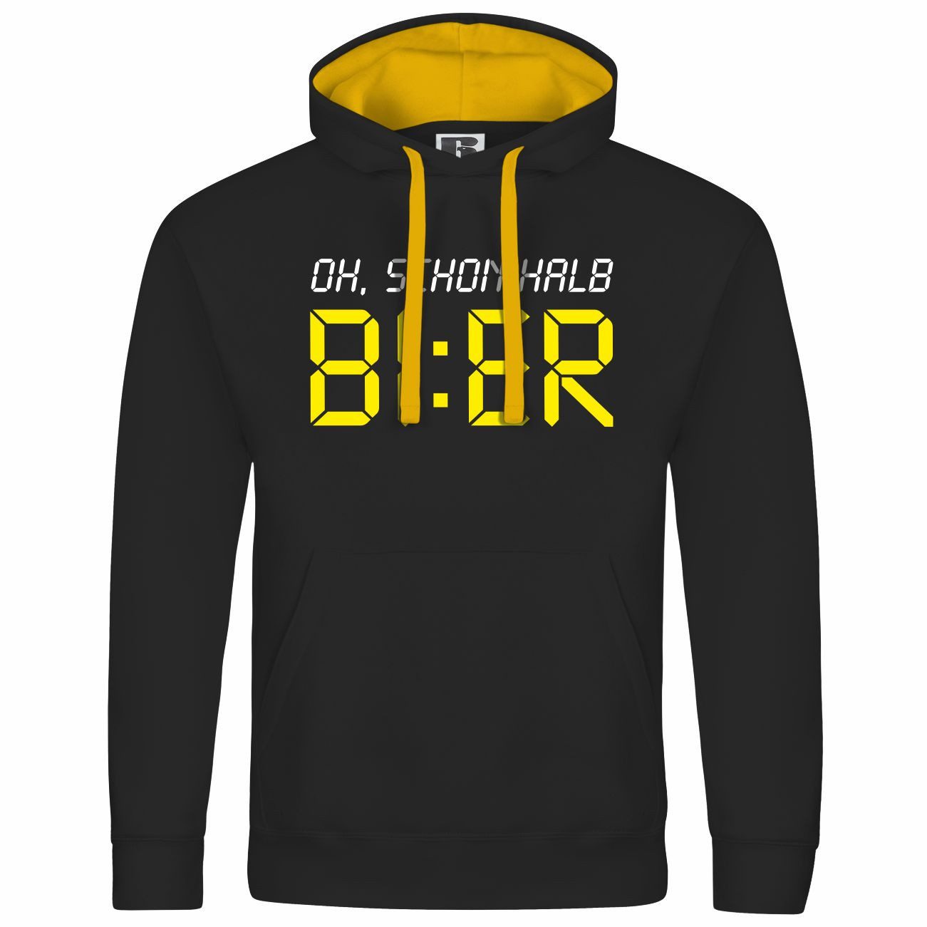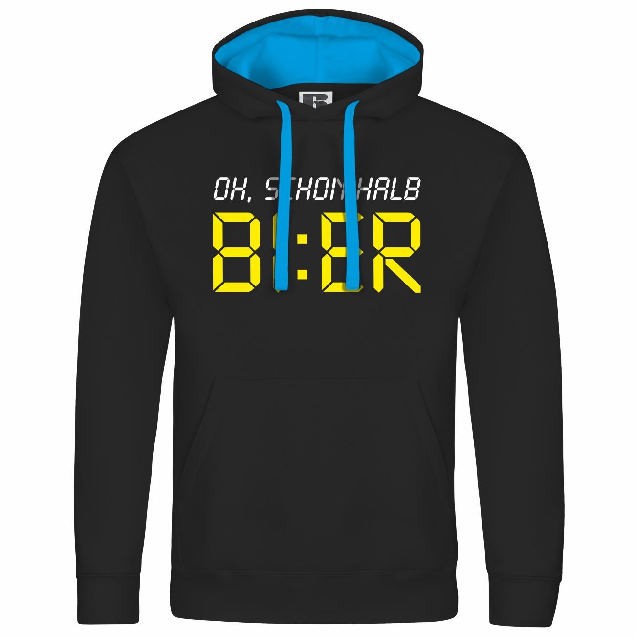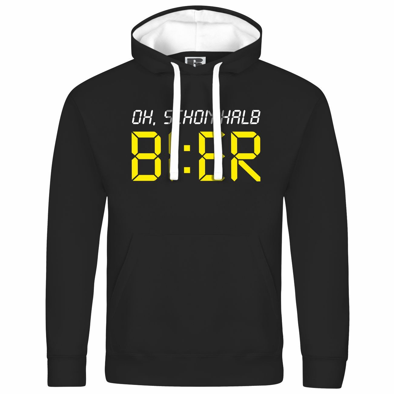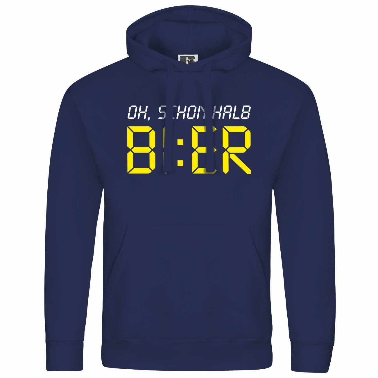 Dieser Kapuzenpullover zeigt das humorvolle Motiv „Oh, schon halb BI