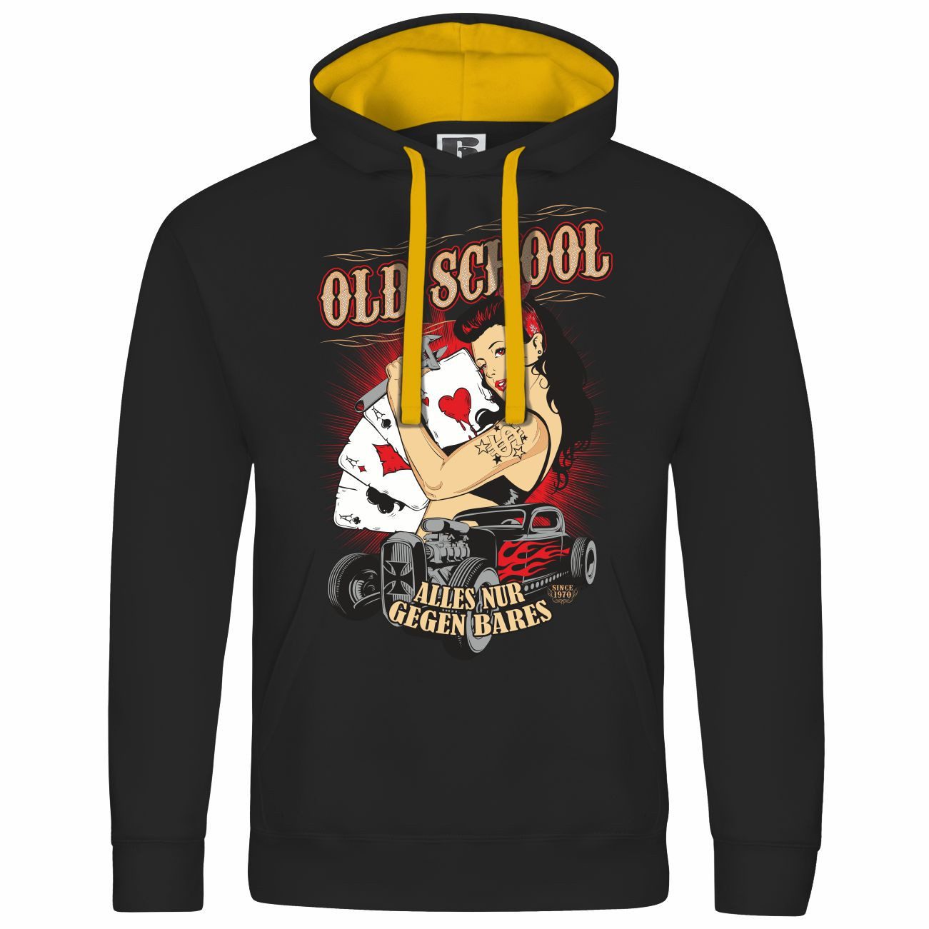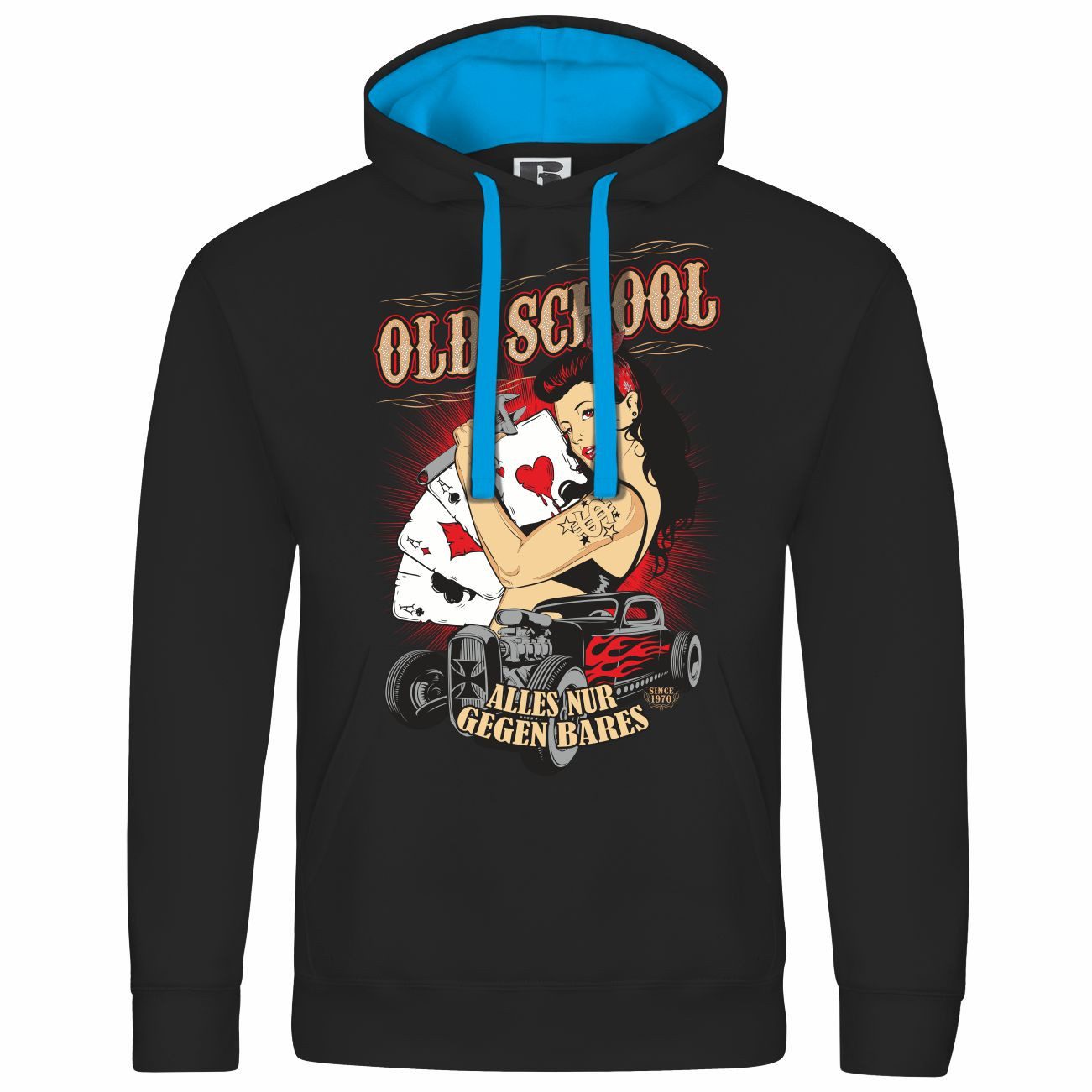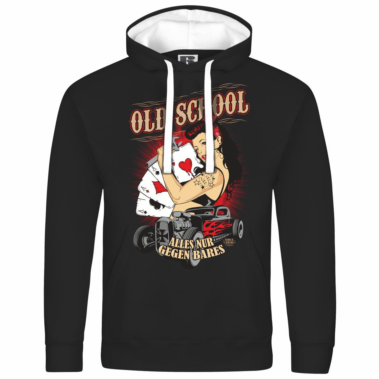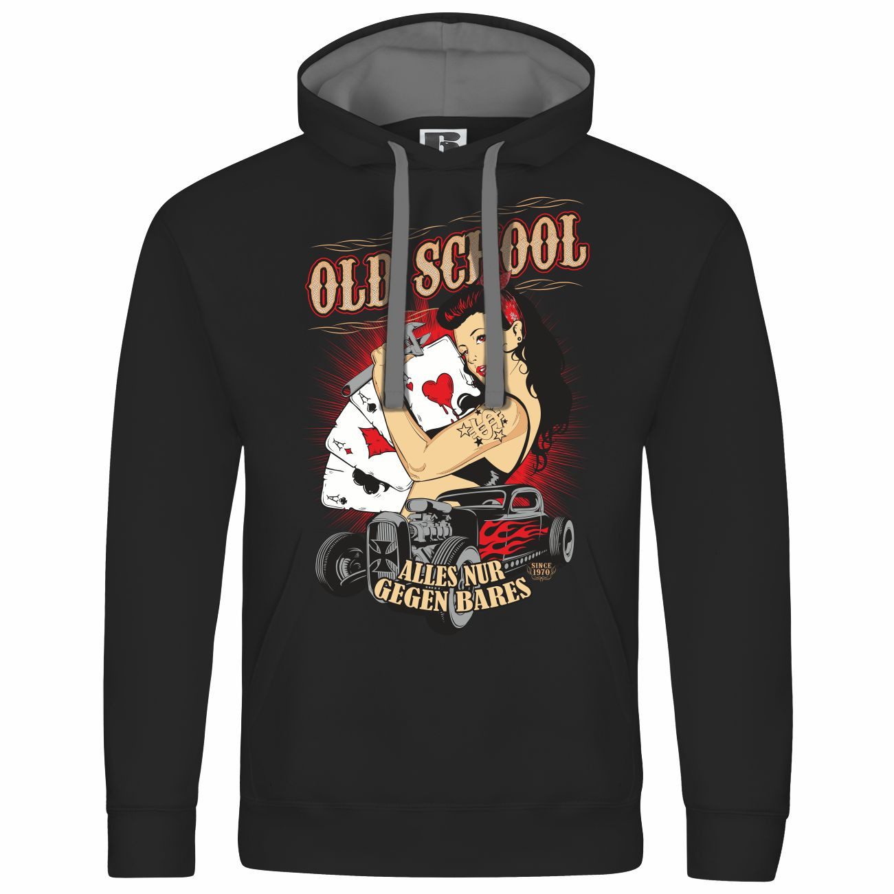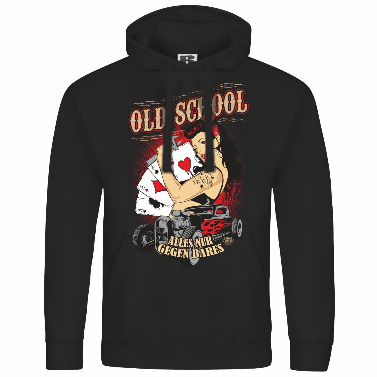 Dieser Kapuzenpullover zeigt ein Oldschool Motiv mit einer Pin-up-Girl-Illustration, Spielkarten, Hotrod und dem Schriftzug „Всеs nur gegen Bares“. Perfekt für Fans des Vintage- und Rockabilly-Stils!