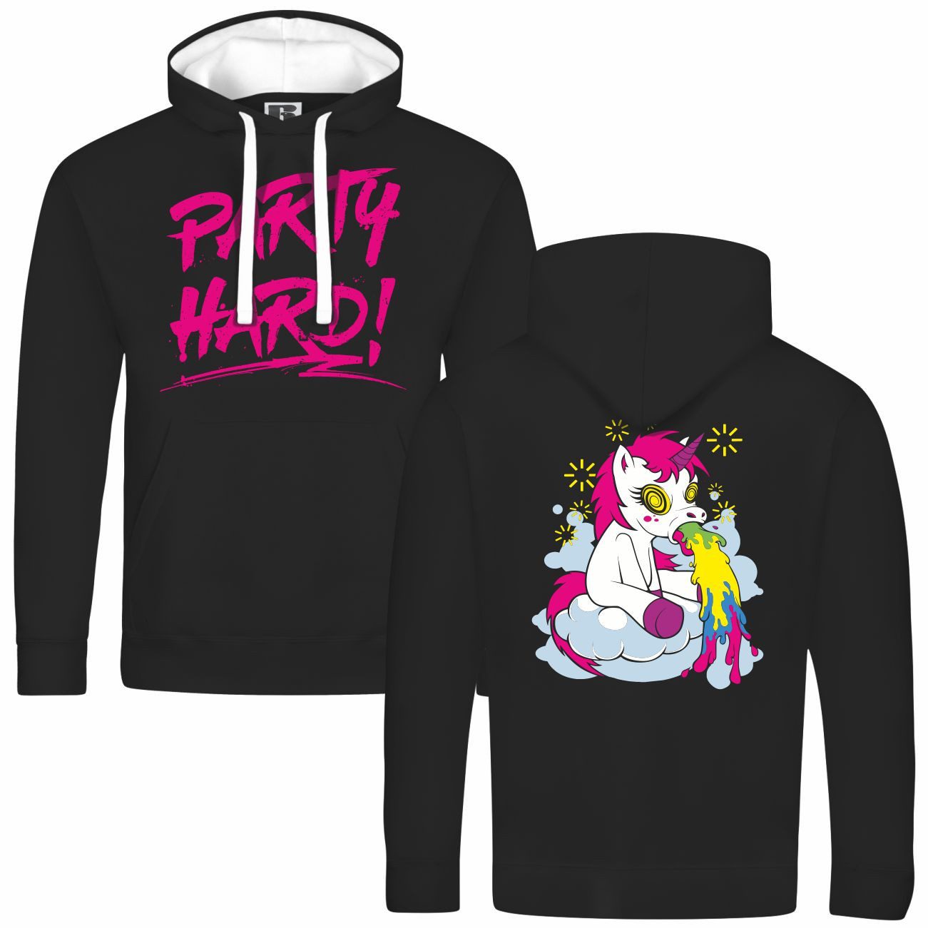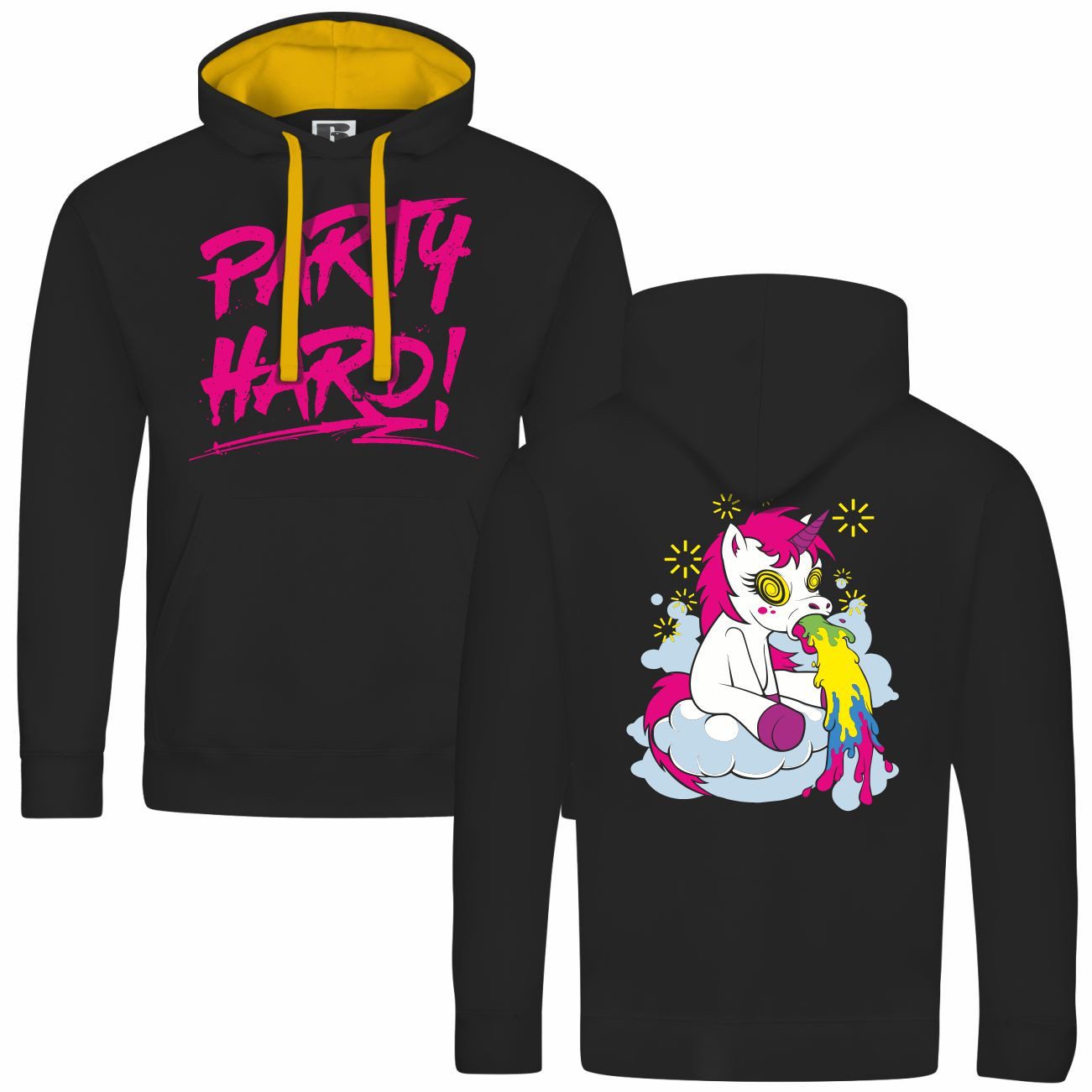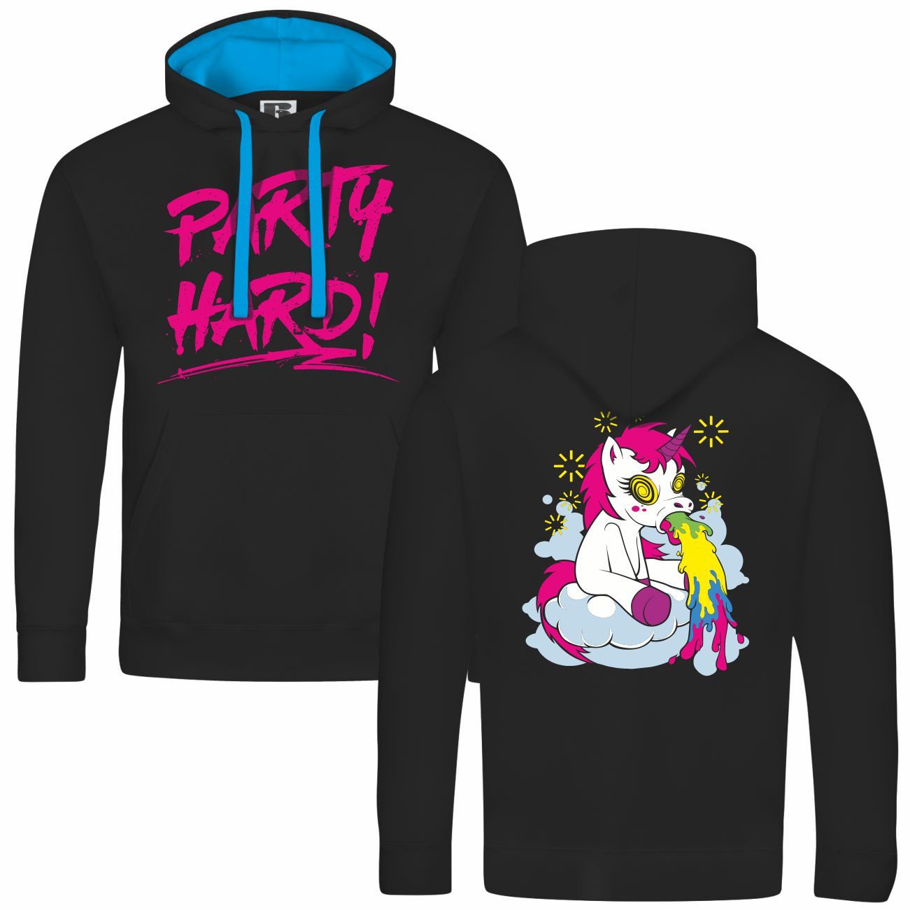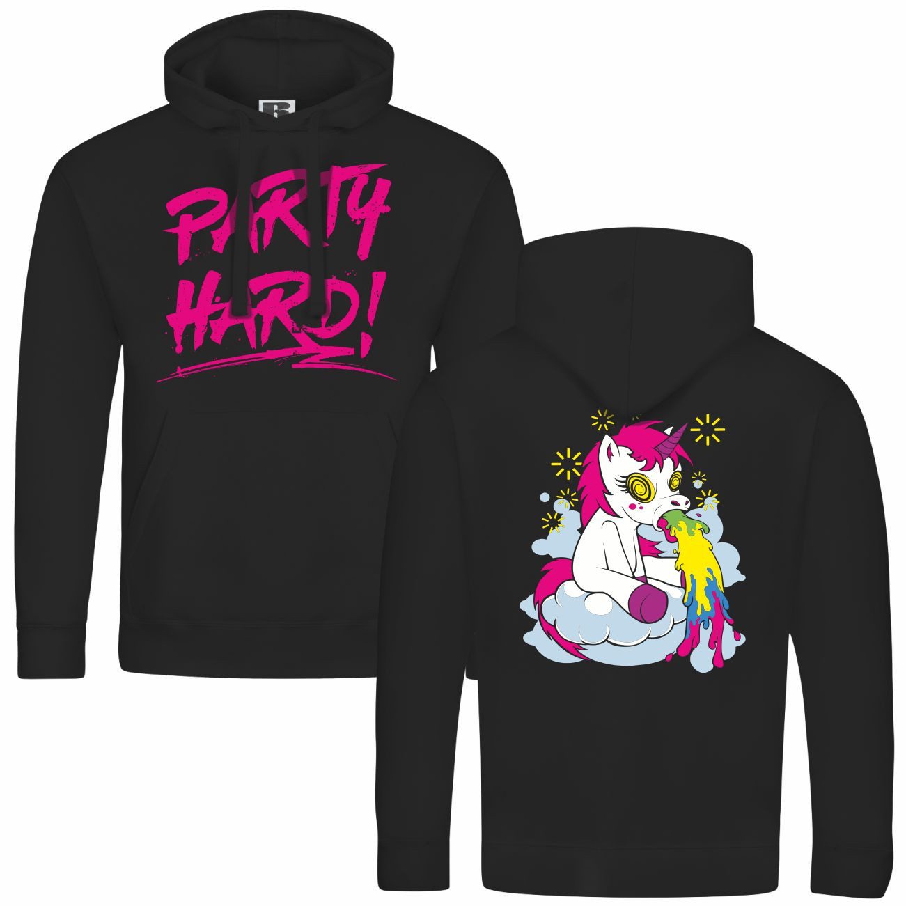 Dieser Kapuzenpullover zeigt vorn den Schriftzug „Party Hard!“ und hinten ein verrücktes Party Einhorn, das Regenbogenfarben speit. Perfekt für Festivals, Raves und alle Einhorn-Fans!