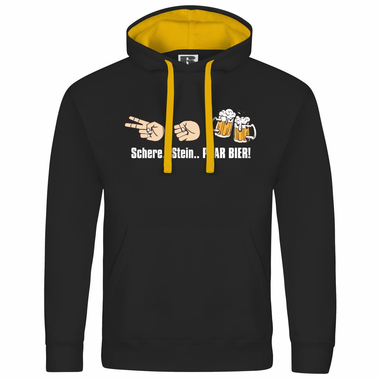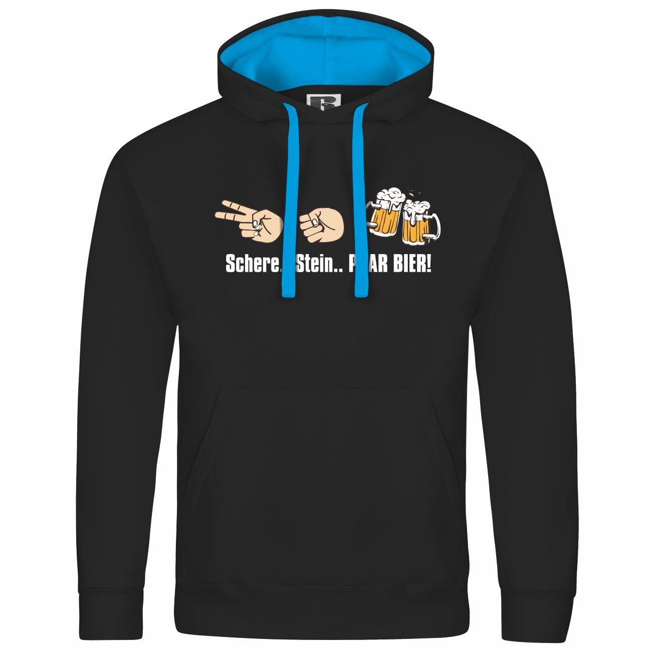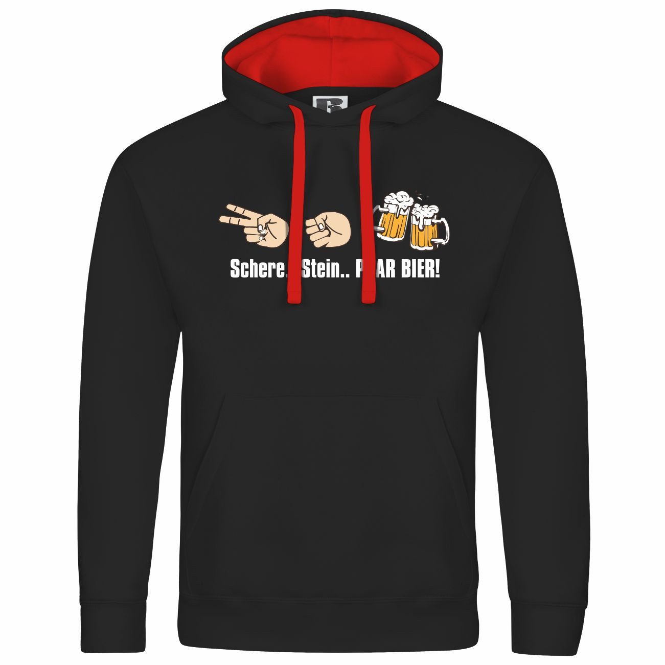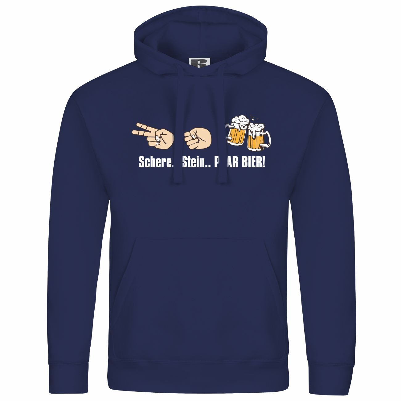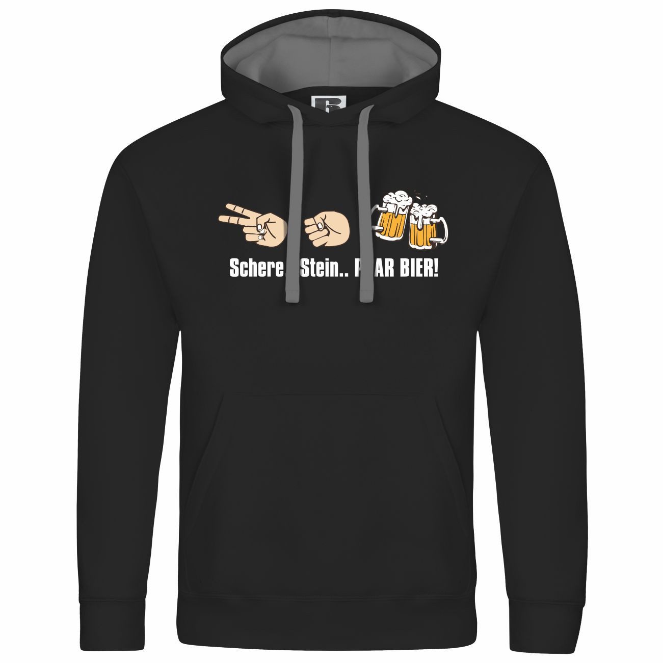 Das Motiv auf dem Kapuzenpullover zeigt die Handzeichen für "Schere, Stein" gefolgt von Bierkrügen und dem humorvollen Spruch „Schere, Stein.. Paar Bier!“. Perfekt für Bierliebhaber und Partys!
